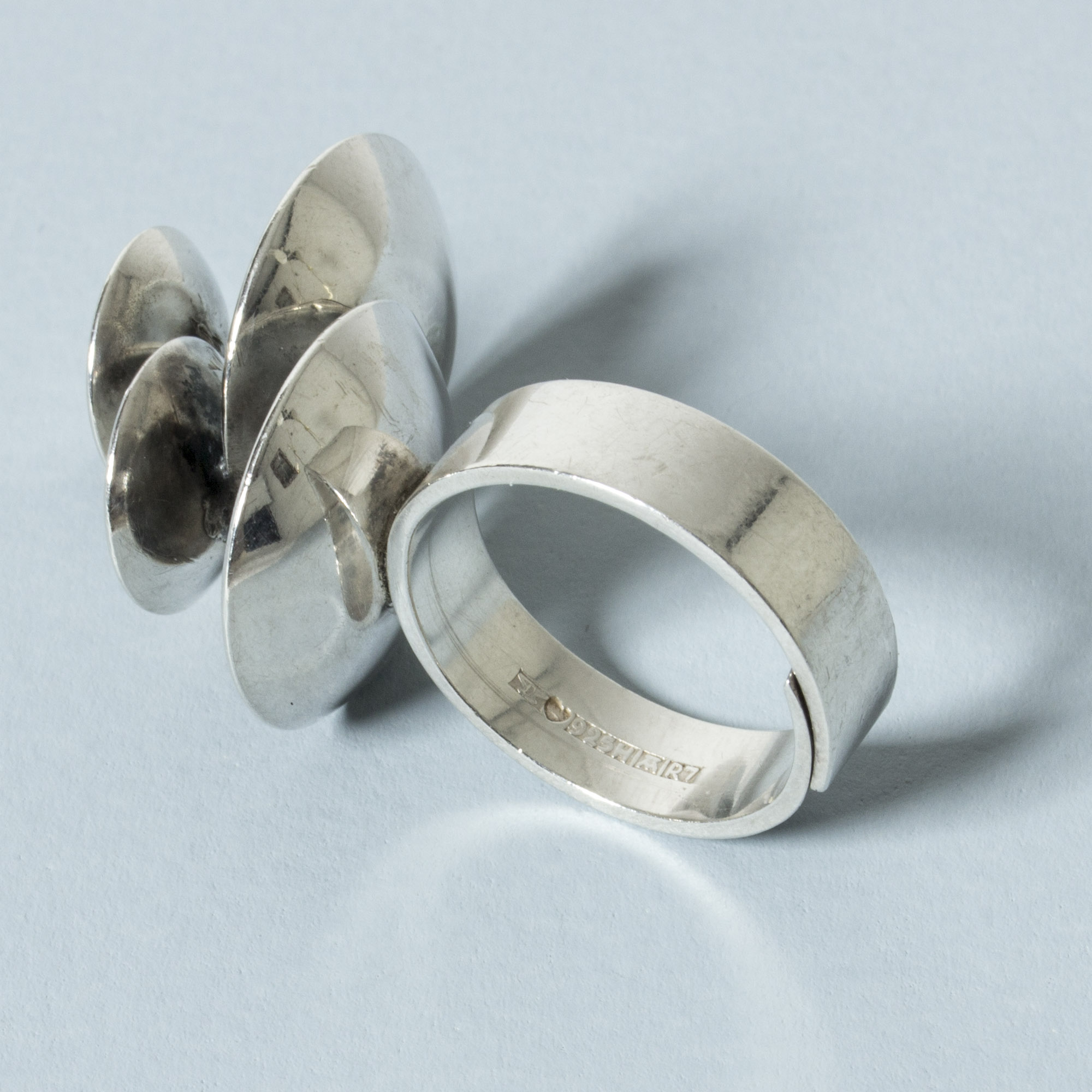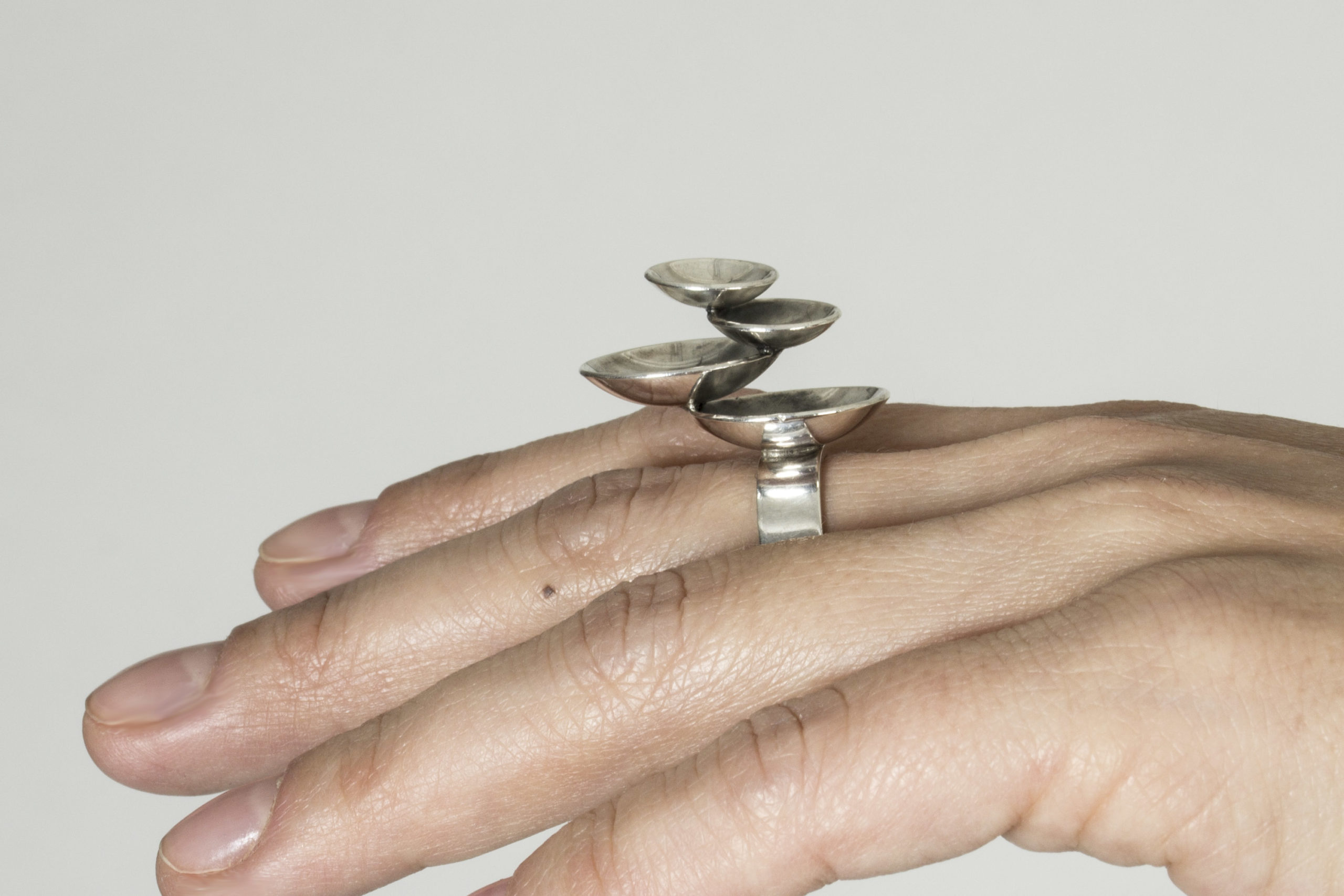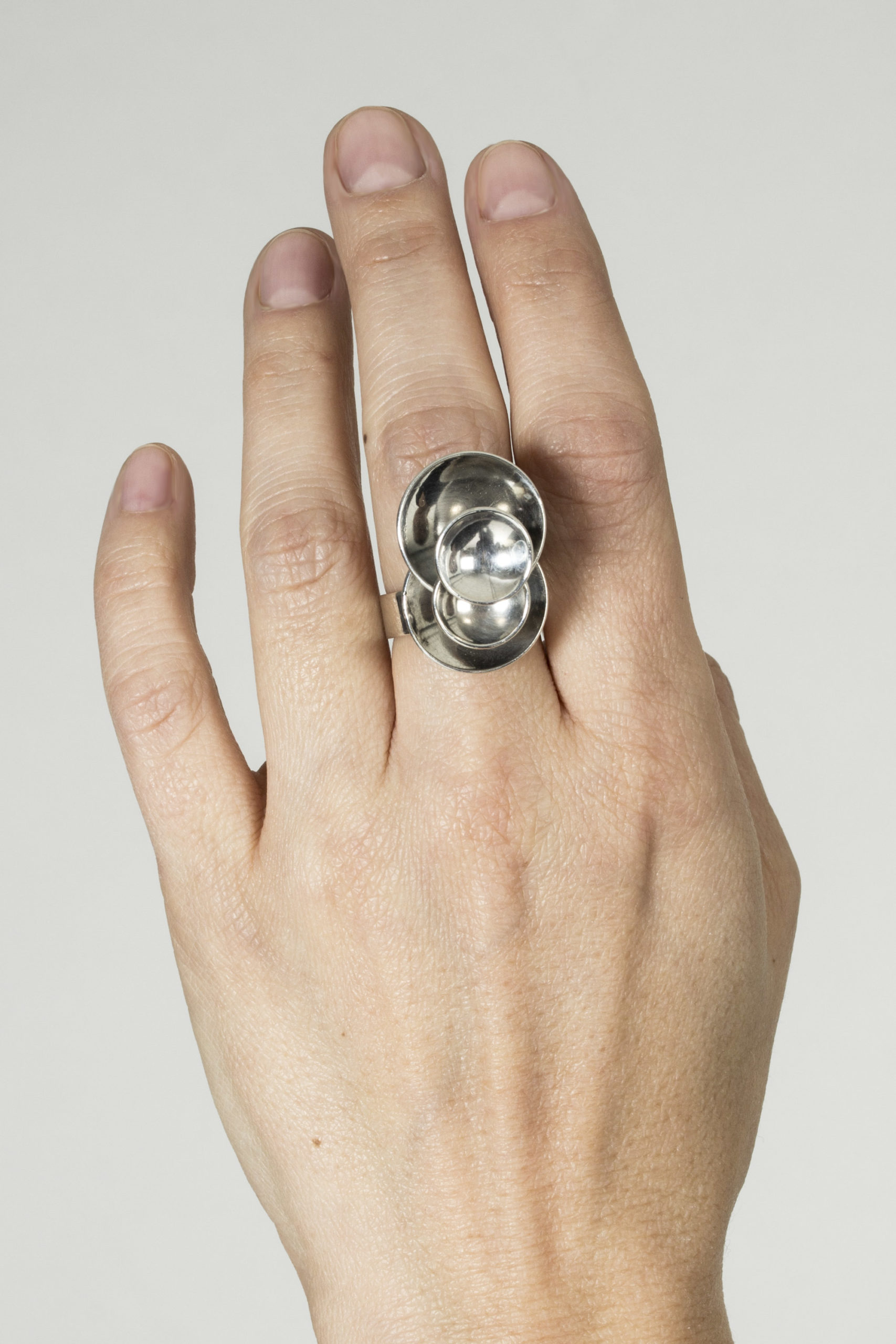Silver ring by Elis Kauppi in a wonderful, architectonic design of concave spheres building upwards. A small sculpture that plays with perspective!