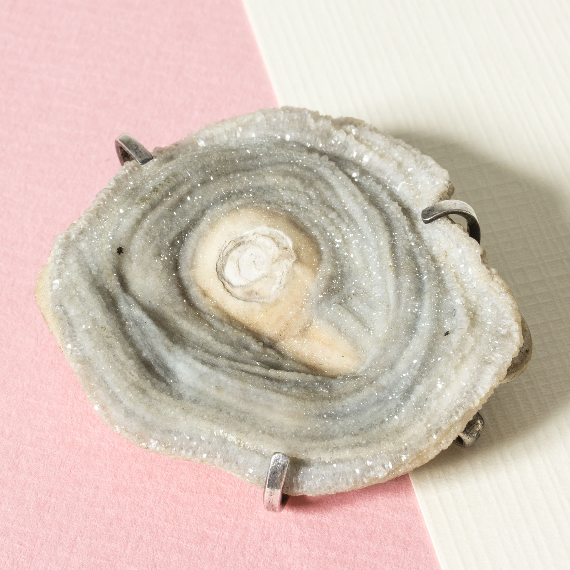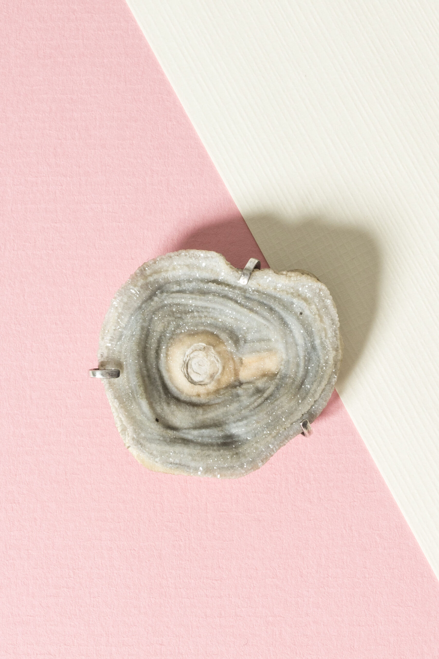 About the artist: Inga-Britt “Ibe” Dahlquist (1924-1996) was one of Sweden’s foremost modernist silversmiths. She had her breakthrough in the 1950s with modernist and profoundly organic silver jewelry combined with local natural elements such as fossils and stones. Dahlquist also worked for Georg Jensen from 1965 and onwards, creating pieces that were more strictly modernist, however with organic expressions that resonated with her work in her own studio. Ibe Dahlquist shared a studio in Visby on the island of Gotland with fellow silversmith Olof Barve for several decades. Barve often executed the jewelry while Dahlquist focused on the designs.