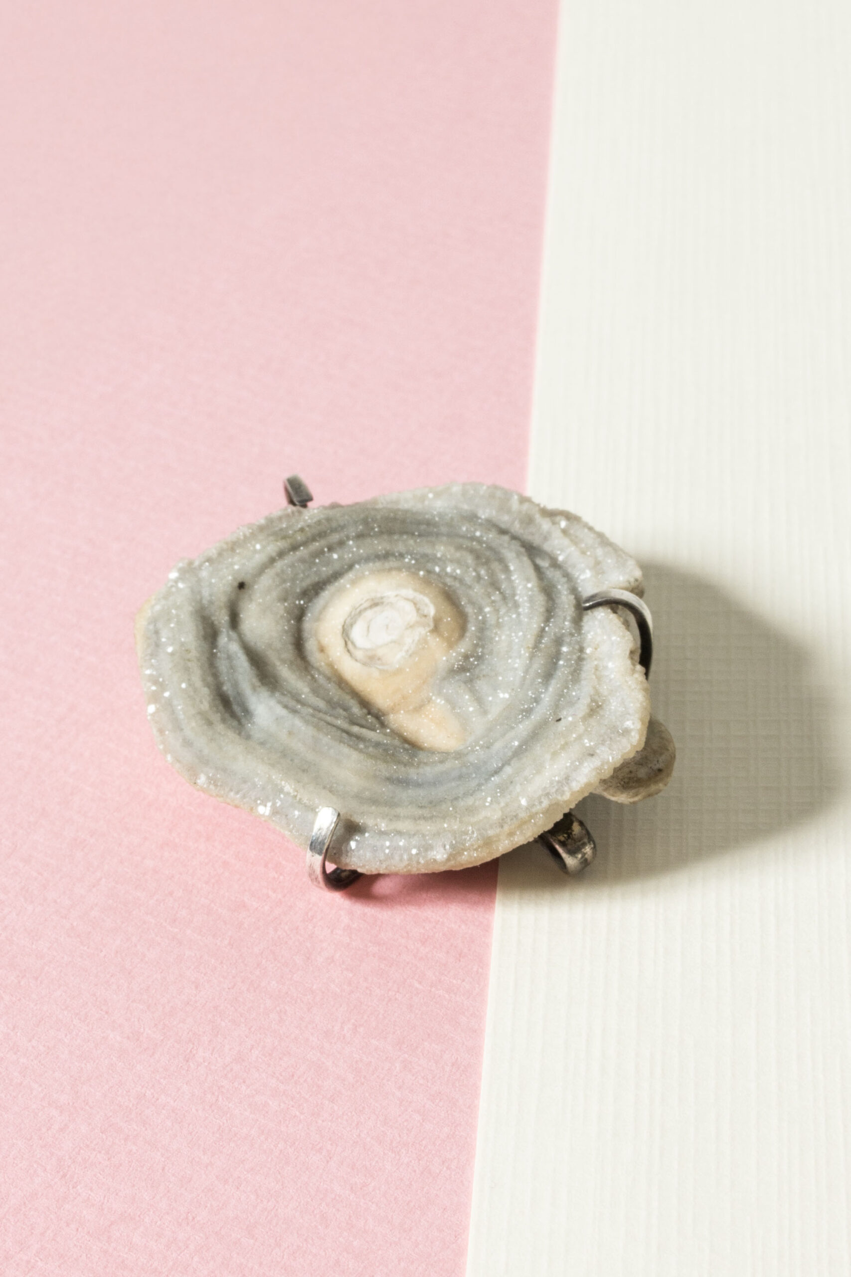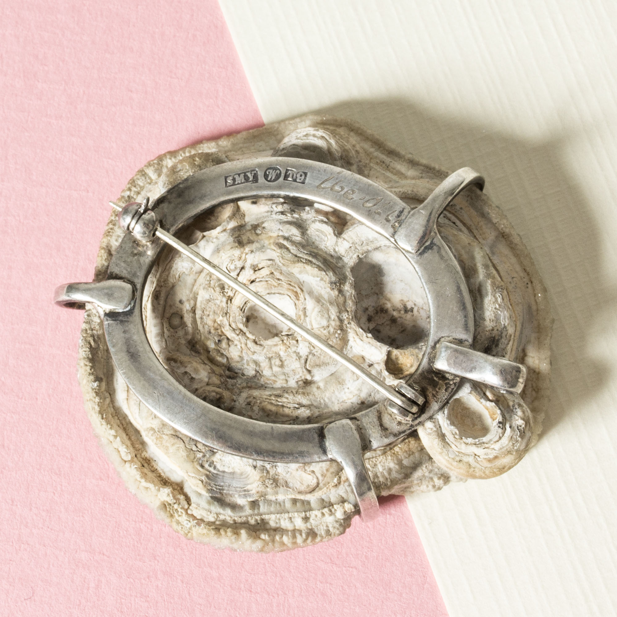 Beautiful silver brooch by Ibe Dahlquist, with a fossil with subtle glimmer. Imaginative and organic, reminiscent of an oyster.