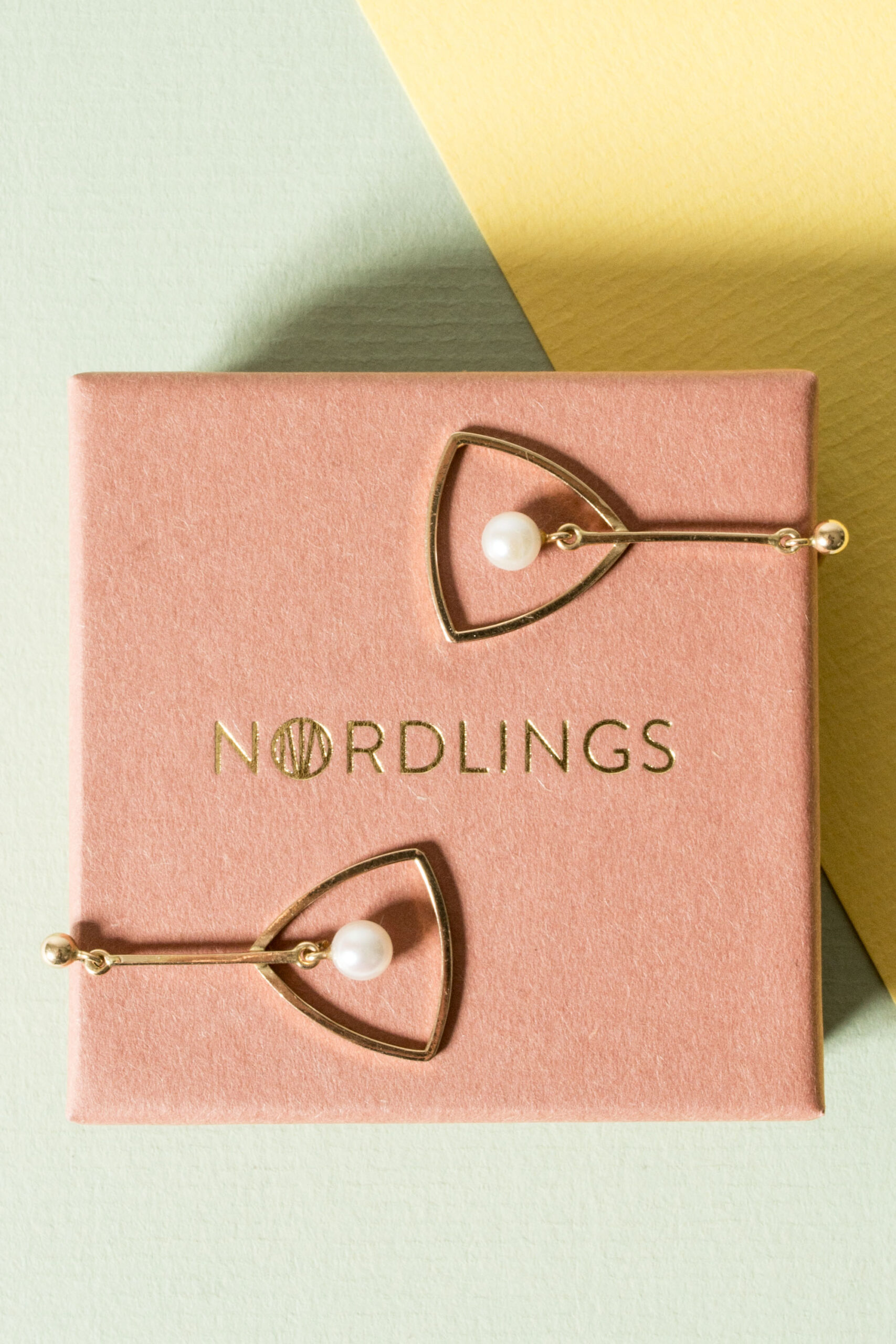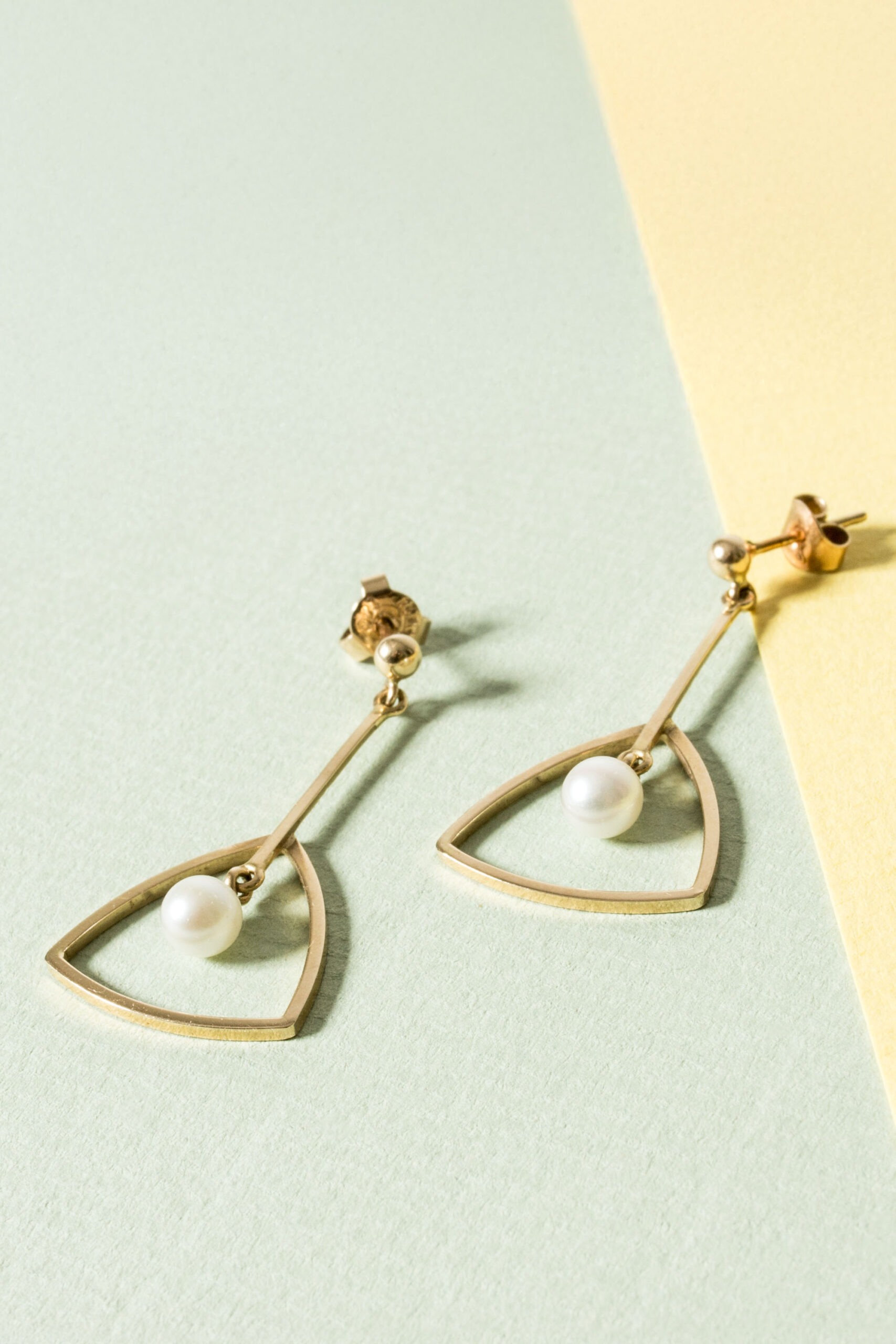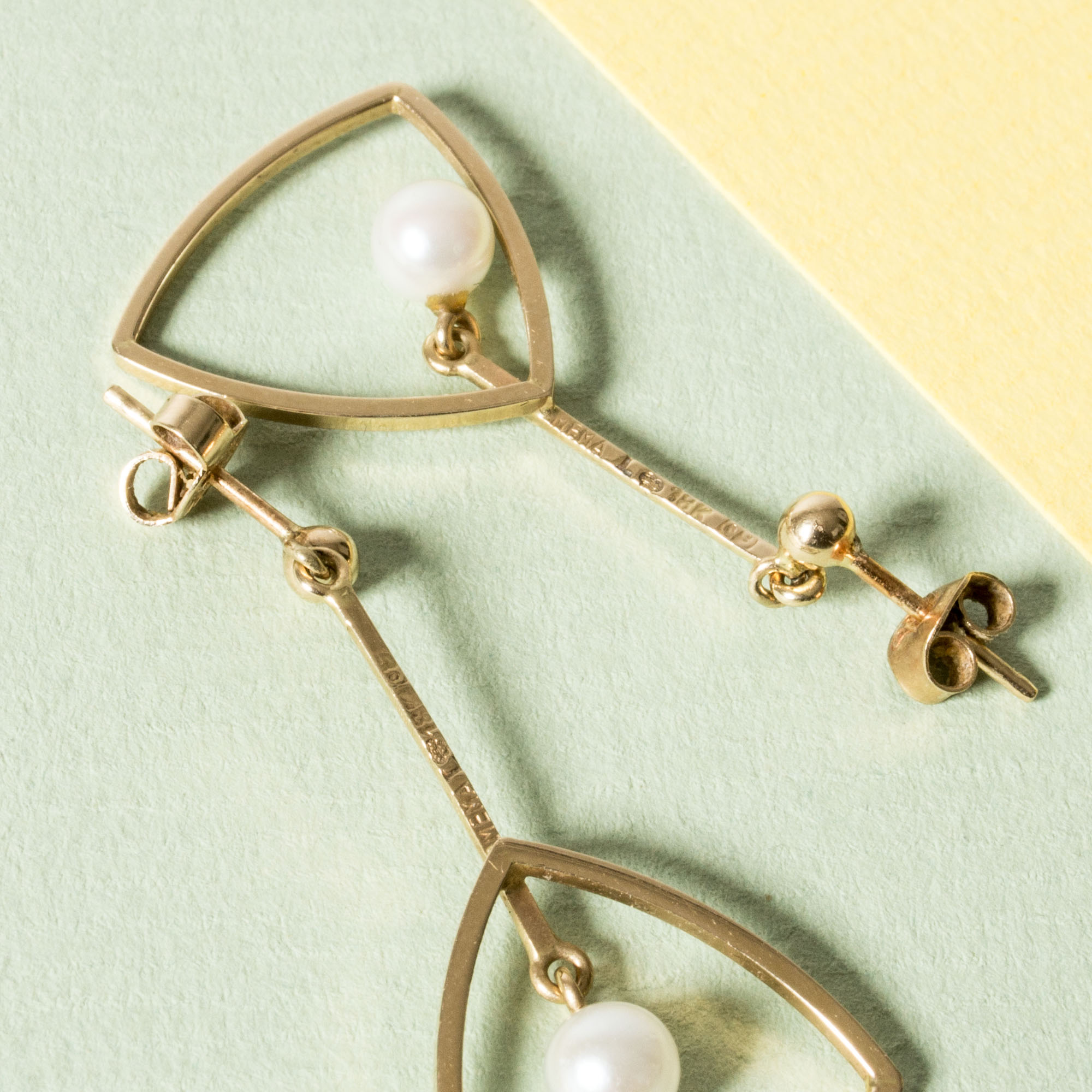 Lovely gold earrings from Mema, with a graphic look. Cultured pearls hang inside the triangle forms.