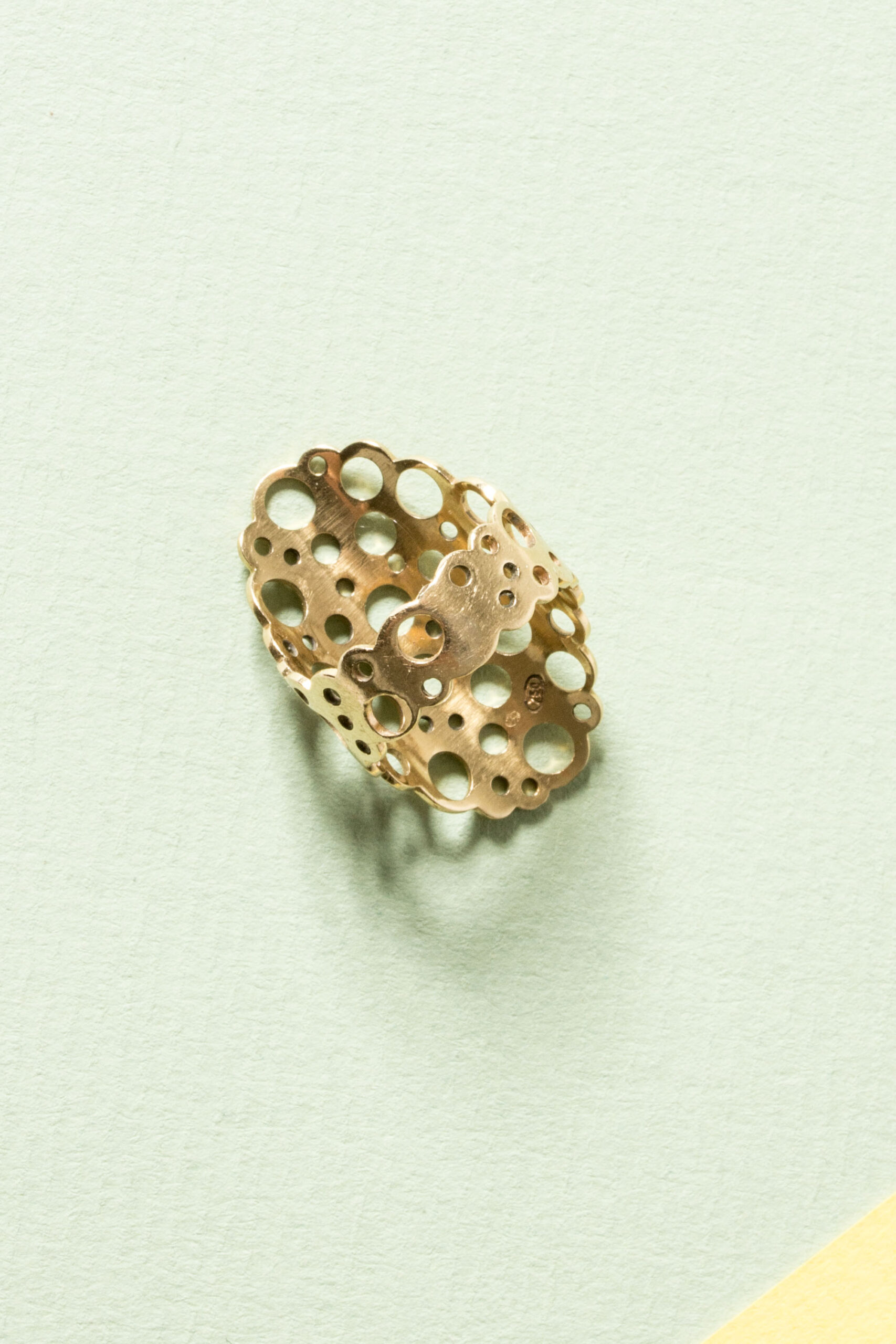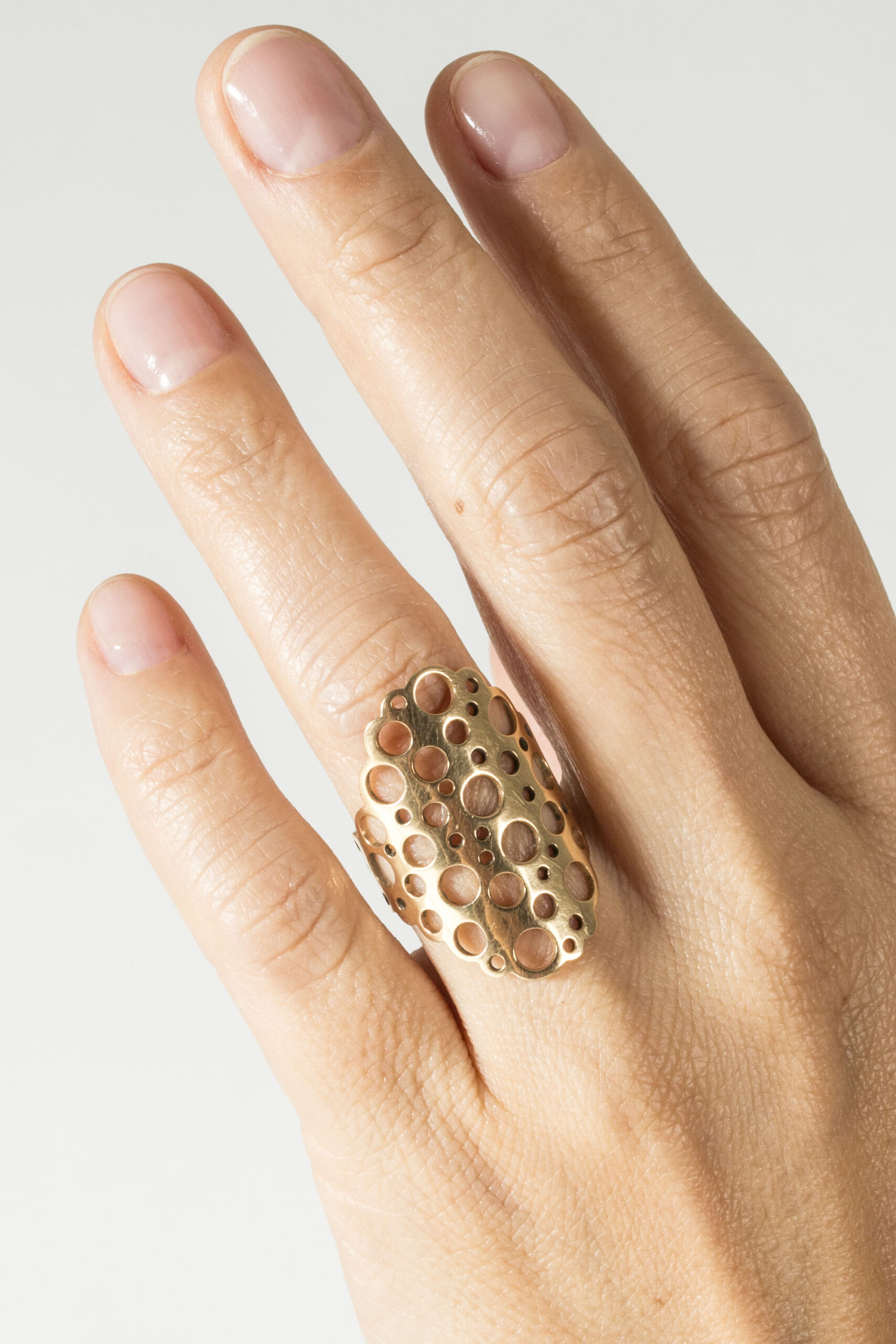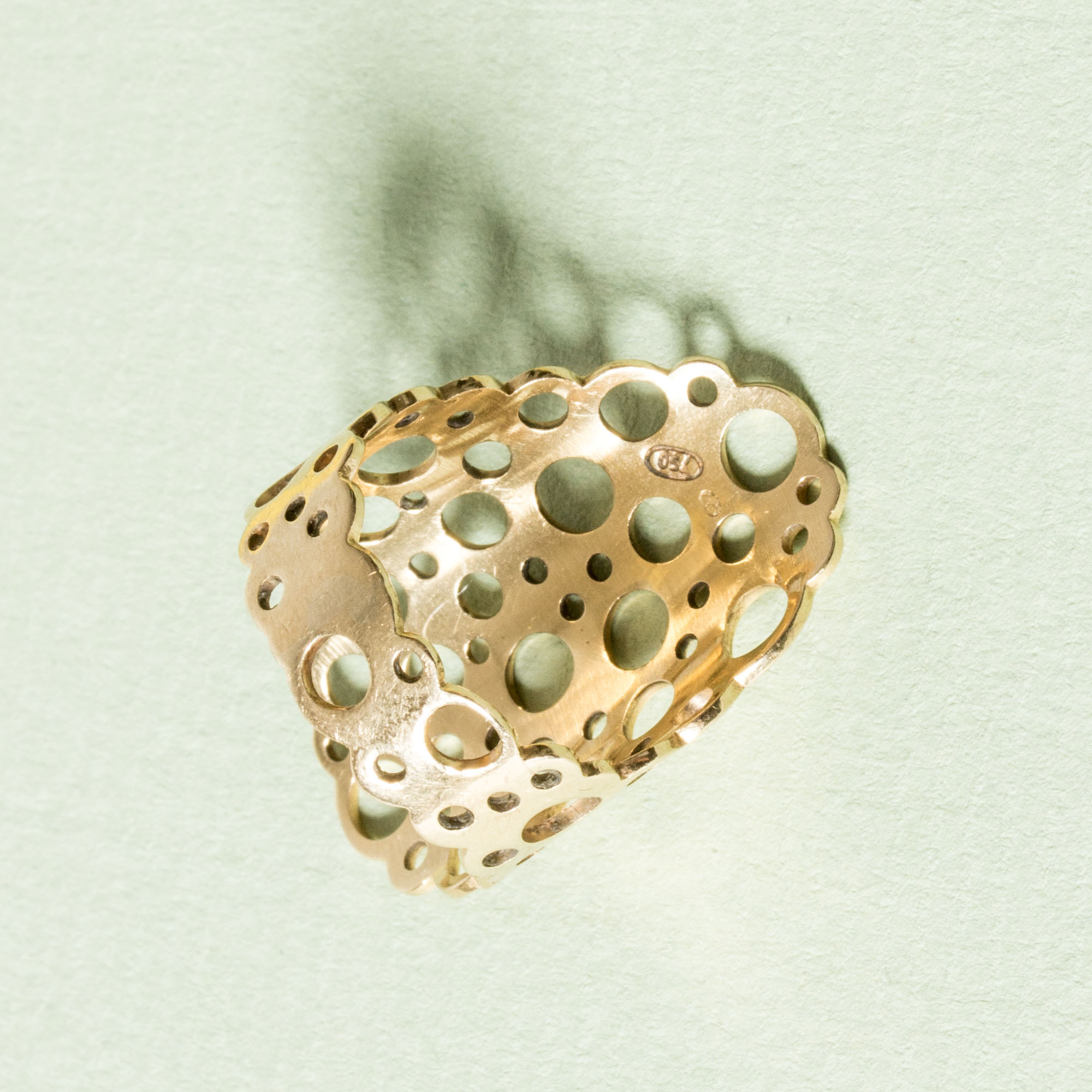 Amazing gold “Pitsi” ring by Liisa Vitali. Expressive, large and easily wearable design with Vitali’s signature pattern of punched out holes.