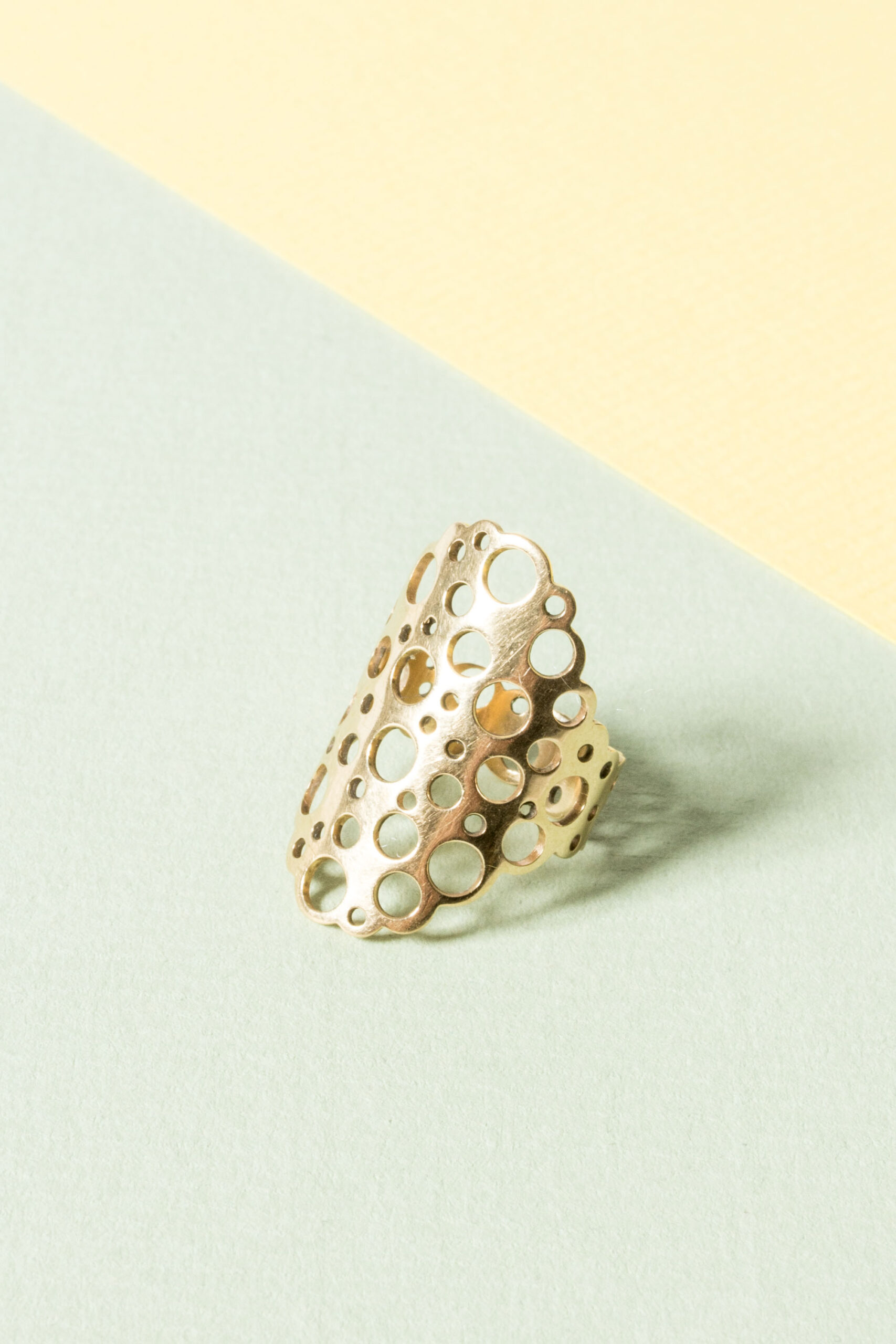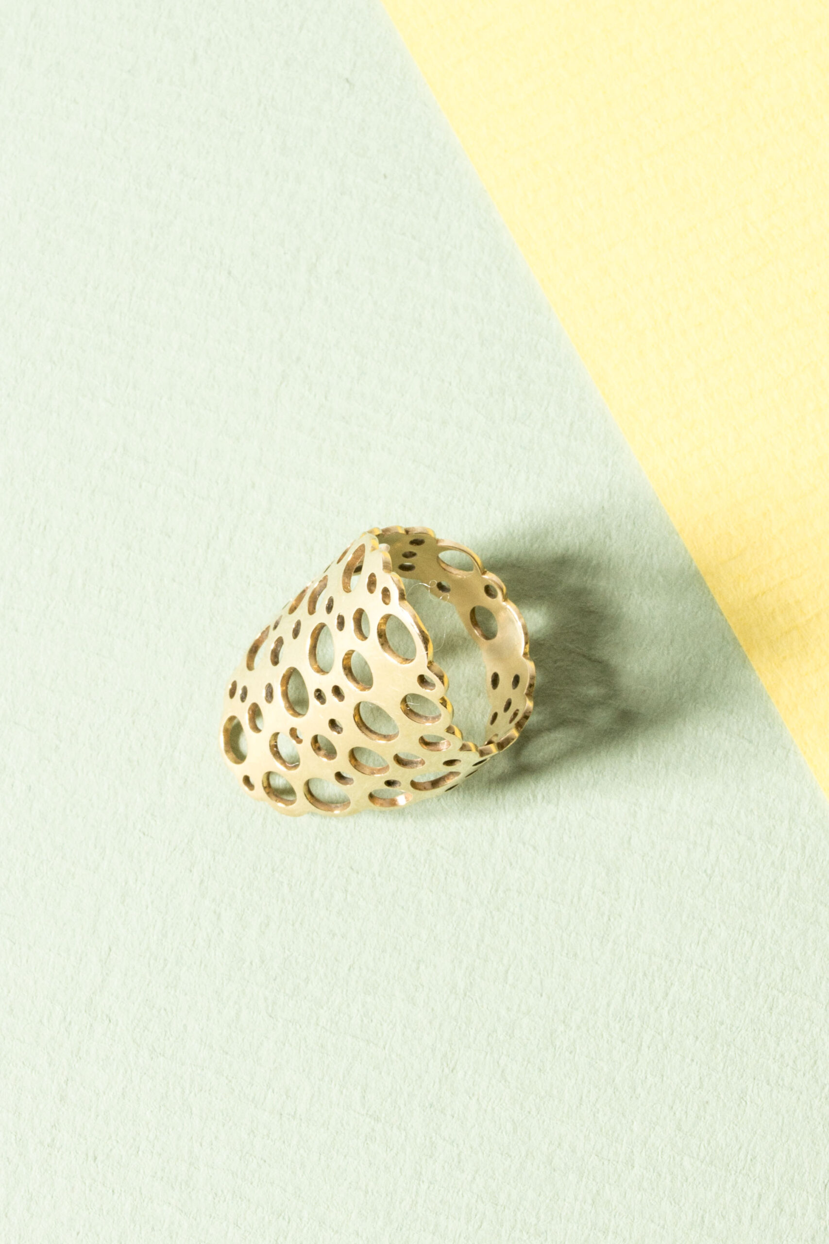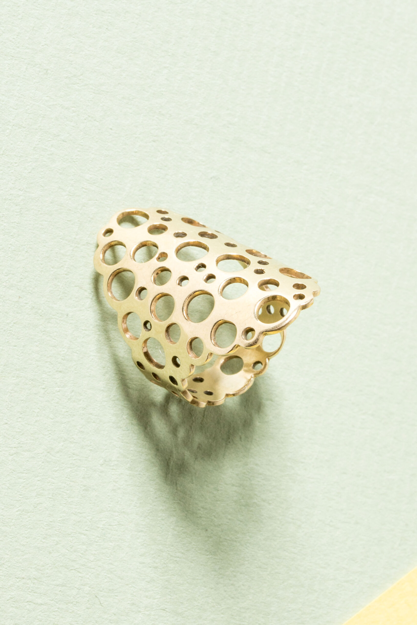 Amazing gold “Pitsi” ring by Liisa Vitali. Expressive, large and easily wearable design with Vitali’s signature pattern of punched out holes.