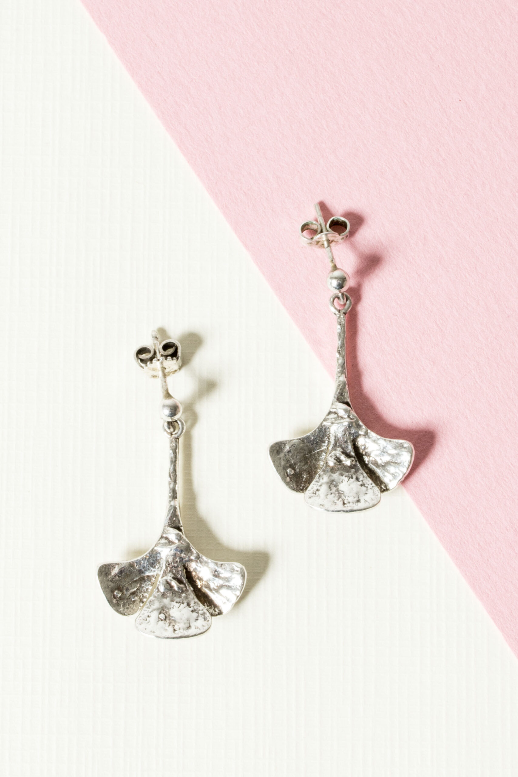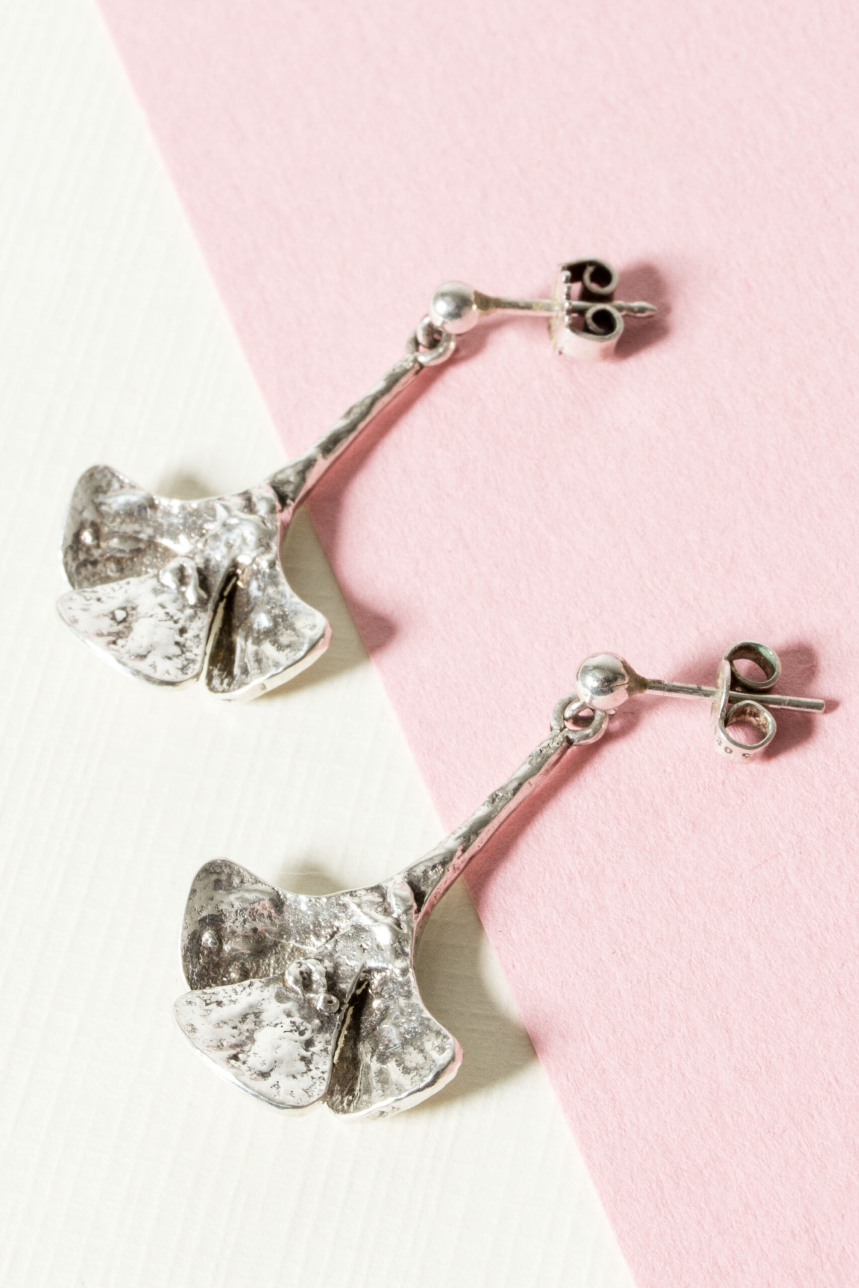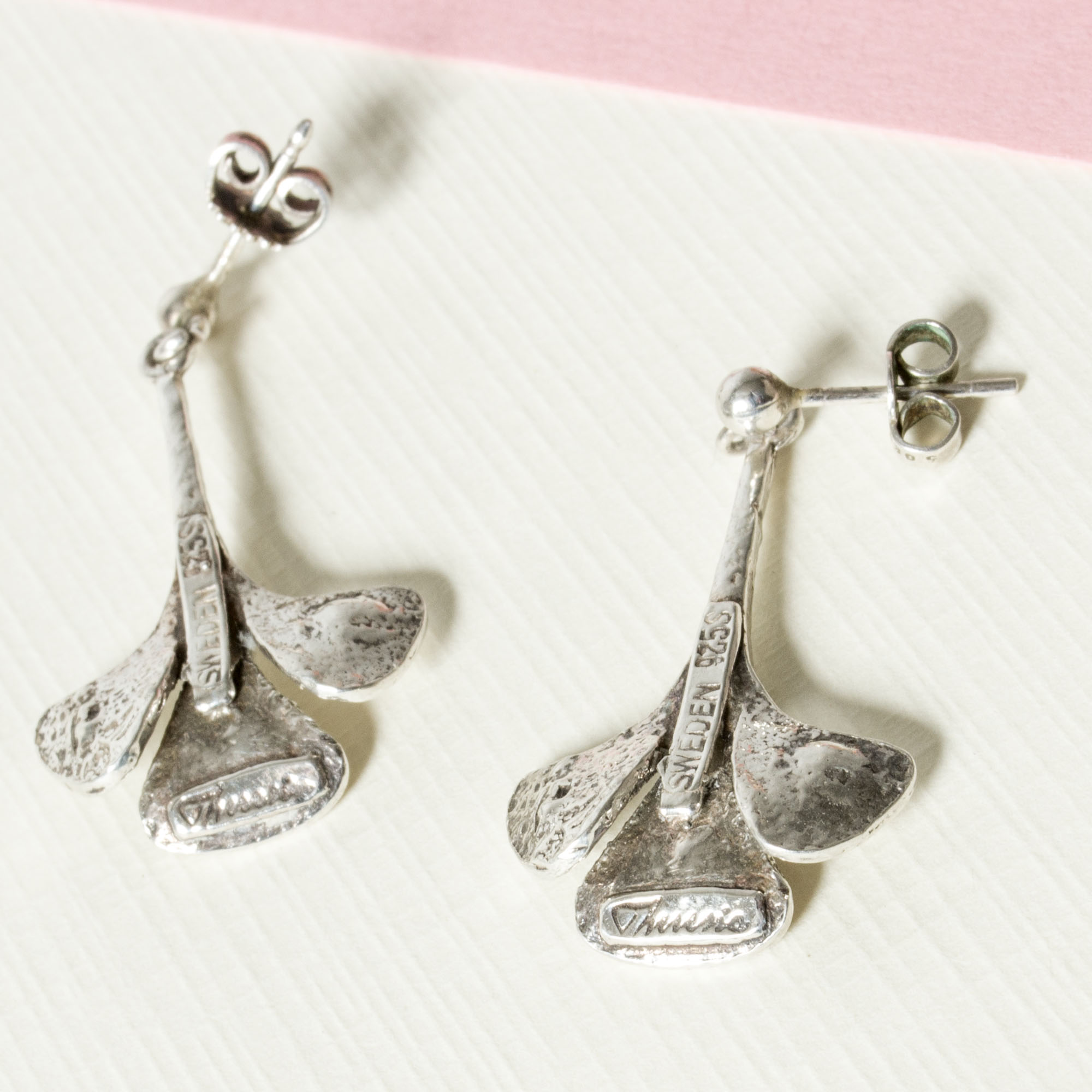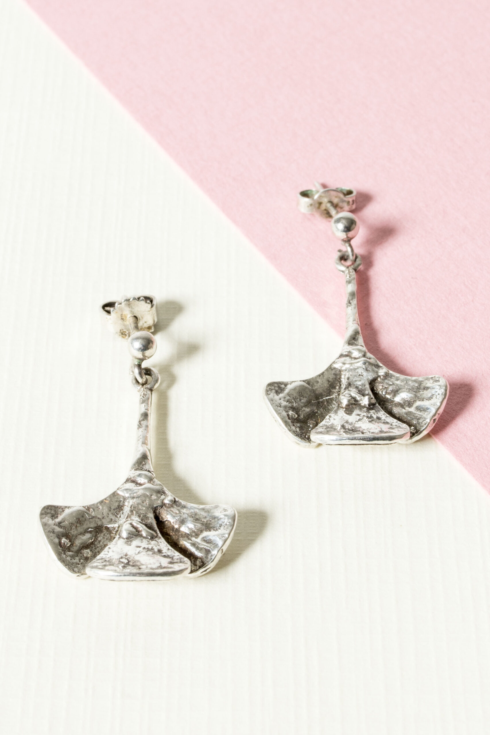 Pair of lovely silver earrings by Theresia Hvorslev, in an energetic, vivacious design. The organically structured surface reflects light nicely.