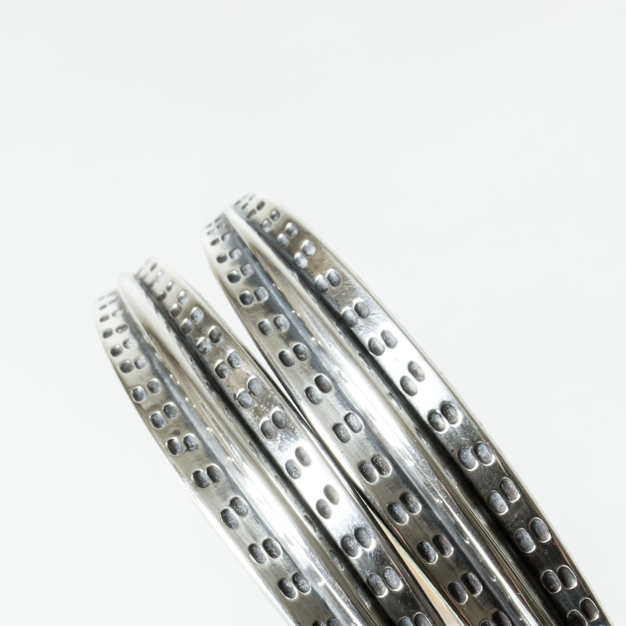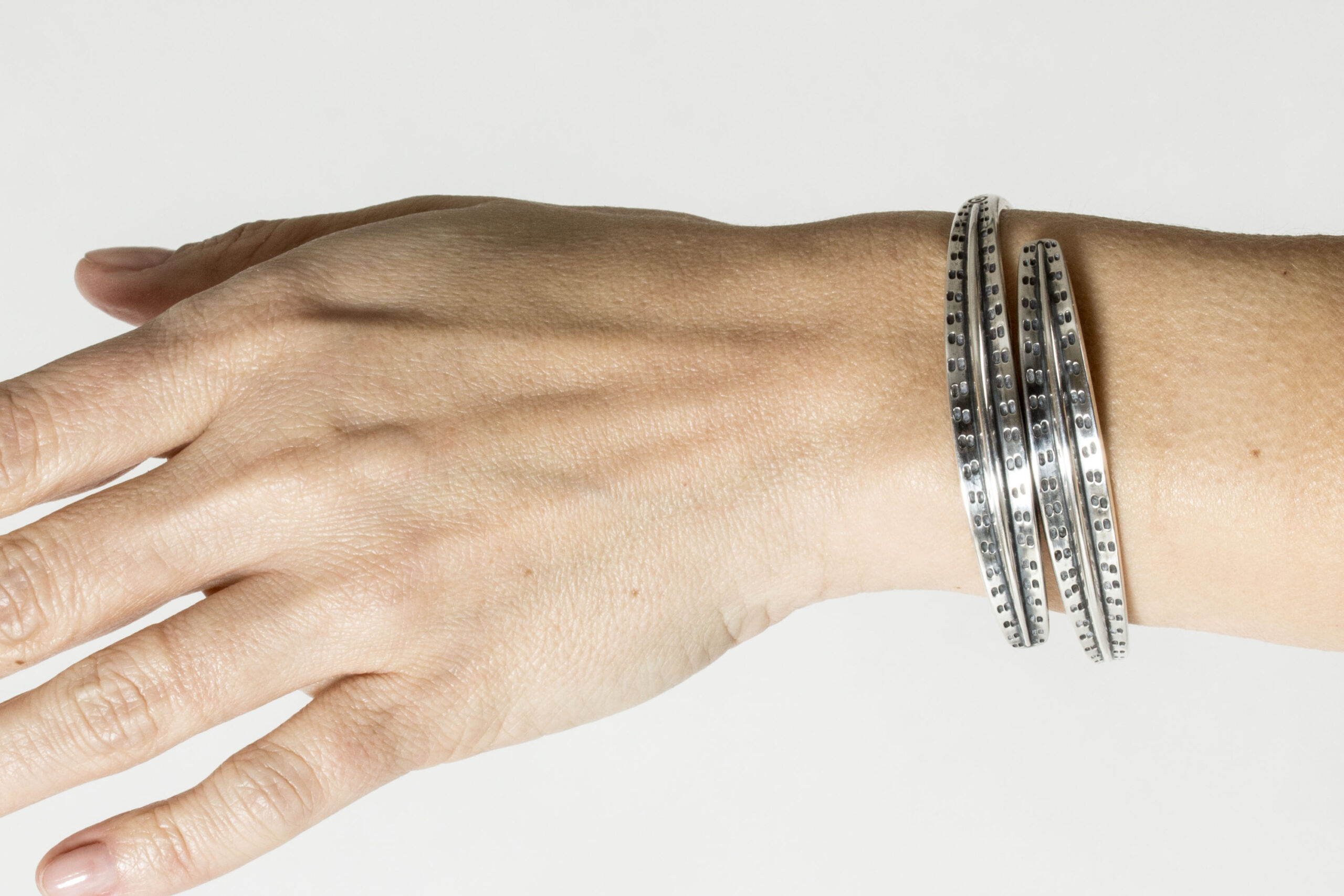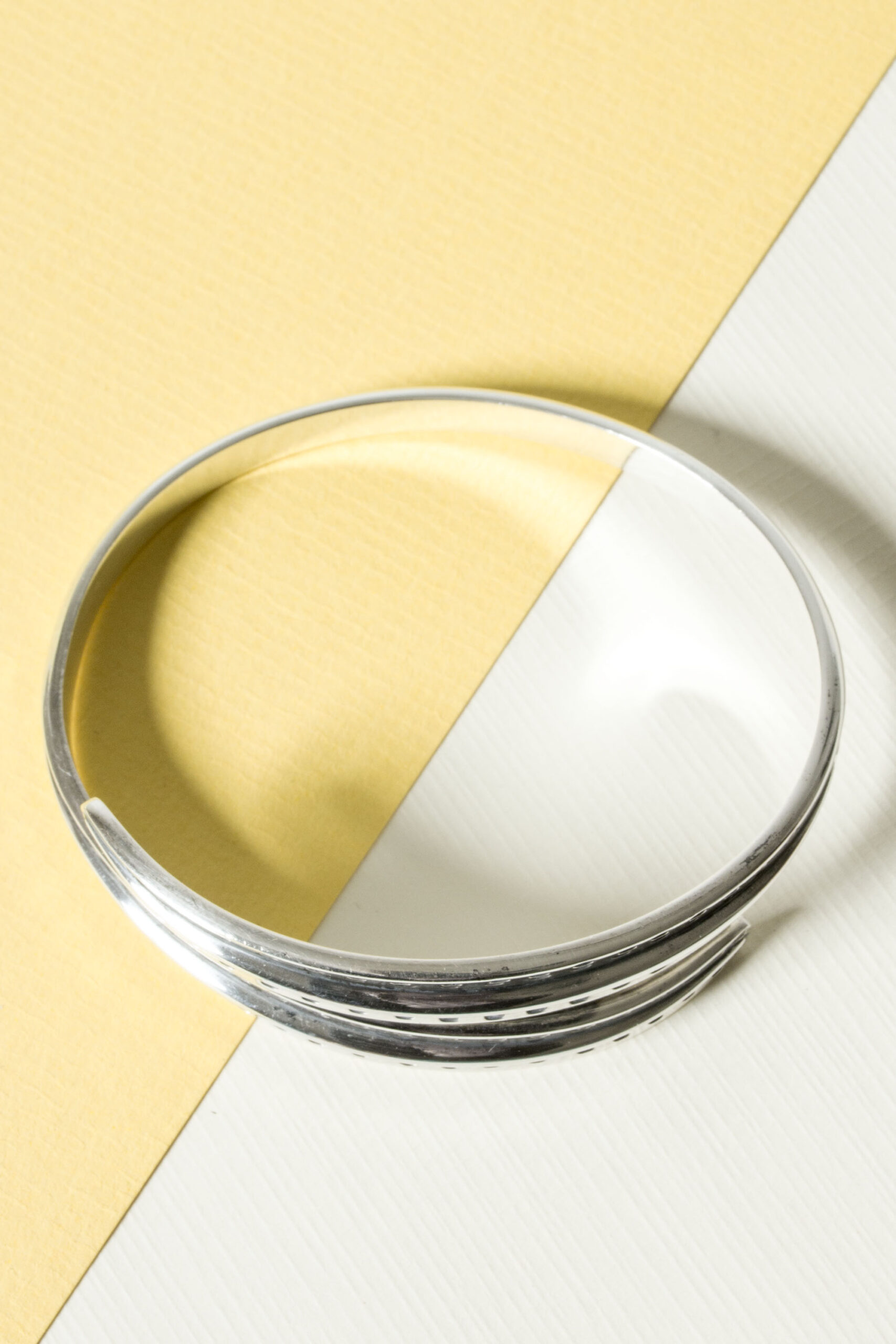 Cool silver bangle from David Andersen, in weighty quality. Wrap-around design with an etched graphic pattern.