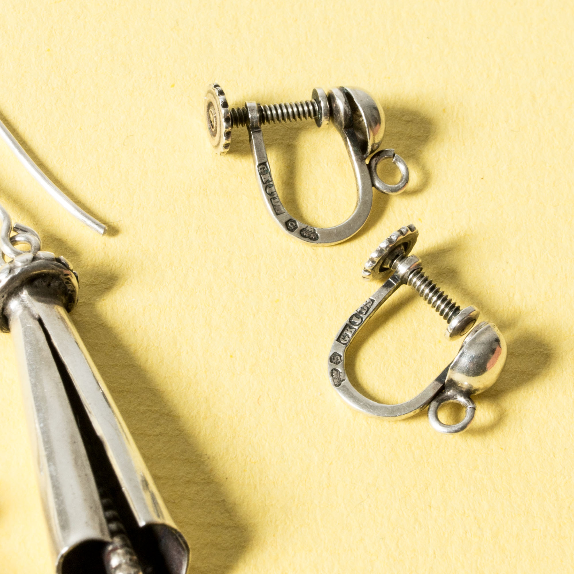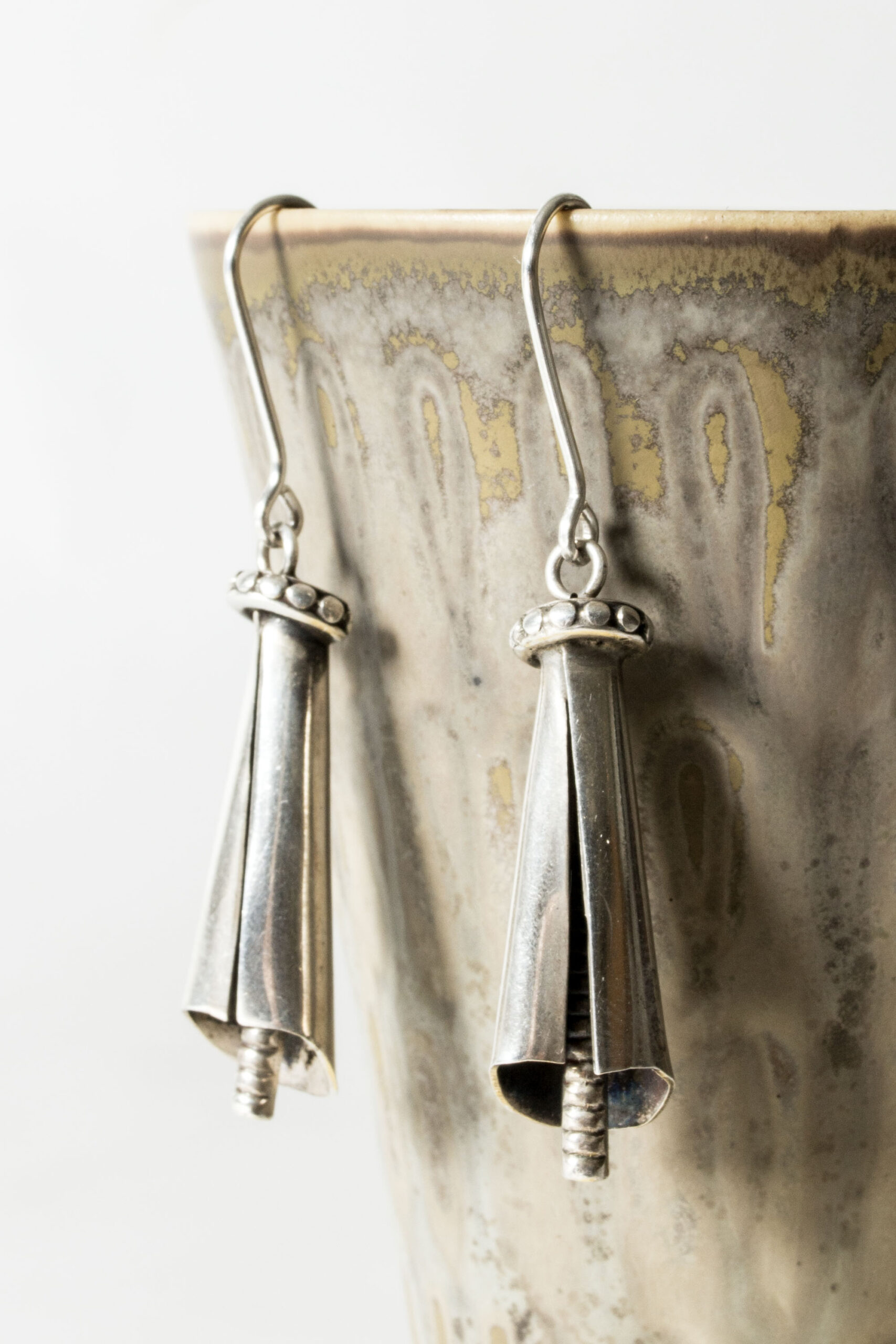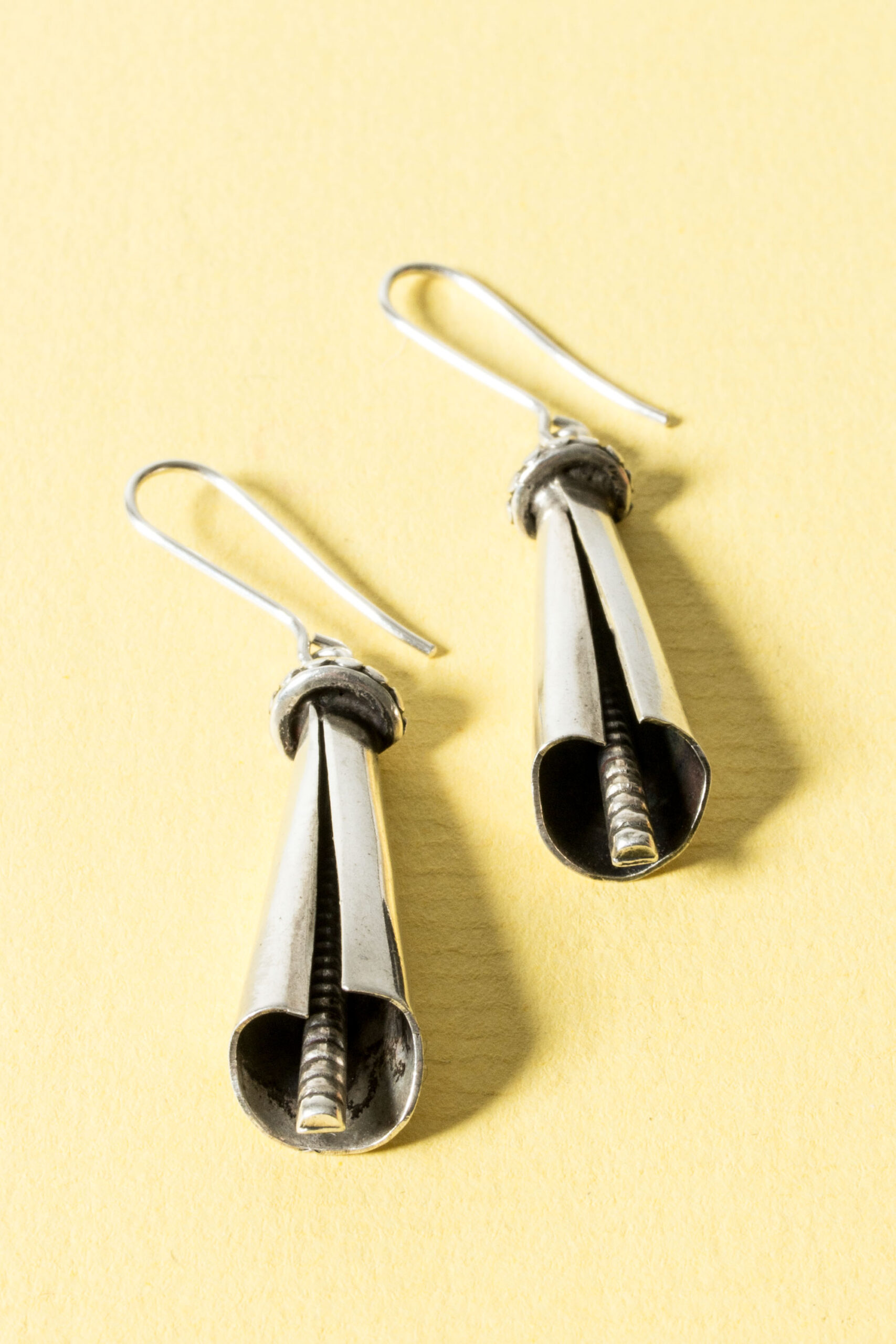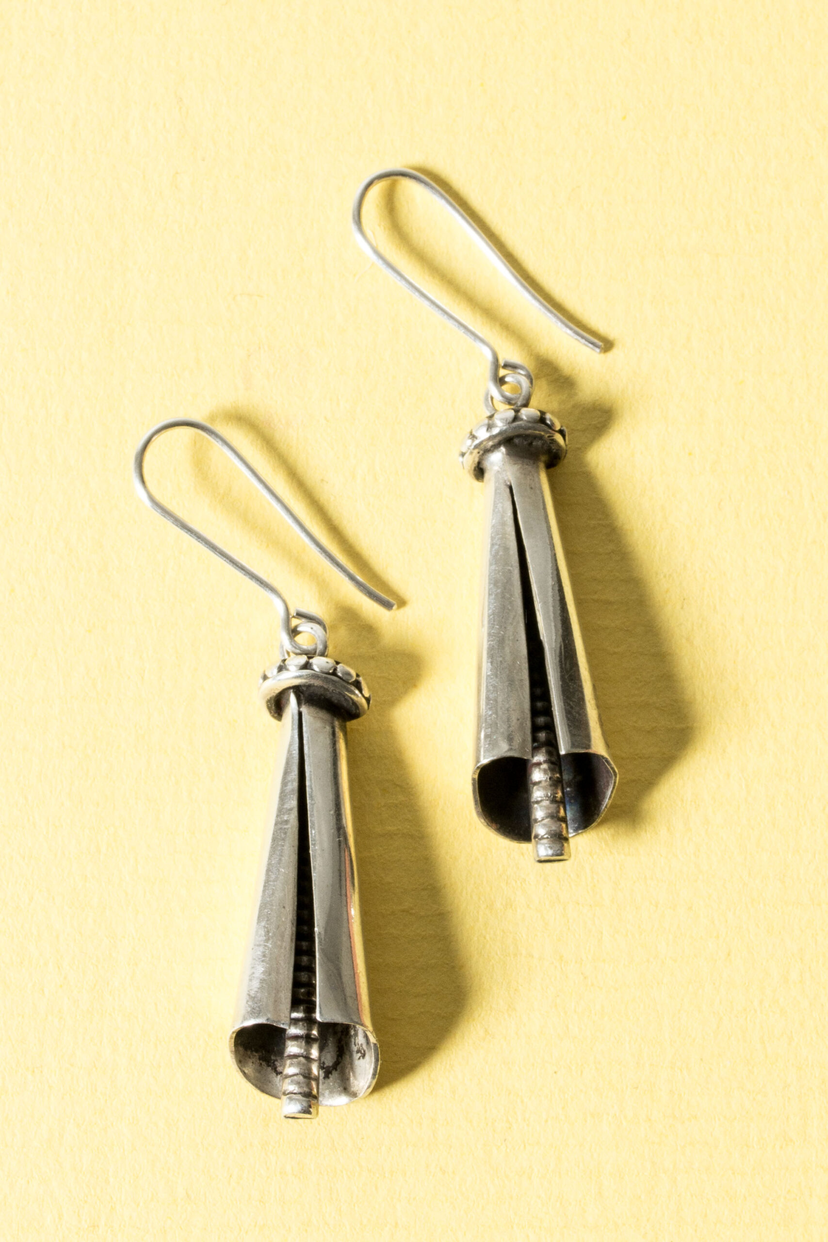 Elegant silver earrings from Kaplans, in a bell-like design with lovely details.