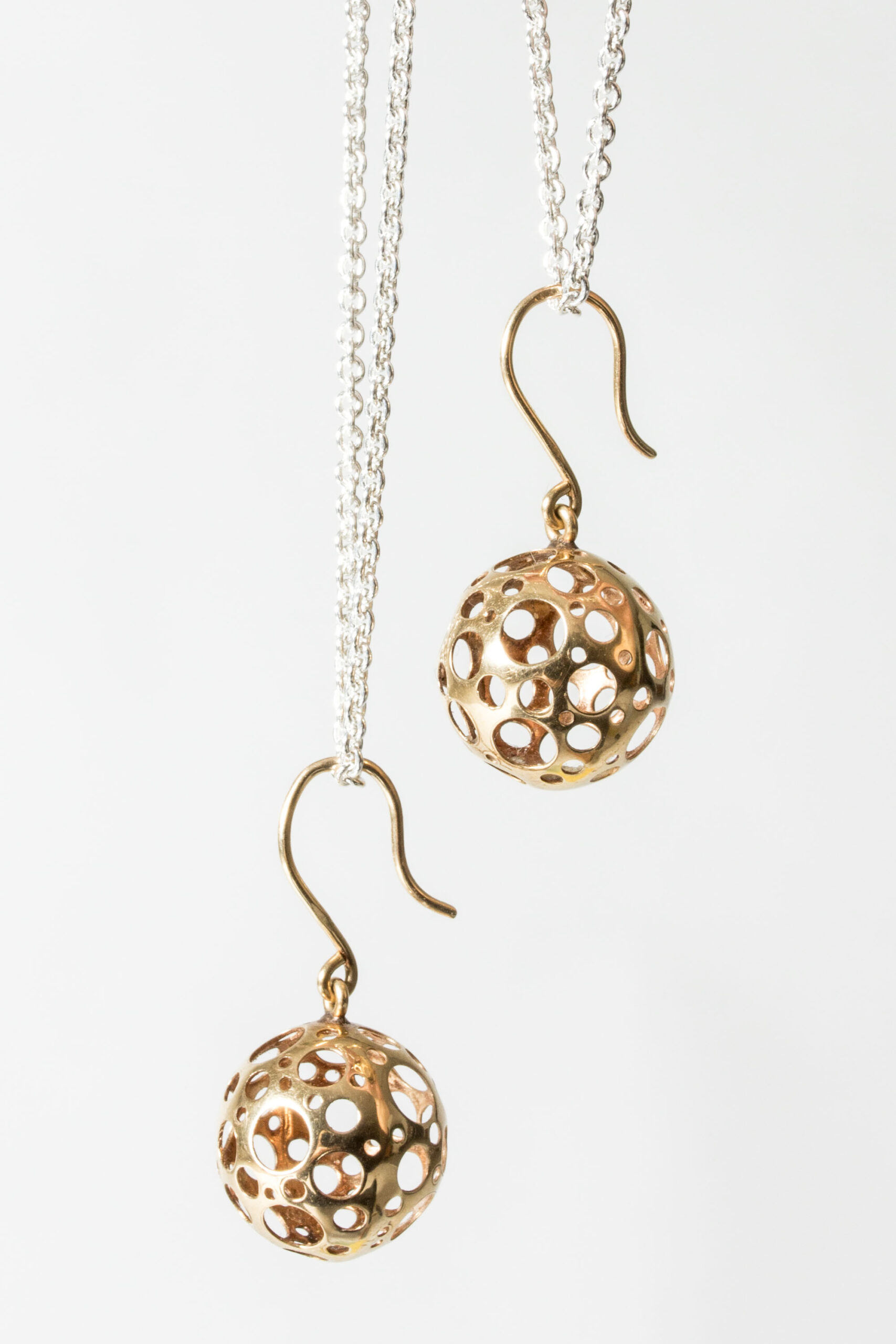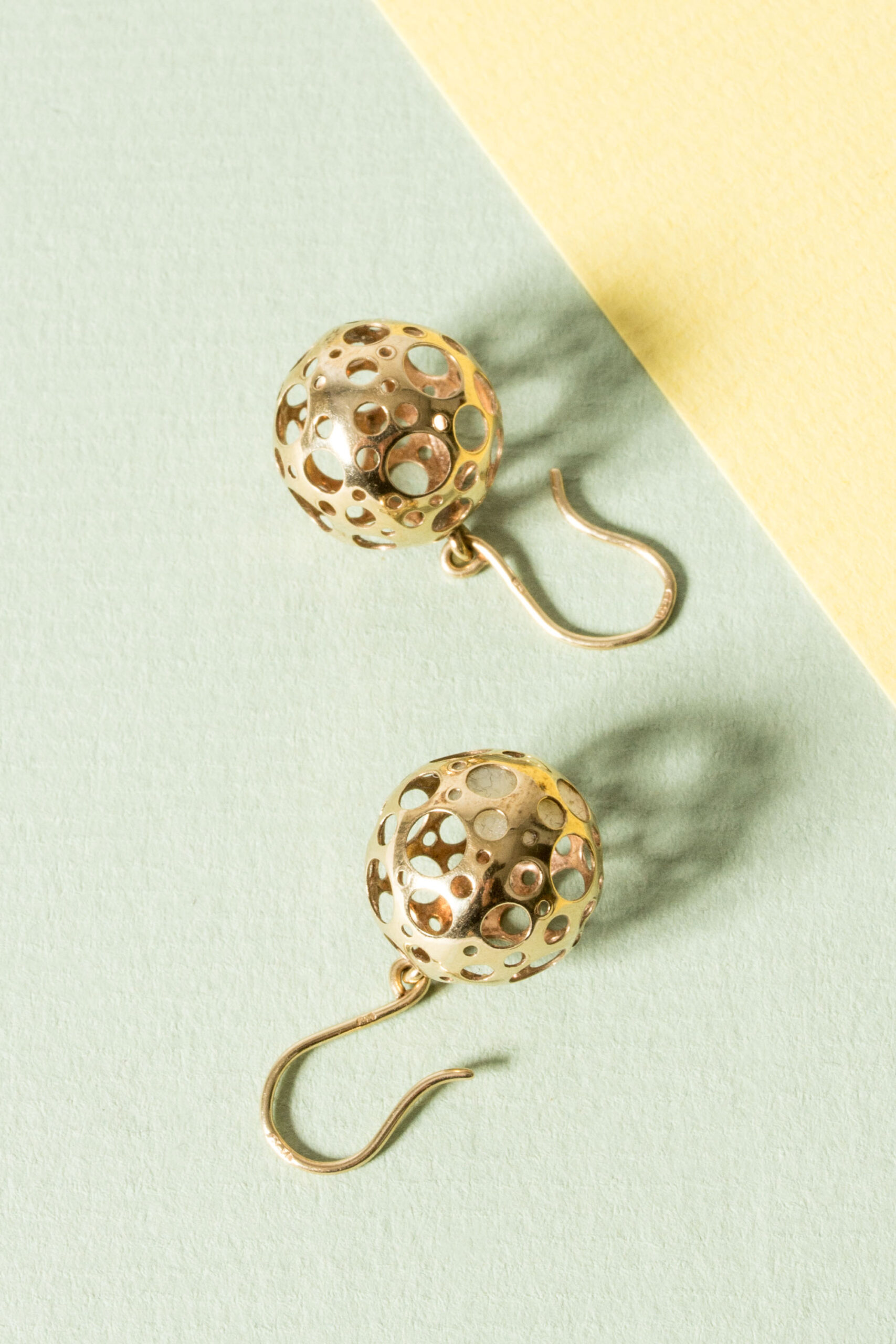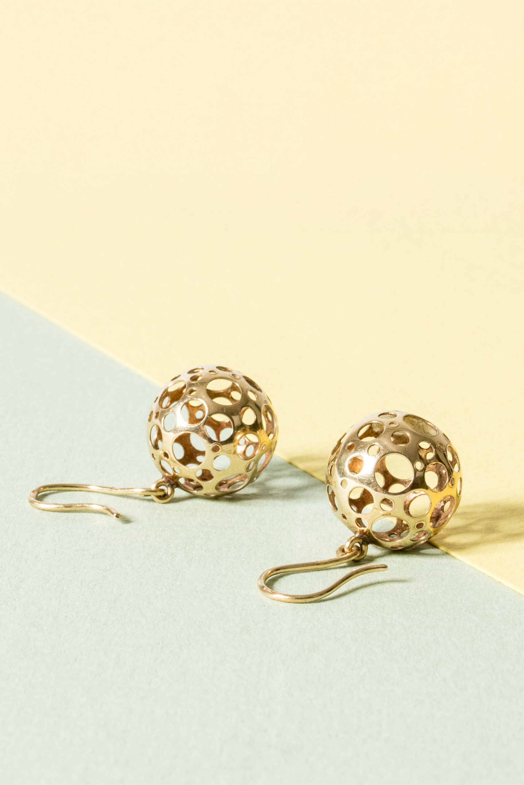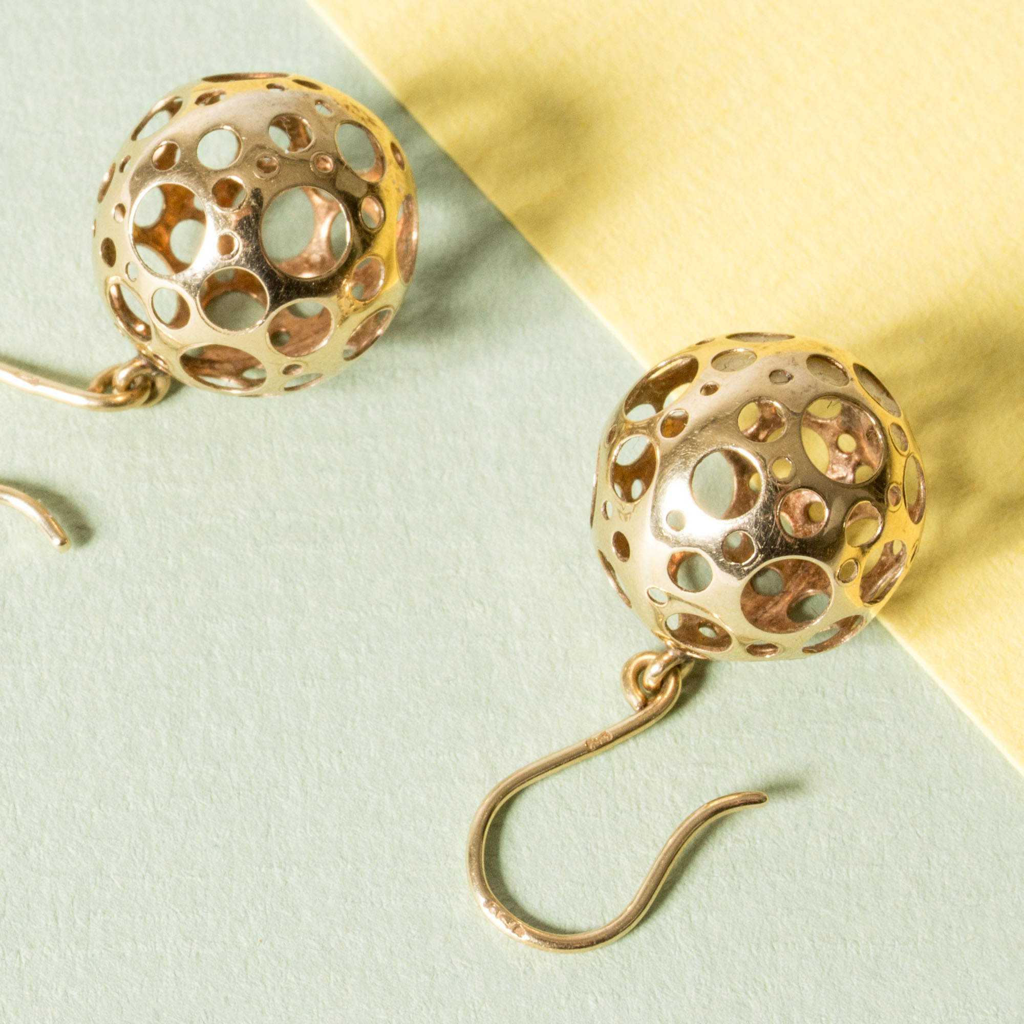 Pair of lovely gold “Ladybird” earrings by Liisa Vitali. Buoyant silver spheres with Vitali’s signature pattern of punched out holes.