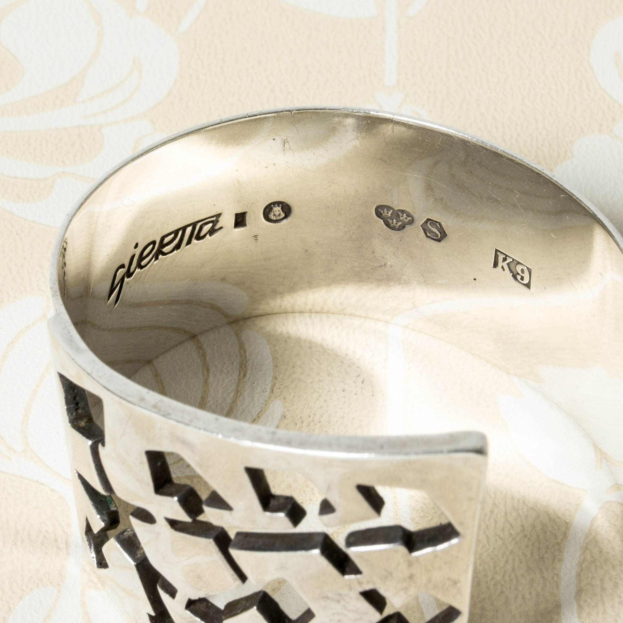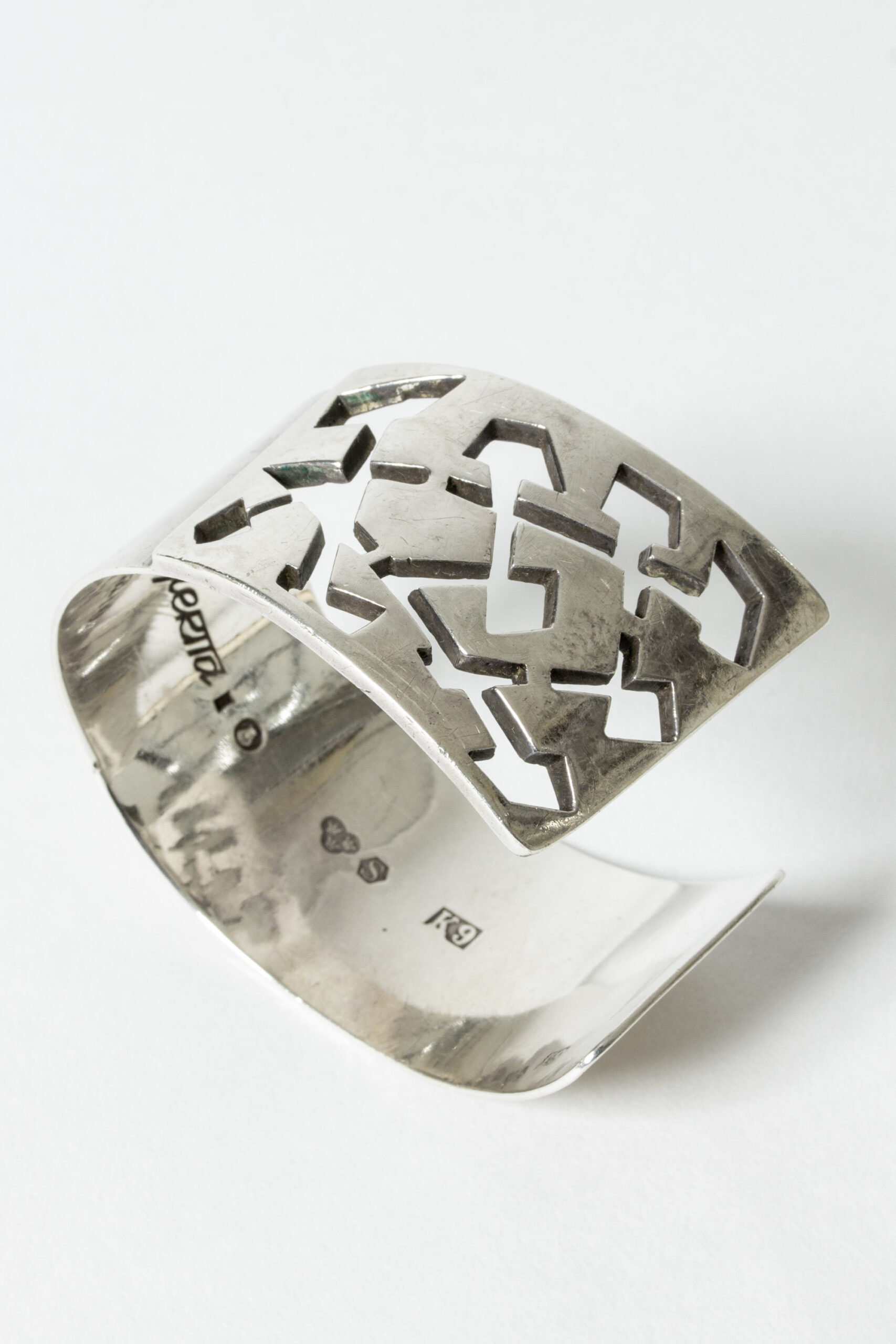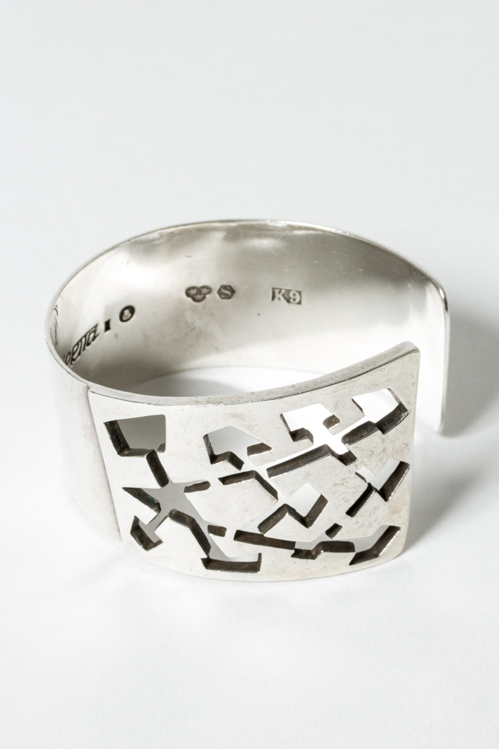 Striking silver bracelet by Claës Giertta, in thick silver quality. Cut-out graphic pattern that looks great against the skin.