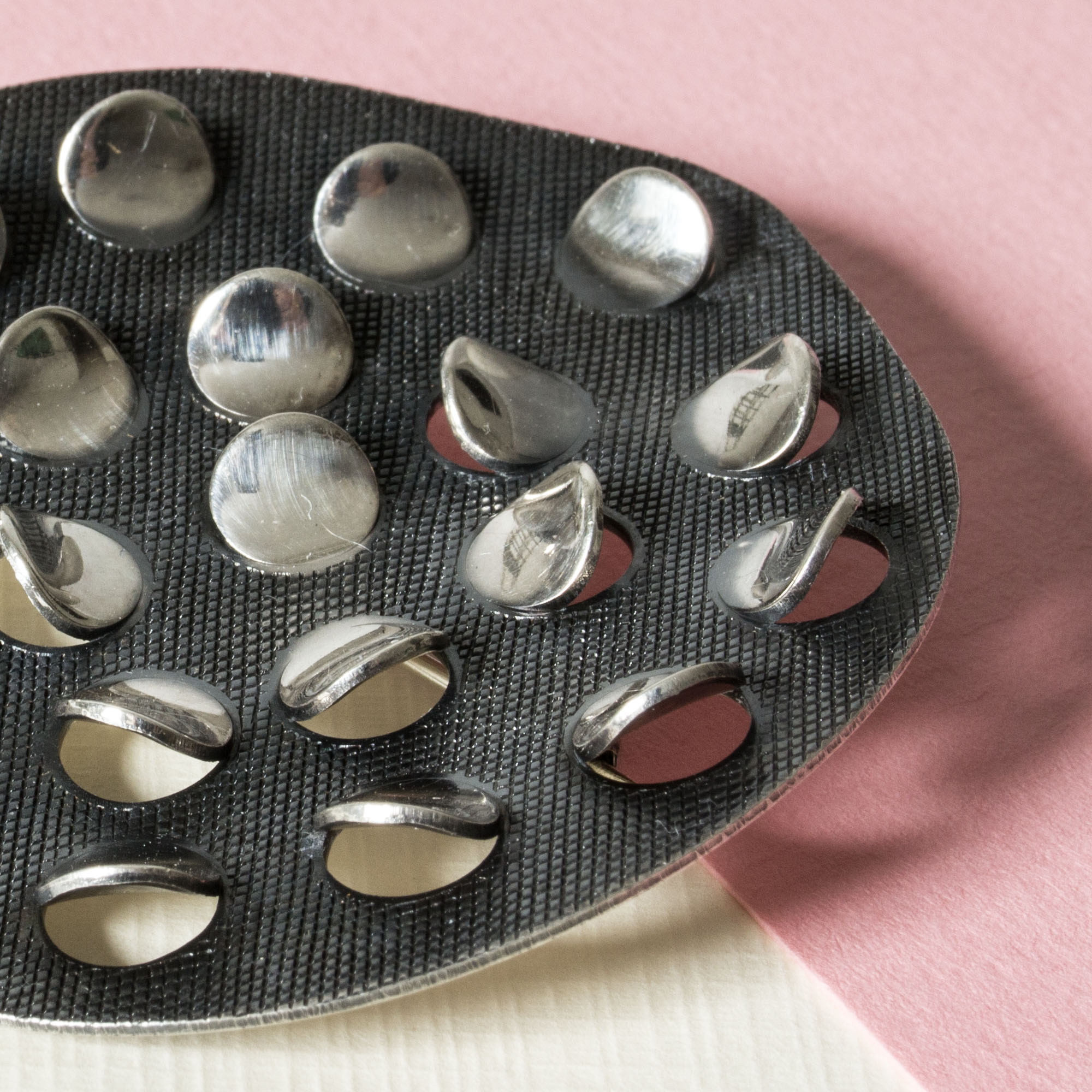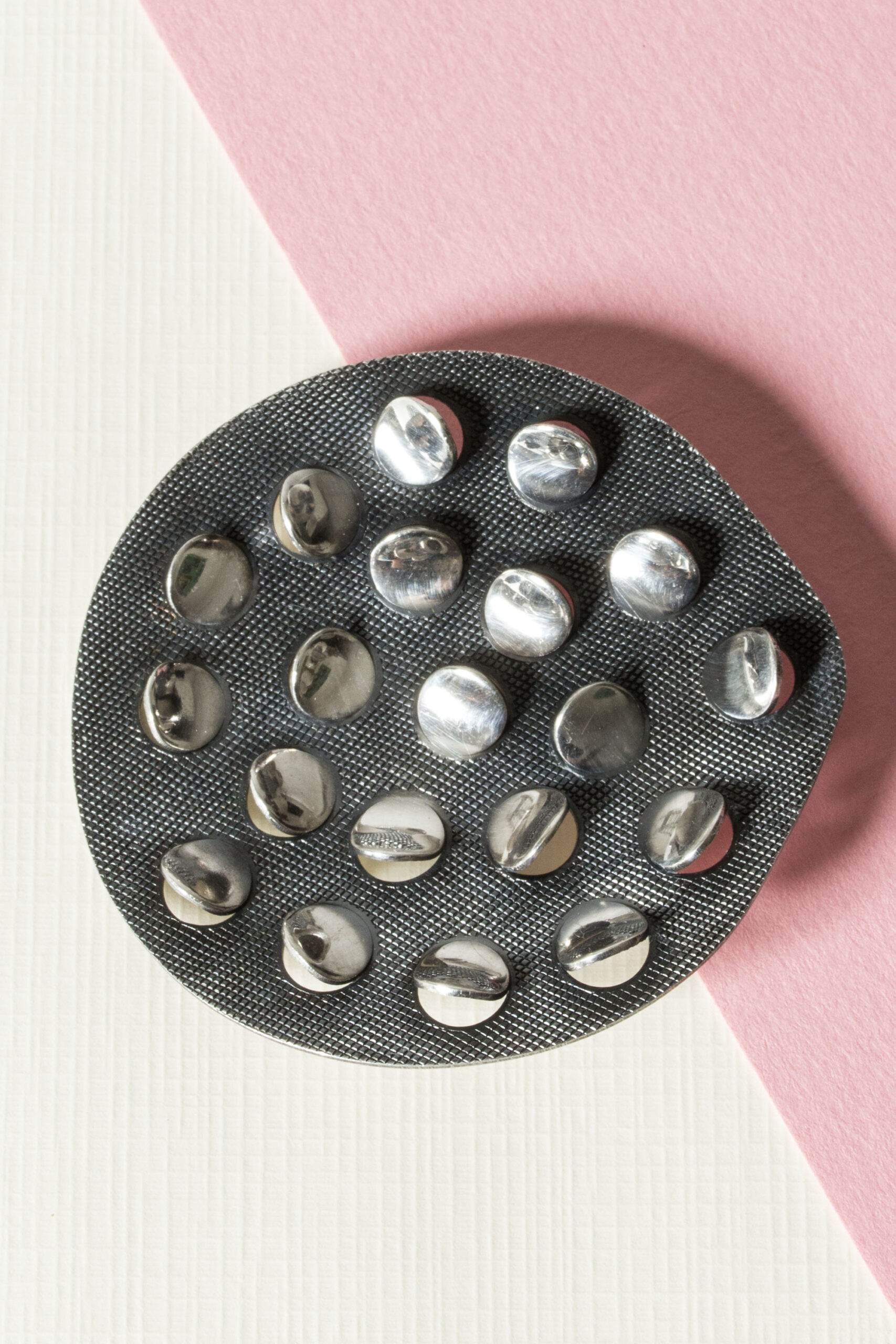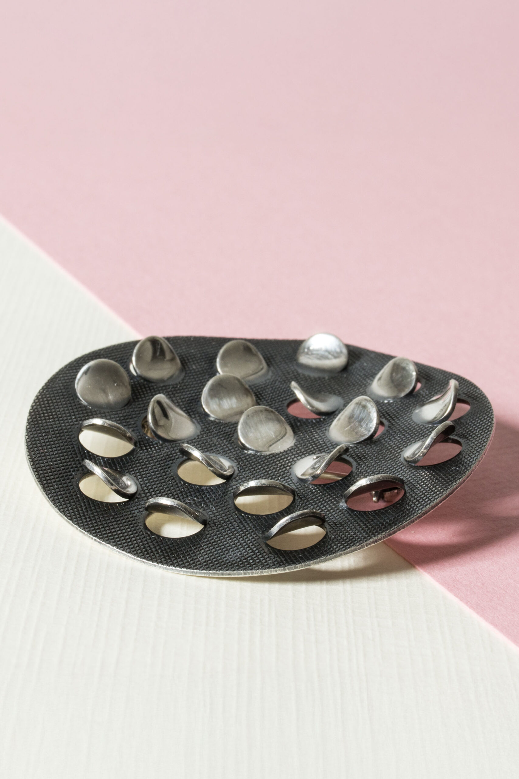 Amazing silver brooch by Grete Prytz Kittelsen. The subtly undulating pattern with its industrial expression serves as backdrop to the petallike flaps emerging from the surface. A really great design.