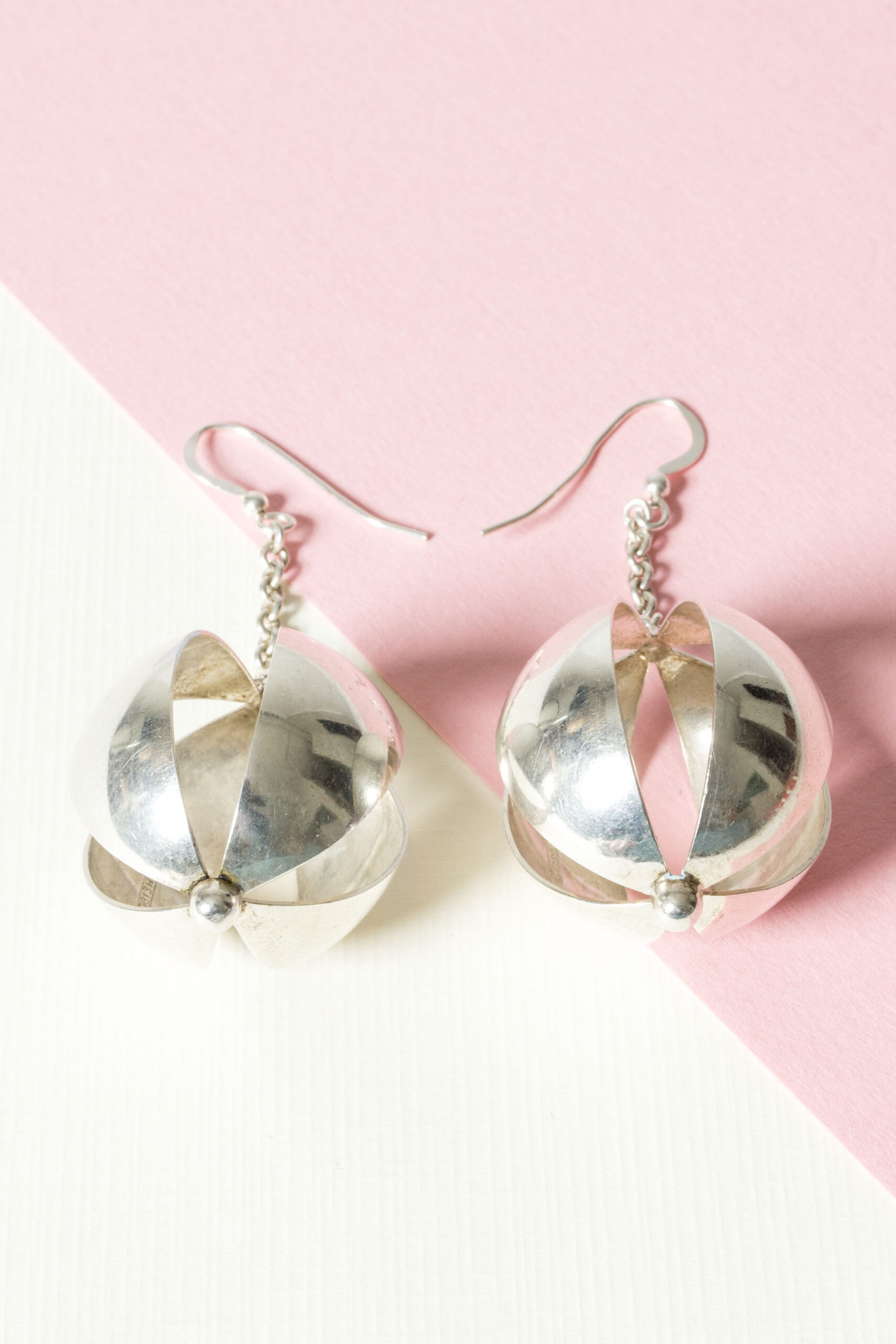 Pair of striking, oversized earrings by Elis Kauppi. Two large spheres, cutout with a graphic diamond pattern. Fun, beautifully made statement pieces.