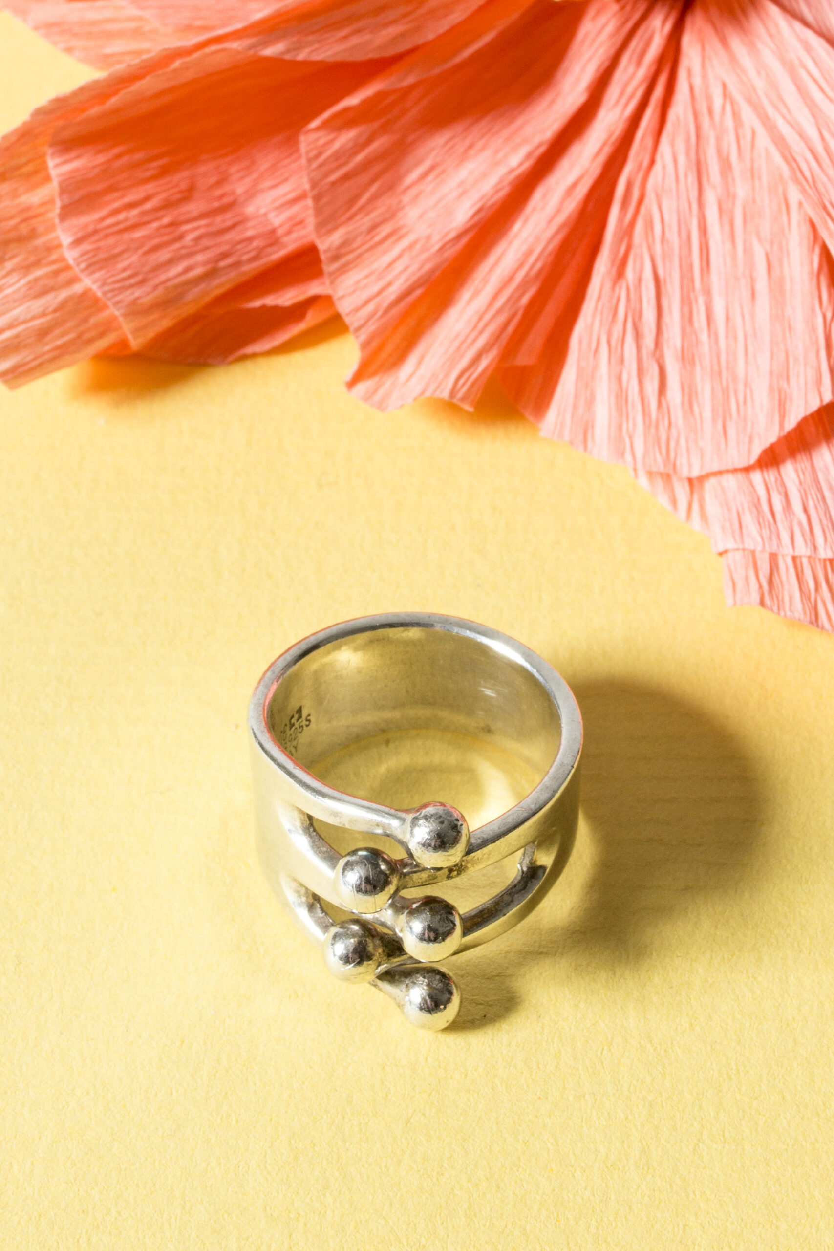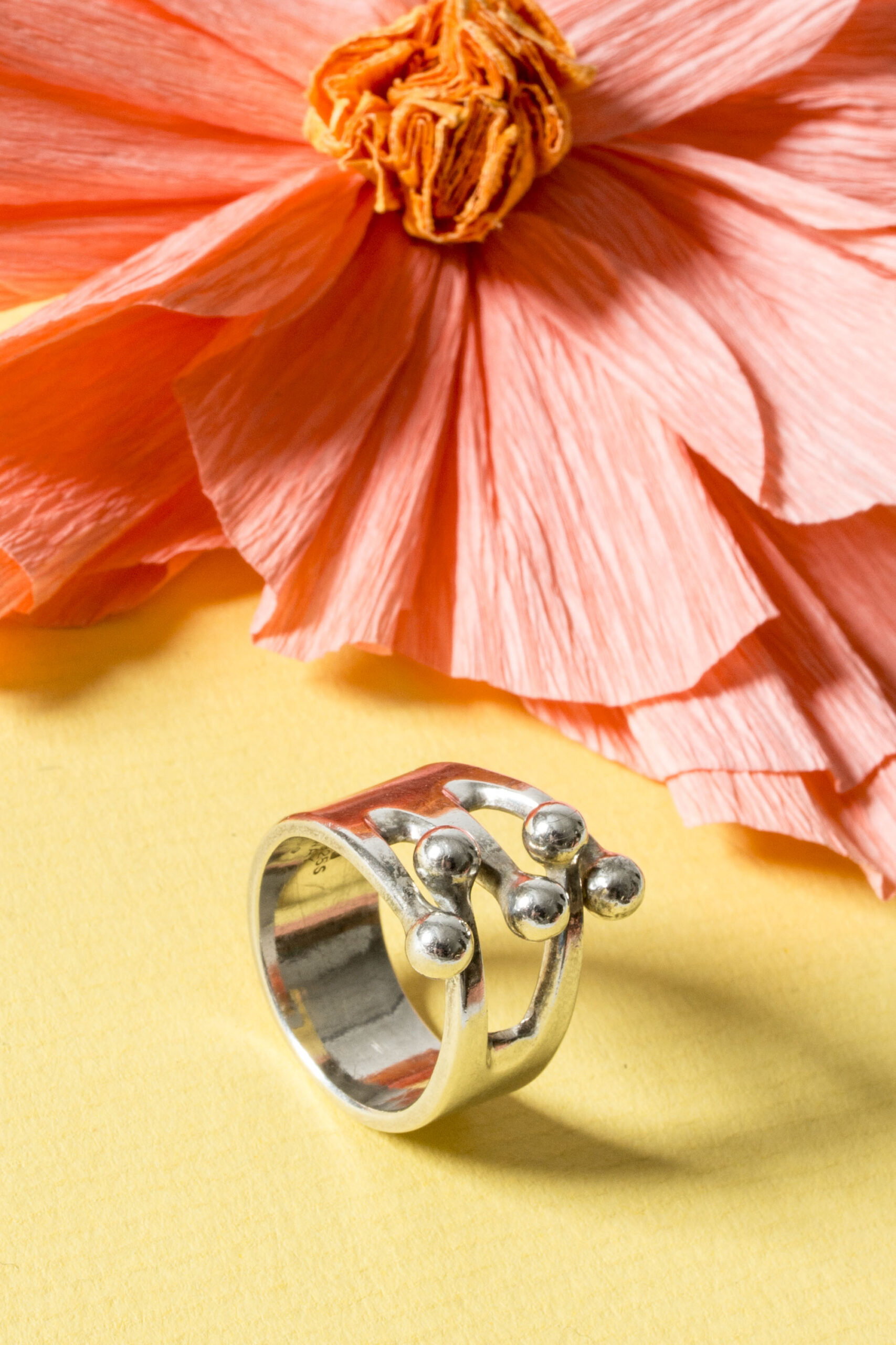 Striking and playful silver ring by Anna Greta Eker, with an interlocking design reminiscent of the tines of a crown with balls at the ends.