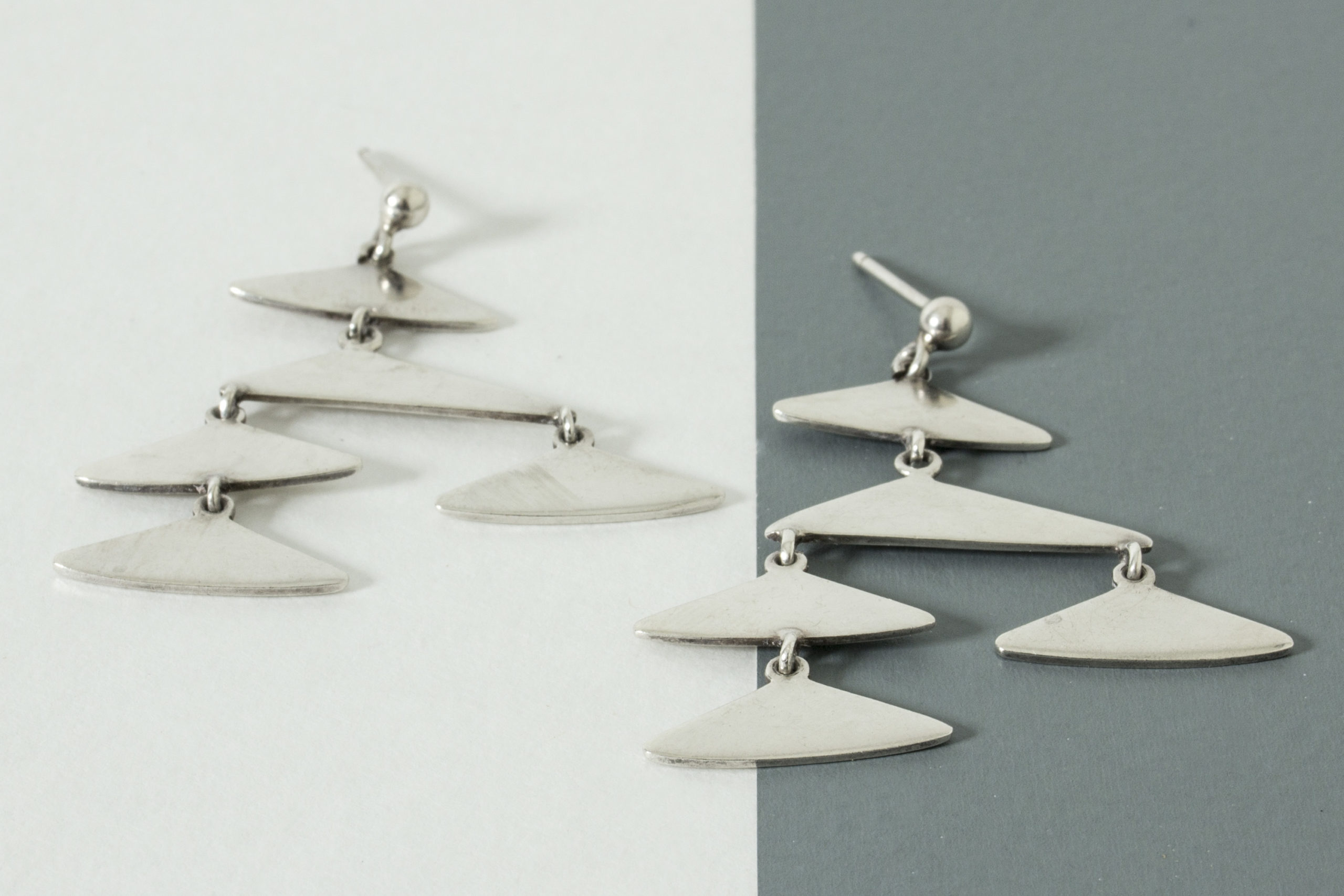 Pair of amazing kinetic earrings by Bent Knudsen, like two small, crisp mobiles. Brushed silver sections in a cool, graphic design.