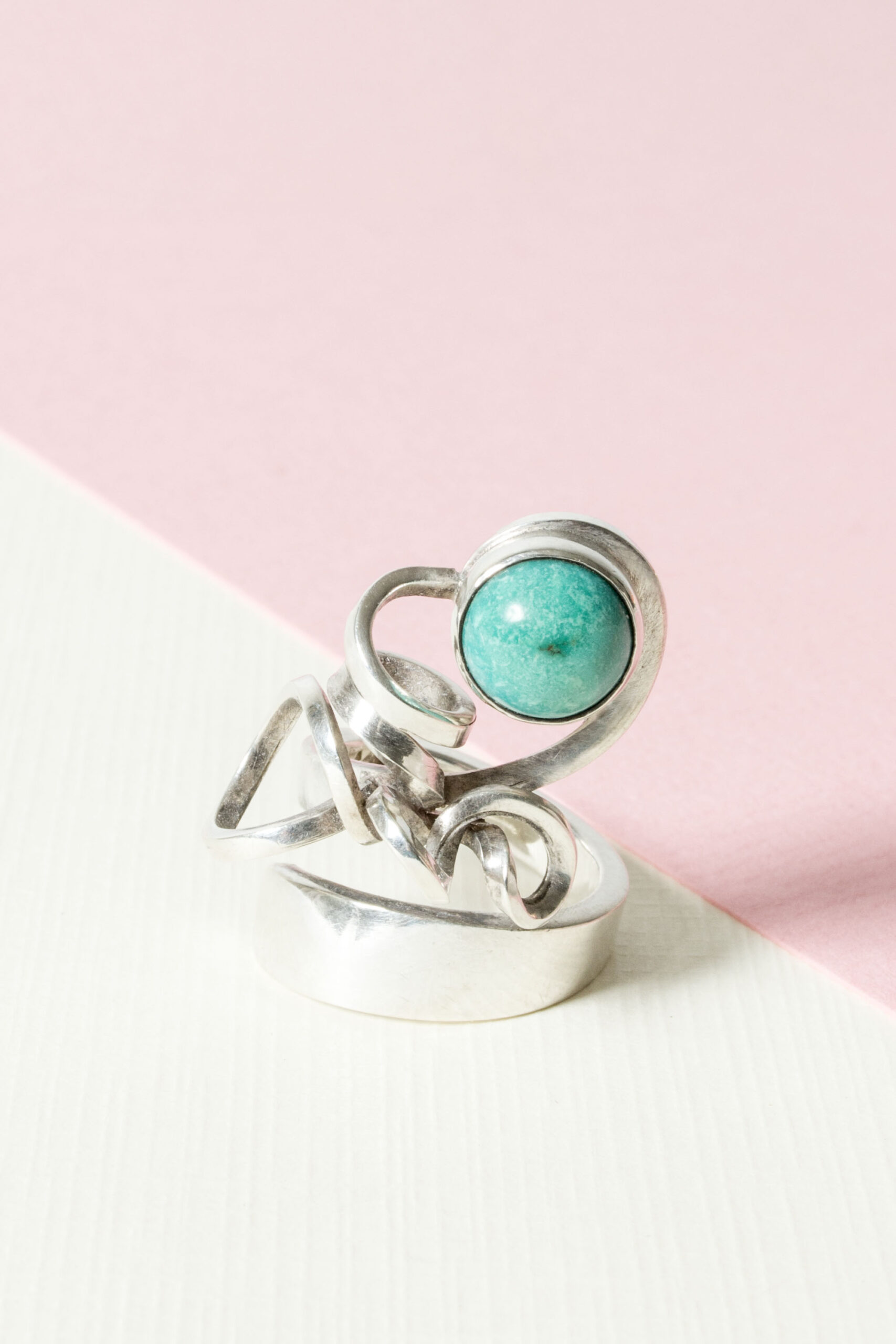 Striking silver ring by Cecilia Johansson with a round amazonite stone set in an elegant tangle of spiraling silver. Expressive and comfortable to wear.