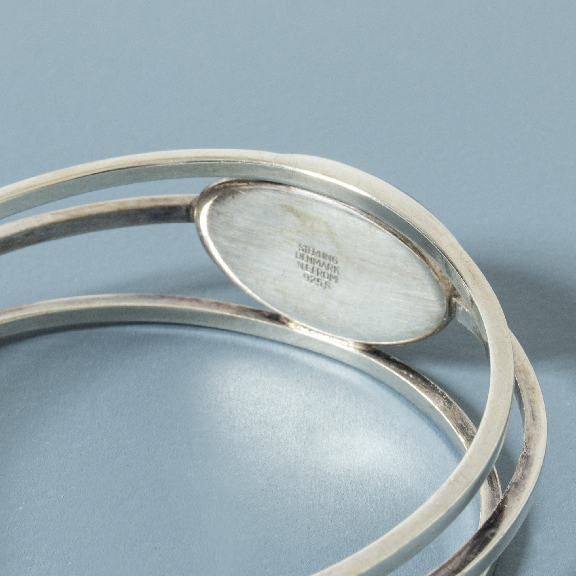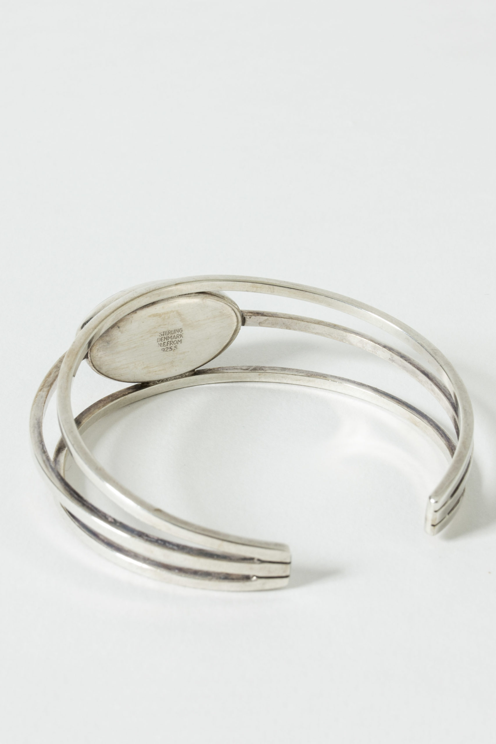 Silver bracelet from Niels Erik From, with a large almond shaped amber stone. Streamlined look combined with the warm glow of the stone.