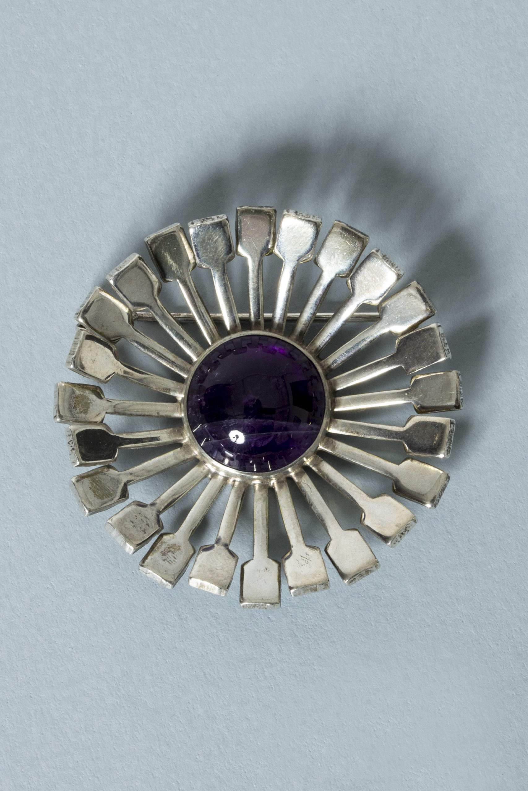Beautiful, vibrant silver brooch from Victor Jansson. Round amethyst stone in the middle, rays of silver with a graphic look extending outwards from it.