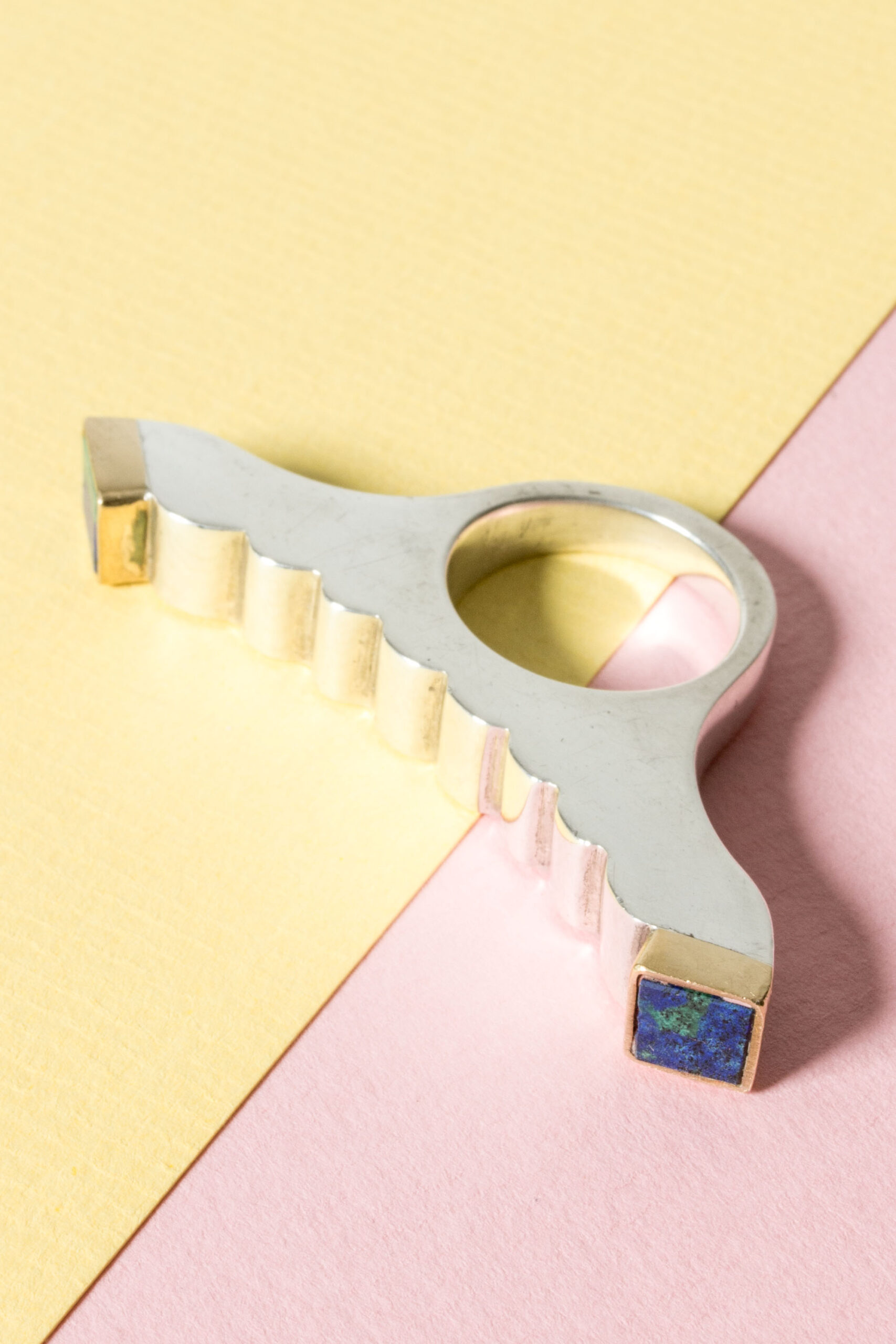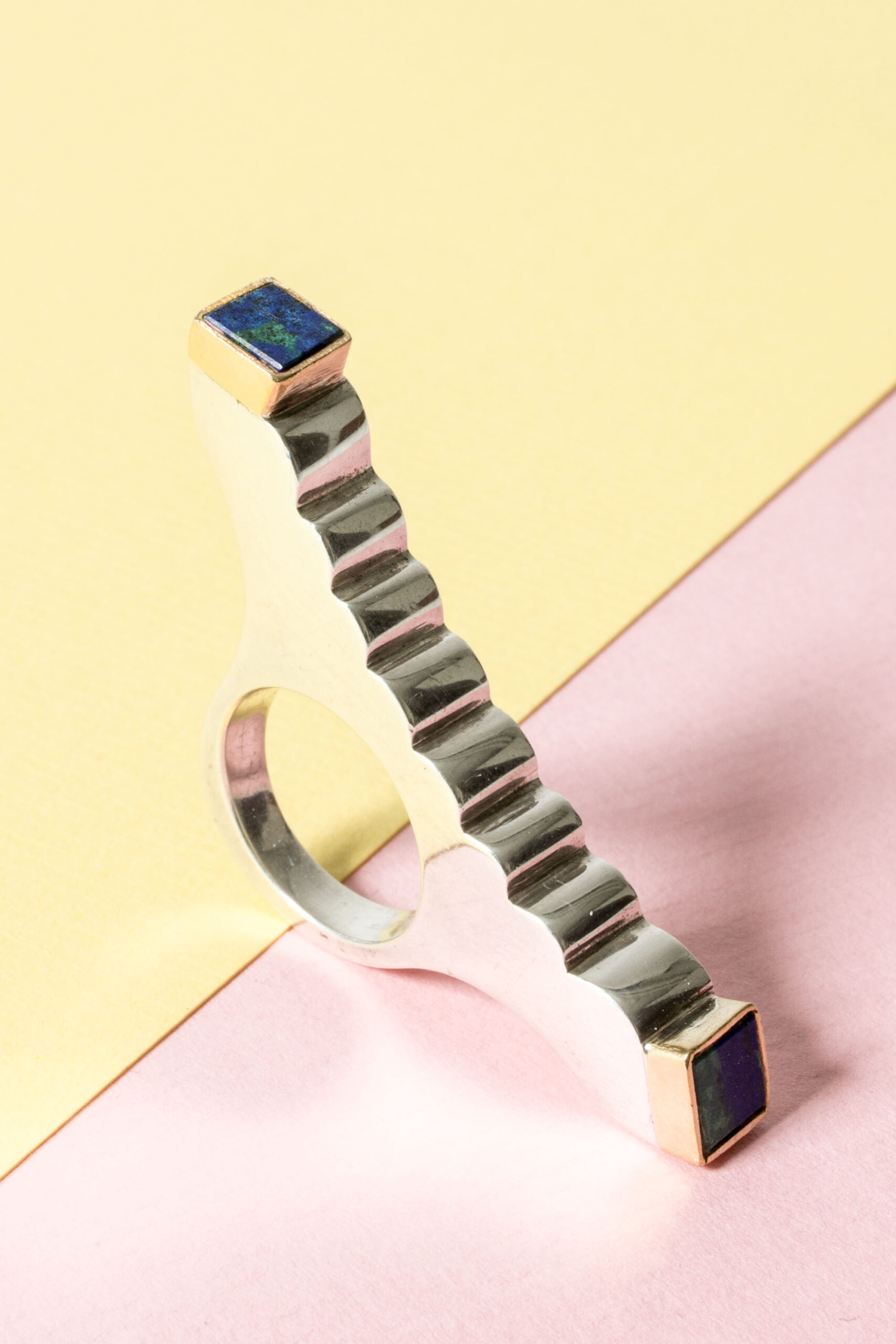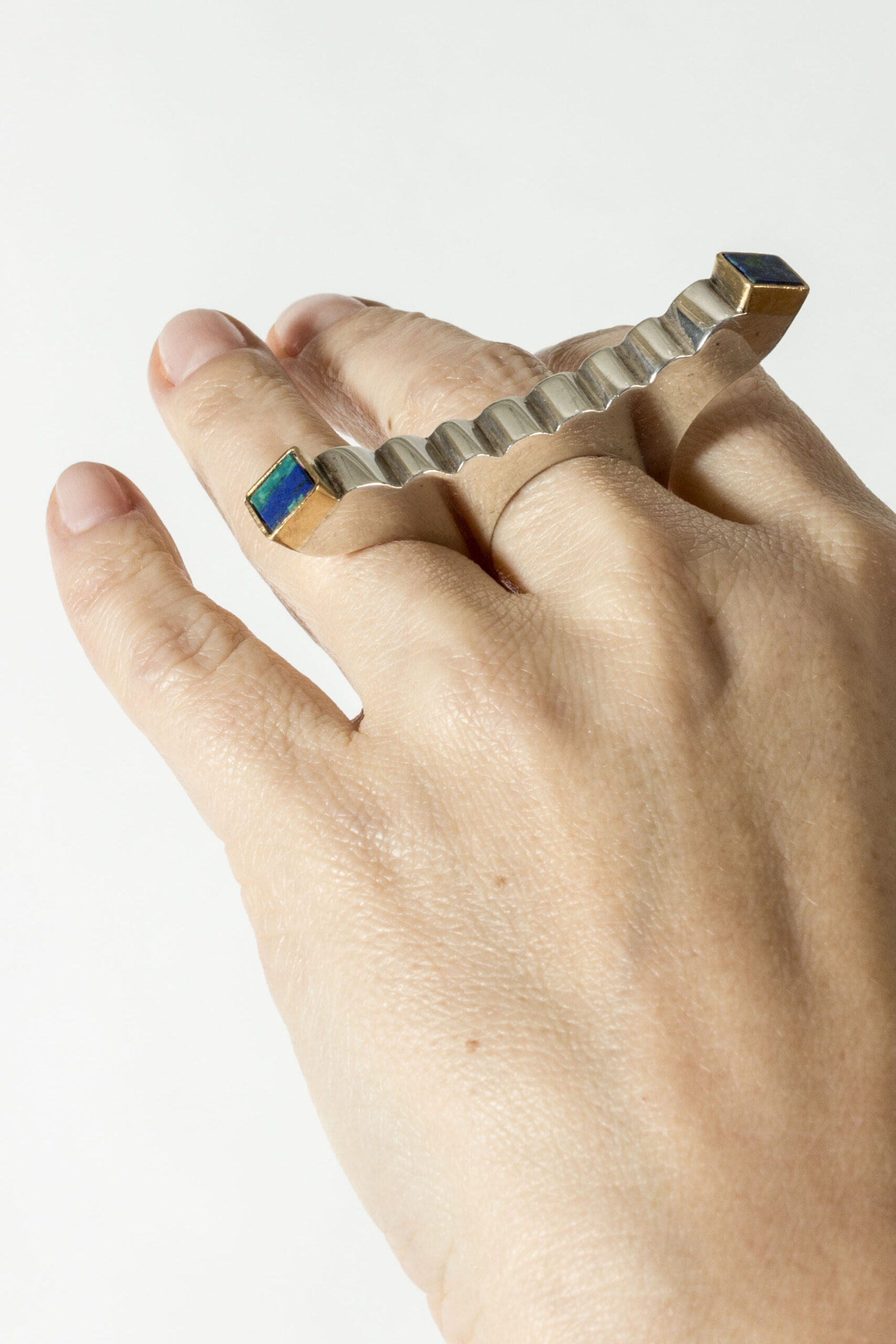 Striking silver ring by Karl-Heinz Sauer, in an impactful, imaginative design that spreads over the fingers. Square azurite stones framed by gilded silver.