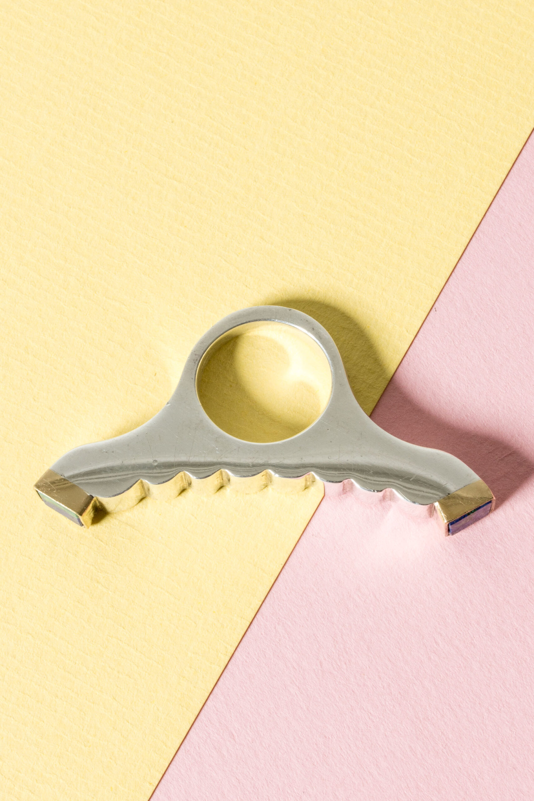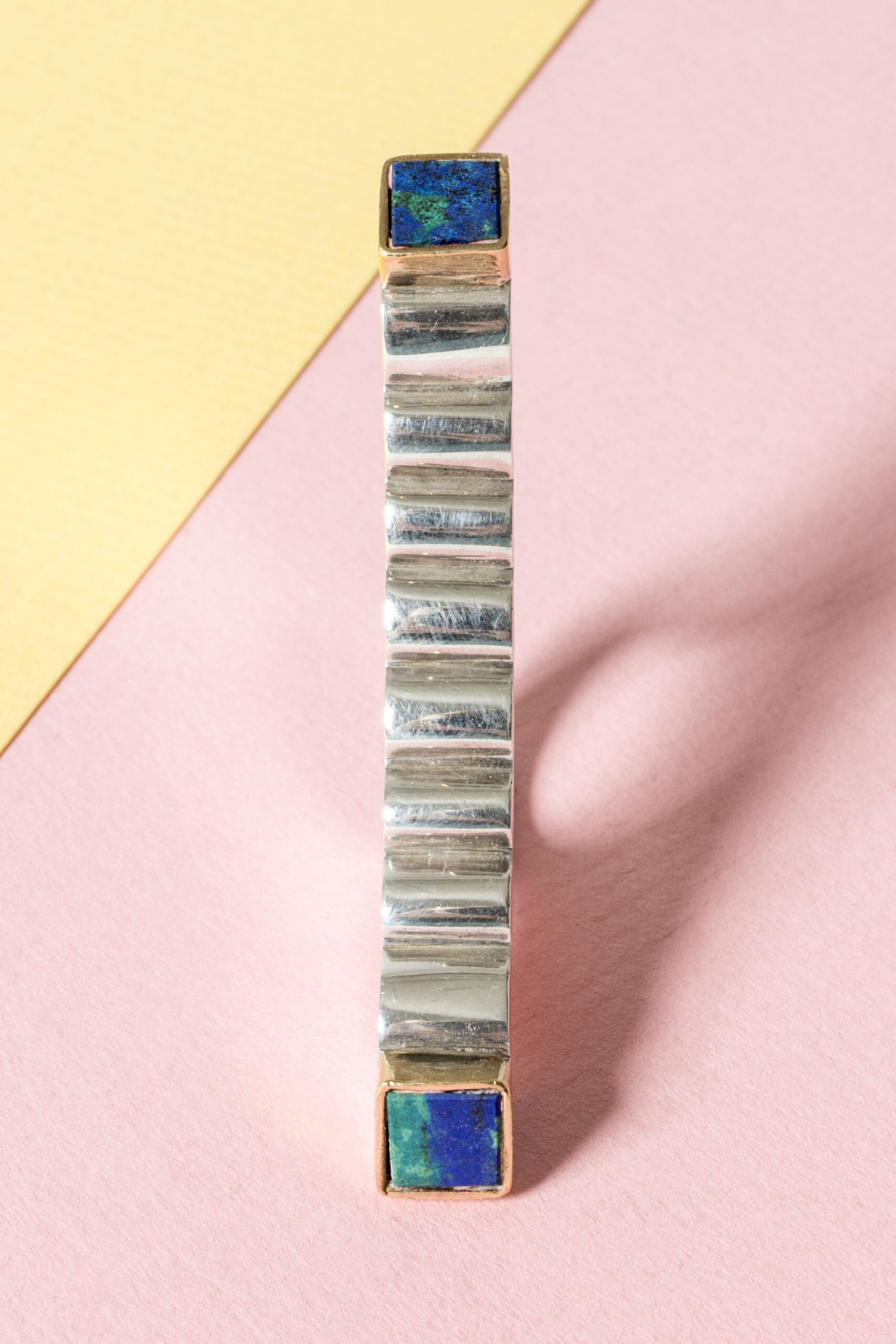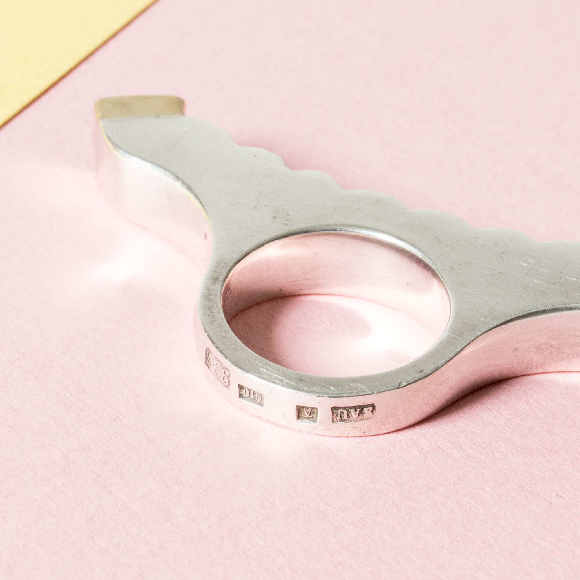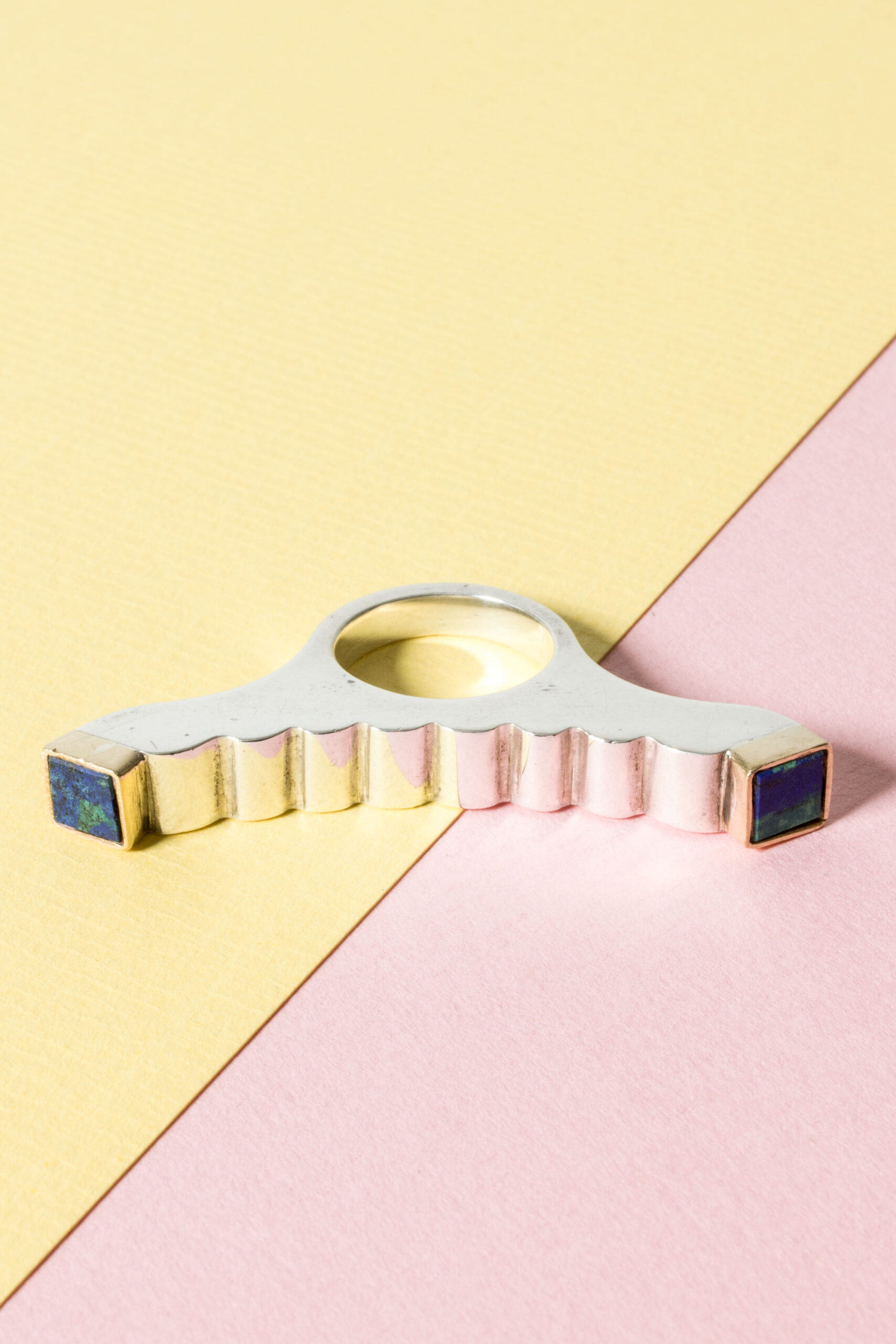 Striking silver ring by Karl-Heinz Sauer, in an impactful, imaginative design that spreads over the fingers. Square azurite stones framed by gilded silver.