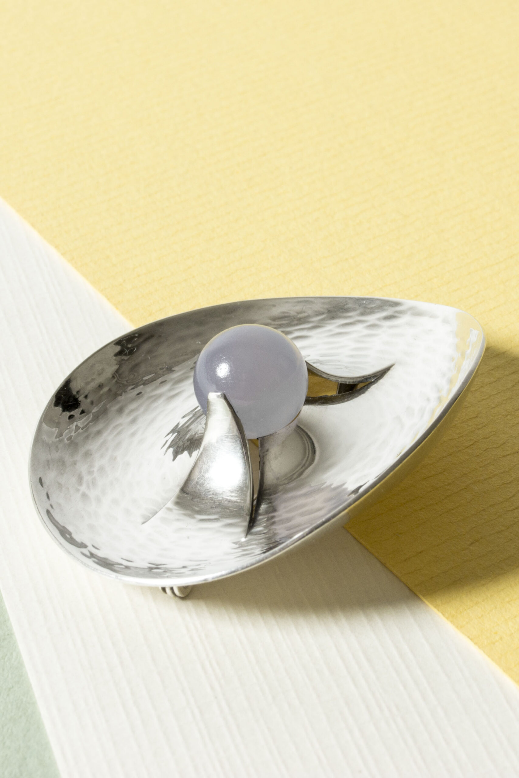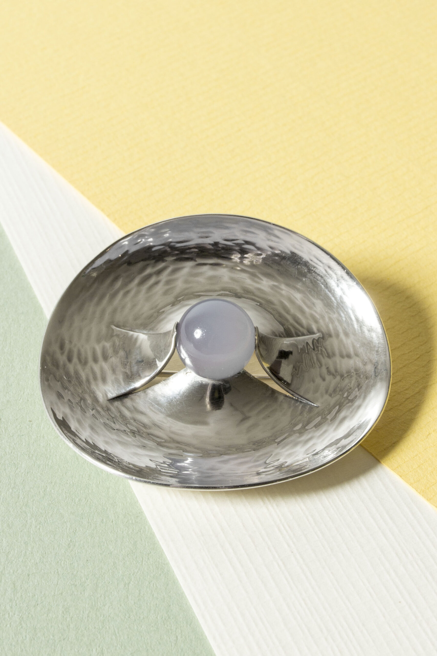 Amazing silver brooch by Elis Kauppi, in an oval form with a hammered surface that creates a rippling effect. A round chalcedony stone in the center seems to be emerging out of the silver.