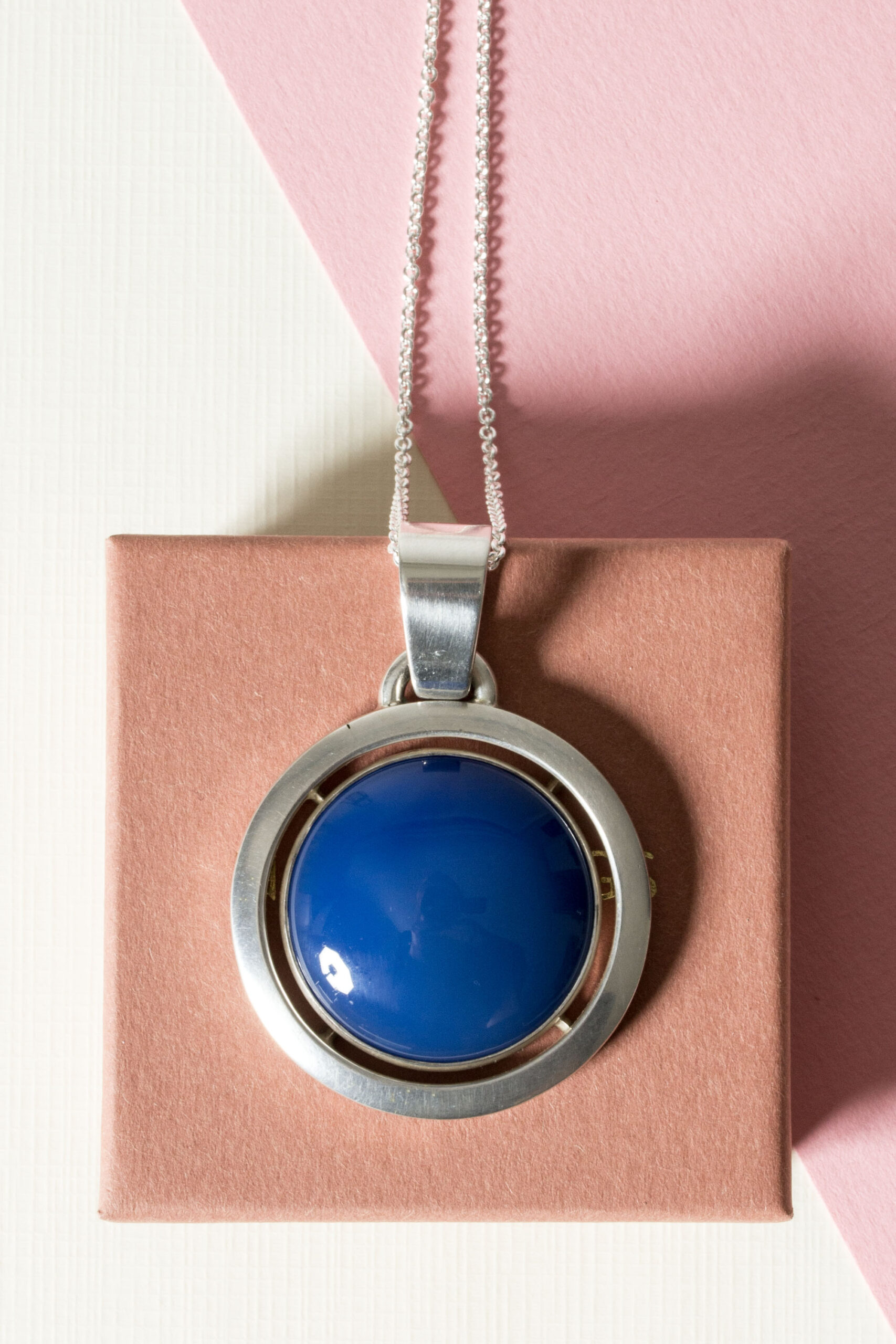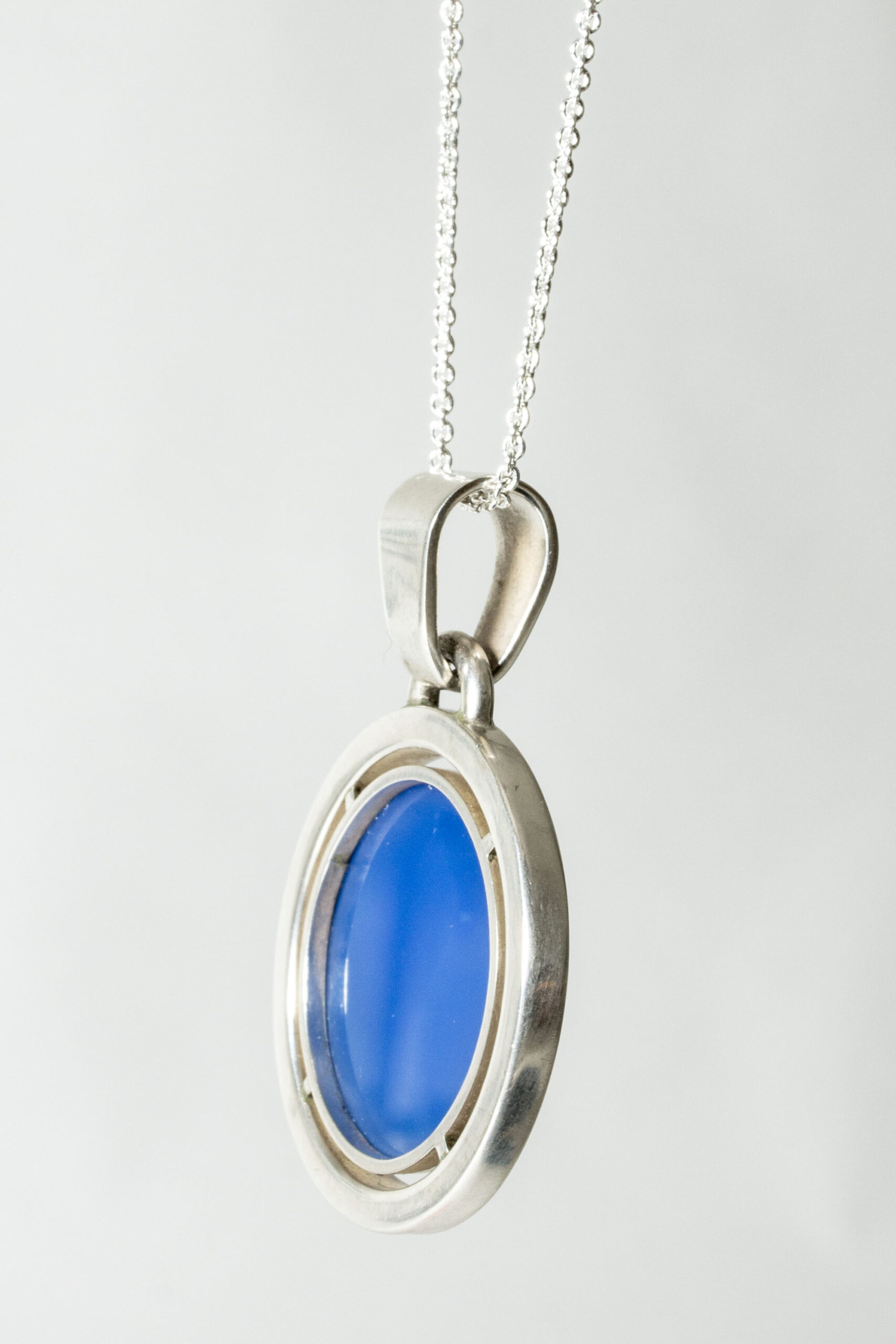 Striking silver pendant designed by Anders Högberg, in an appealing clean form with a large chalcedony stone. The stone is vibrant, rich blue. An eye-catching design that works for both casual and formal occasions.