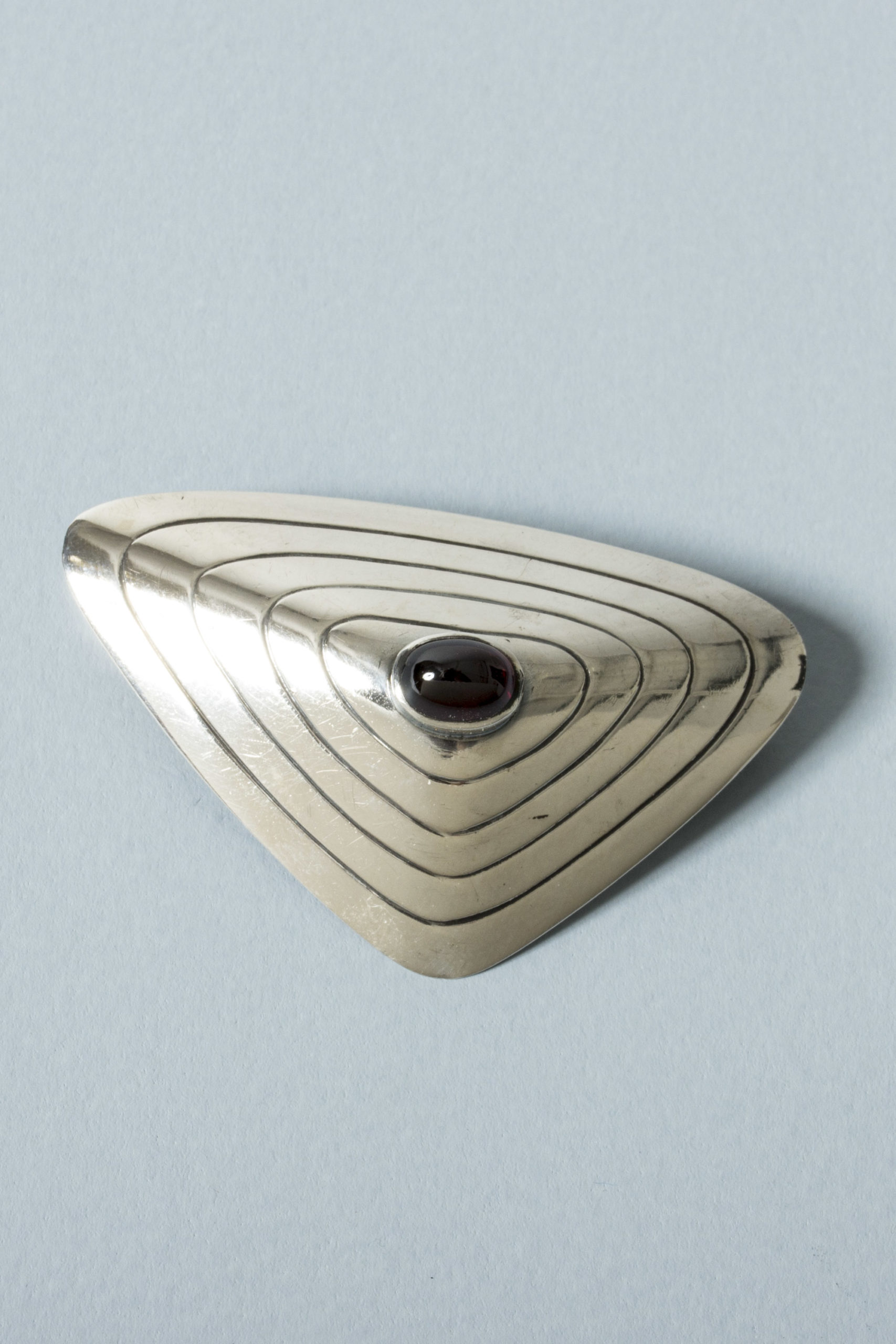 Silver brooch by Sven-Arne Gillgren, with a deep red, oval garnet in the middle. Skewed, triangular shape with a graphic pattern.