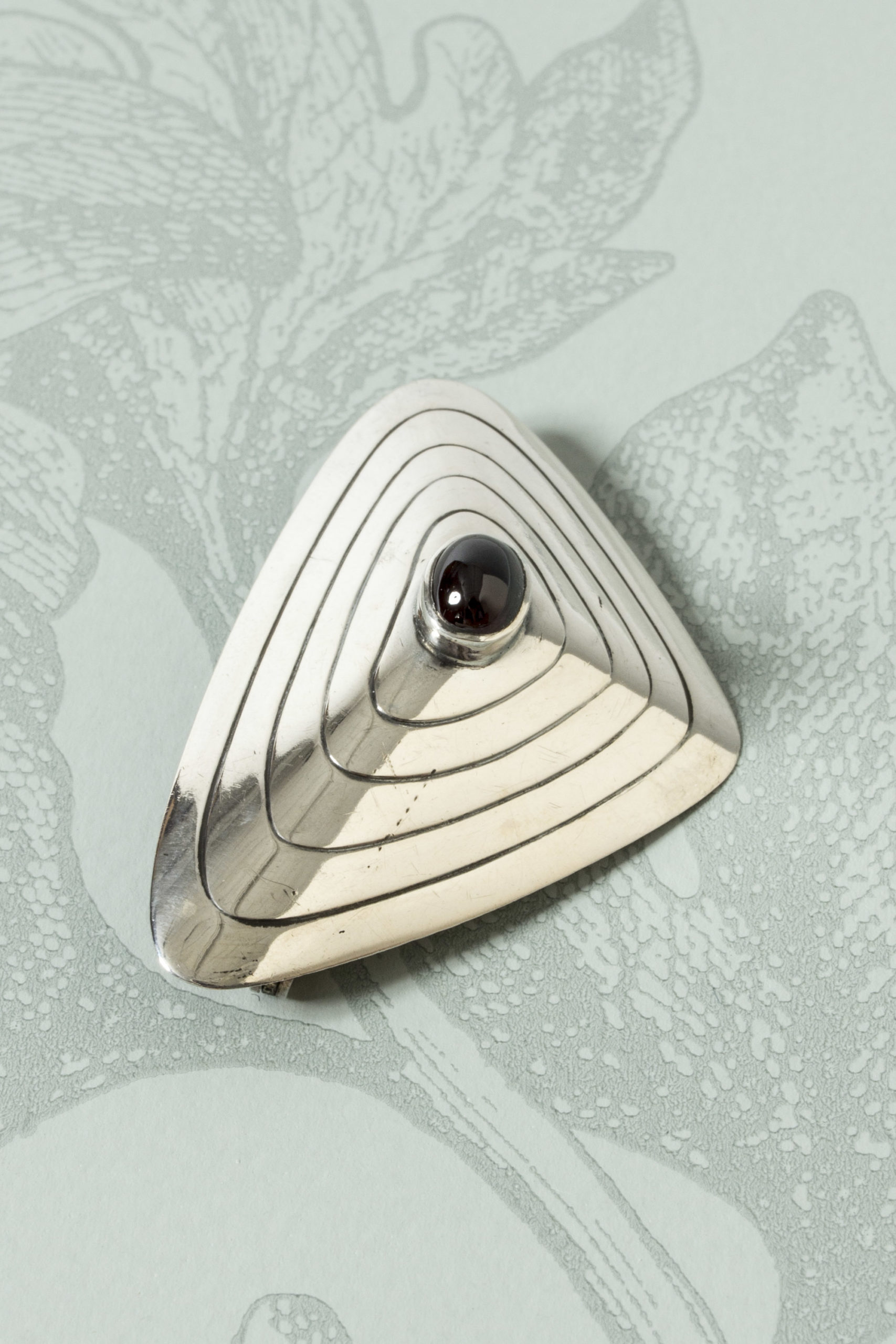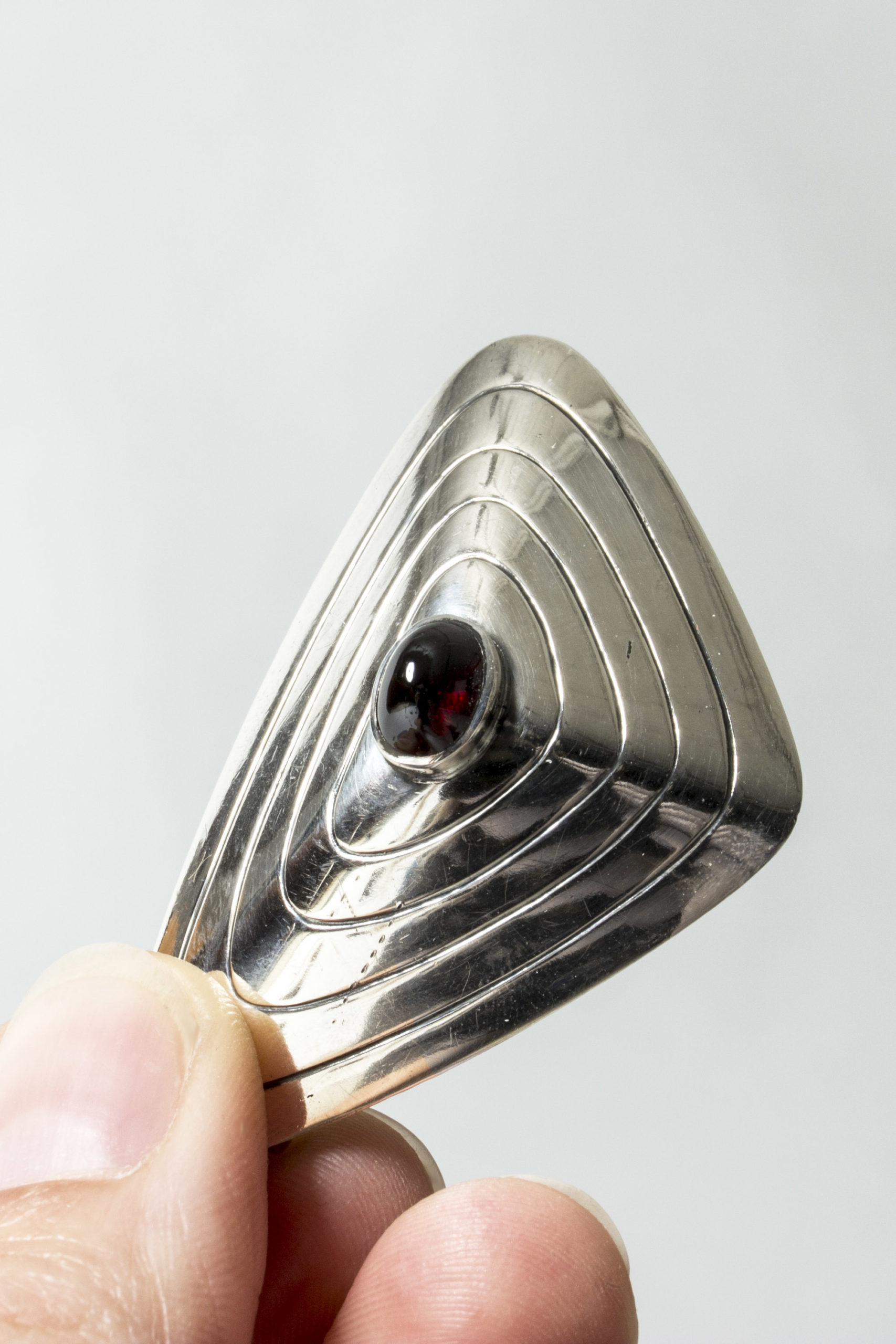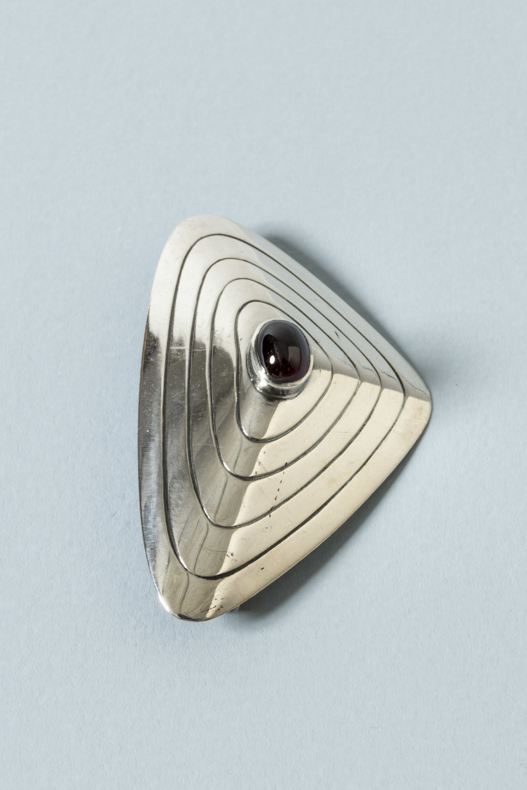 Silver brooch by Sven-Arne Gillgren, with a deep red, oval garnet in the middle. Skewed, triangular shape with a graphic pattern.