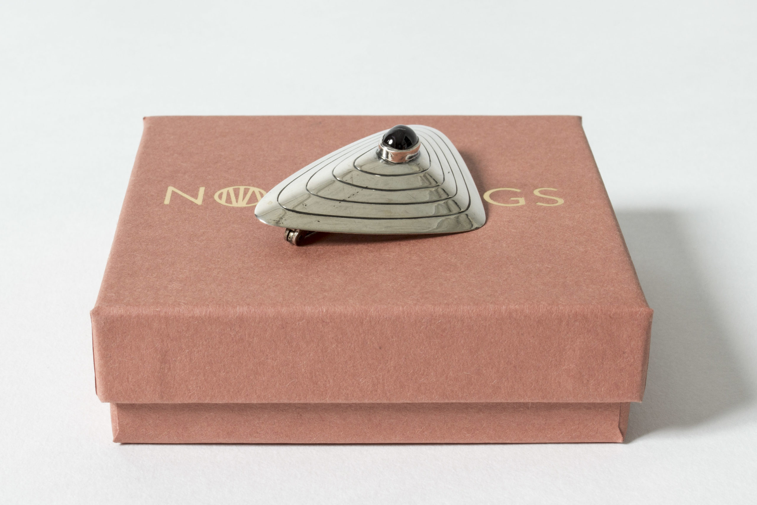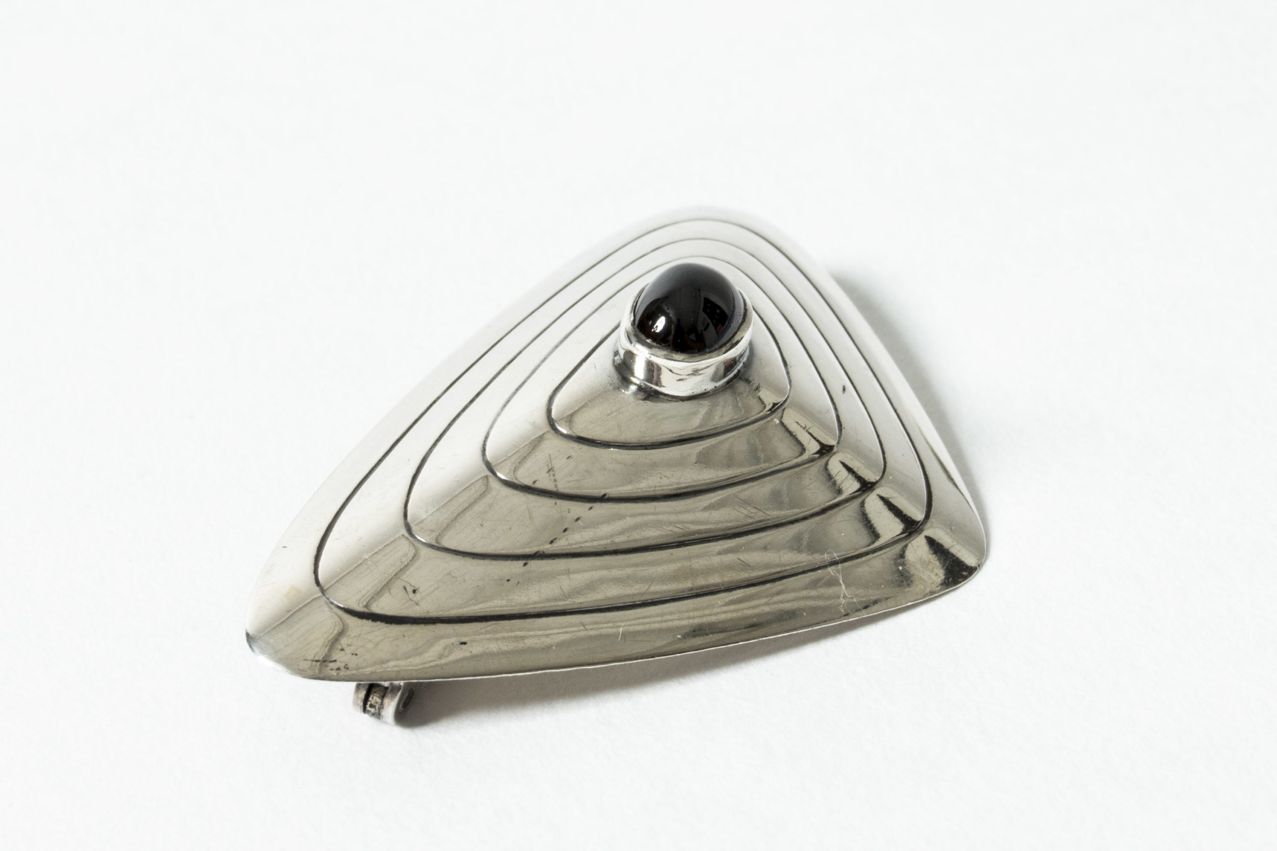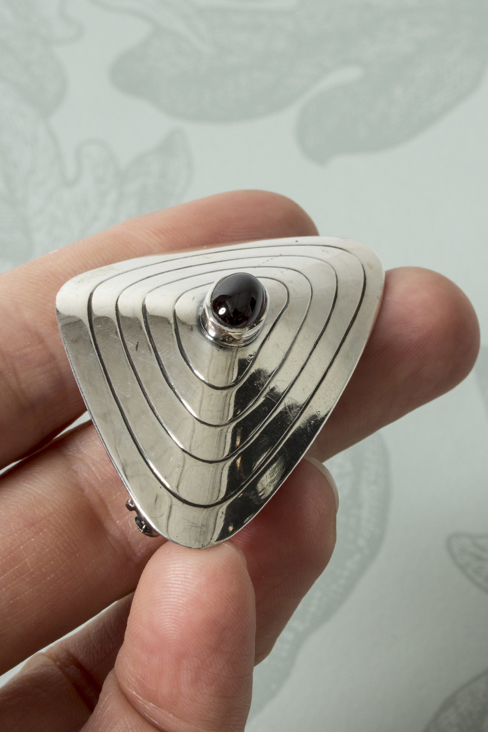 Silver brooch by Sven-Arne Gillgren, with a deep red, oval garnet in the middle. Skewed, triangular shape with a graphic pattern.