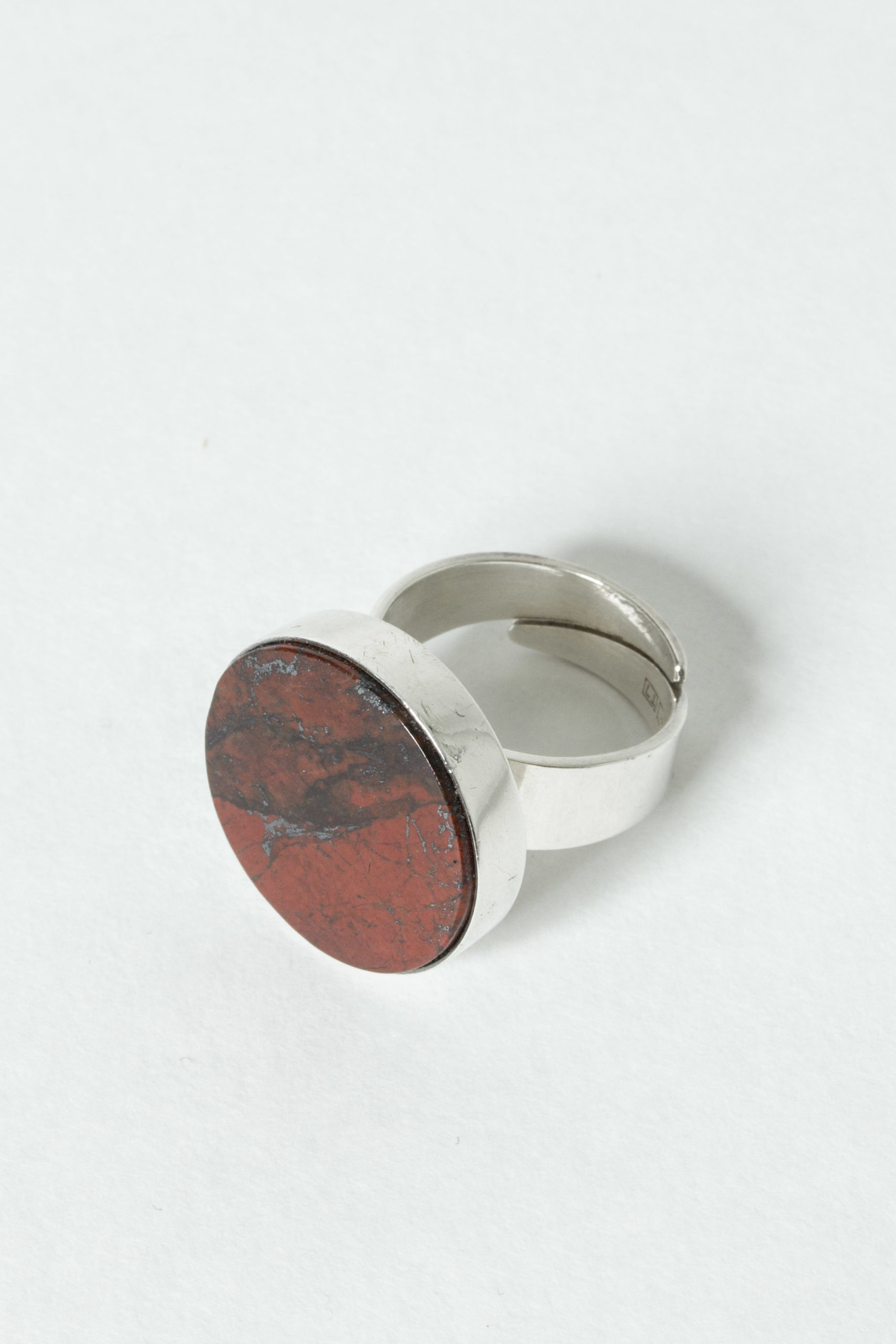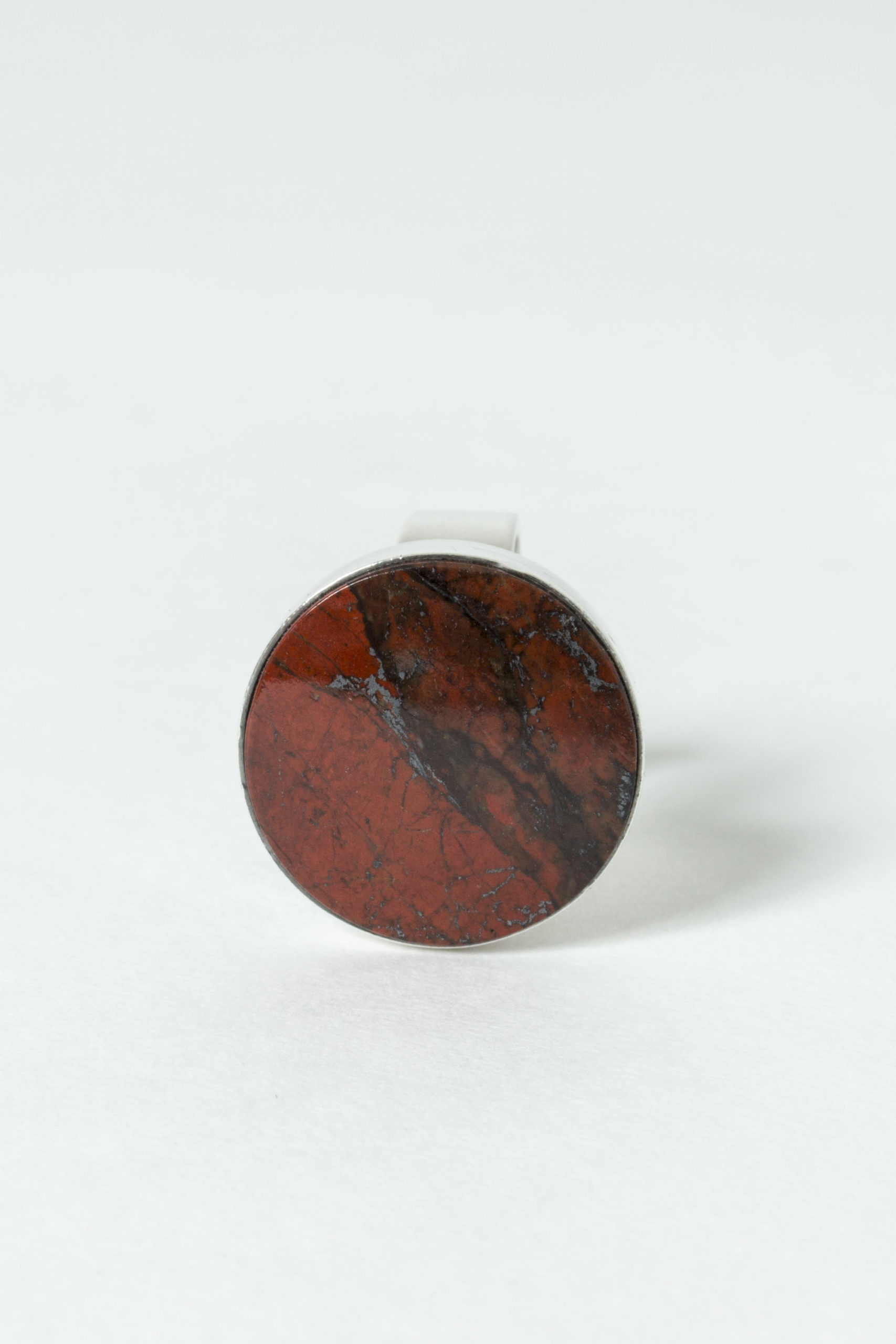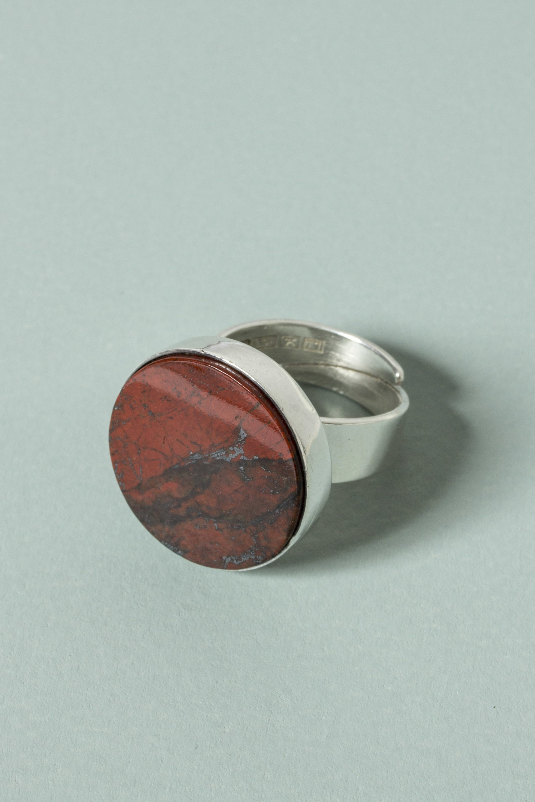 Striking silver ring from Kultateollisuus Ky, with a large, smoothly cut jaspis sphere. Deep red color with black veins.
