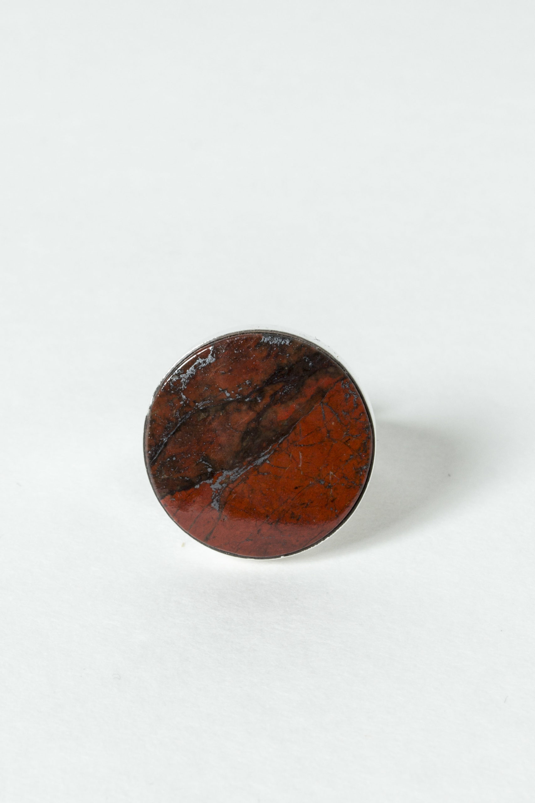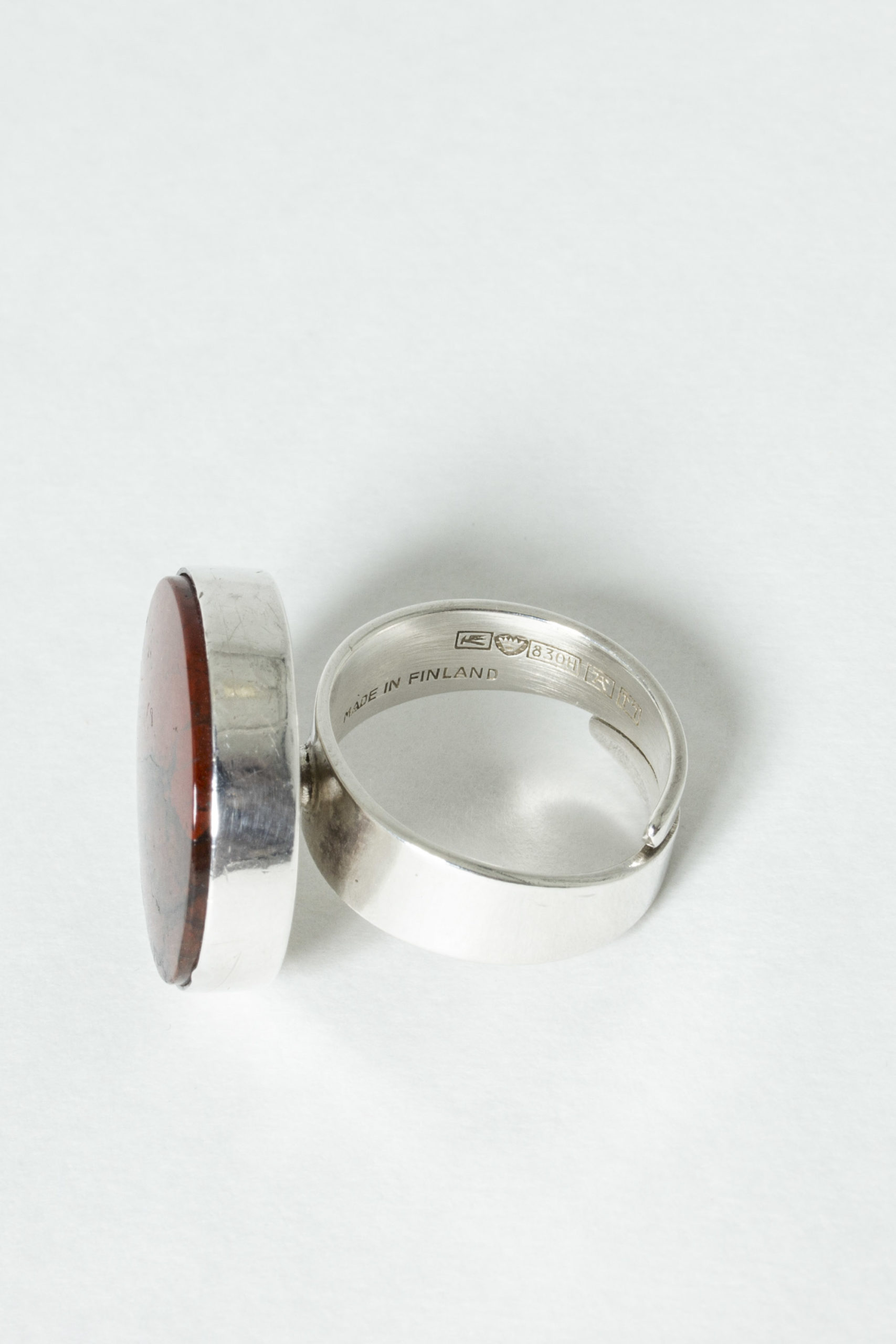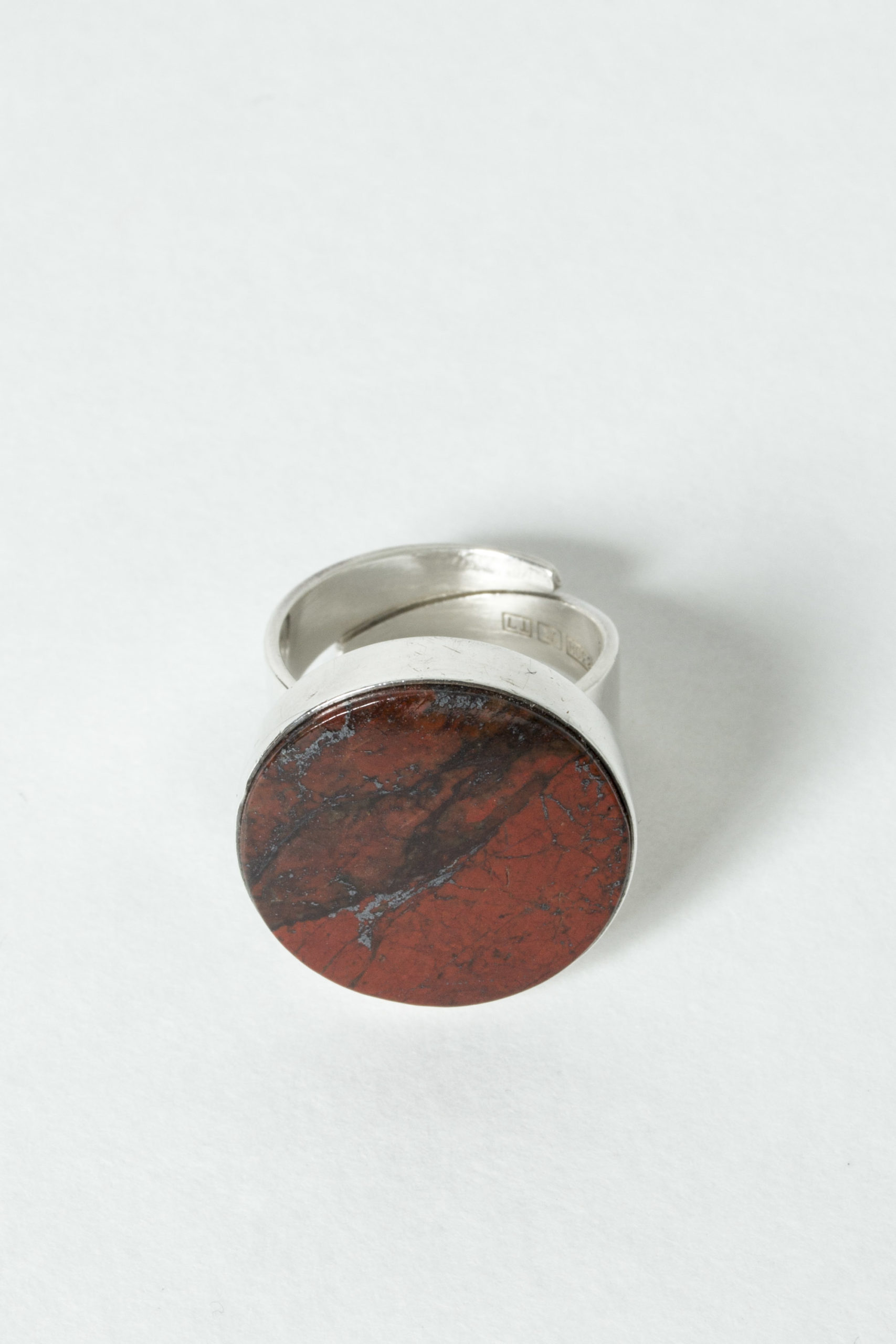 Striking silver ring from Kultateollisuus Ky, with a large, smoothly cut jaspis sphere. Deep red color with black veins.