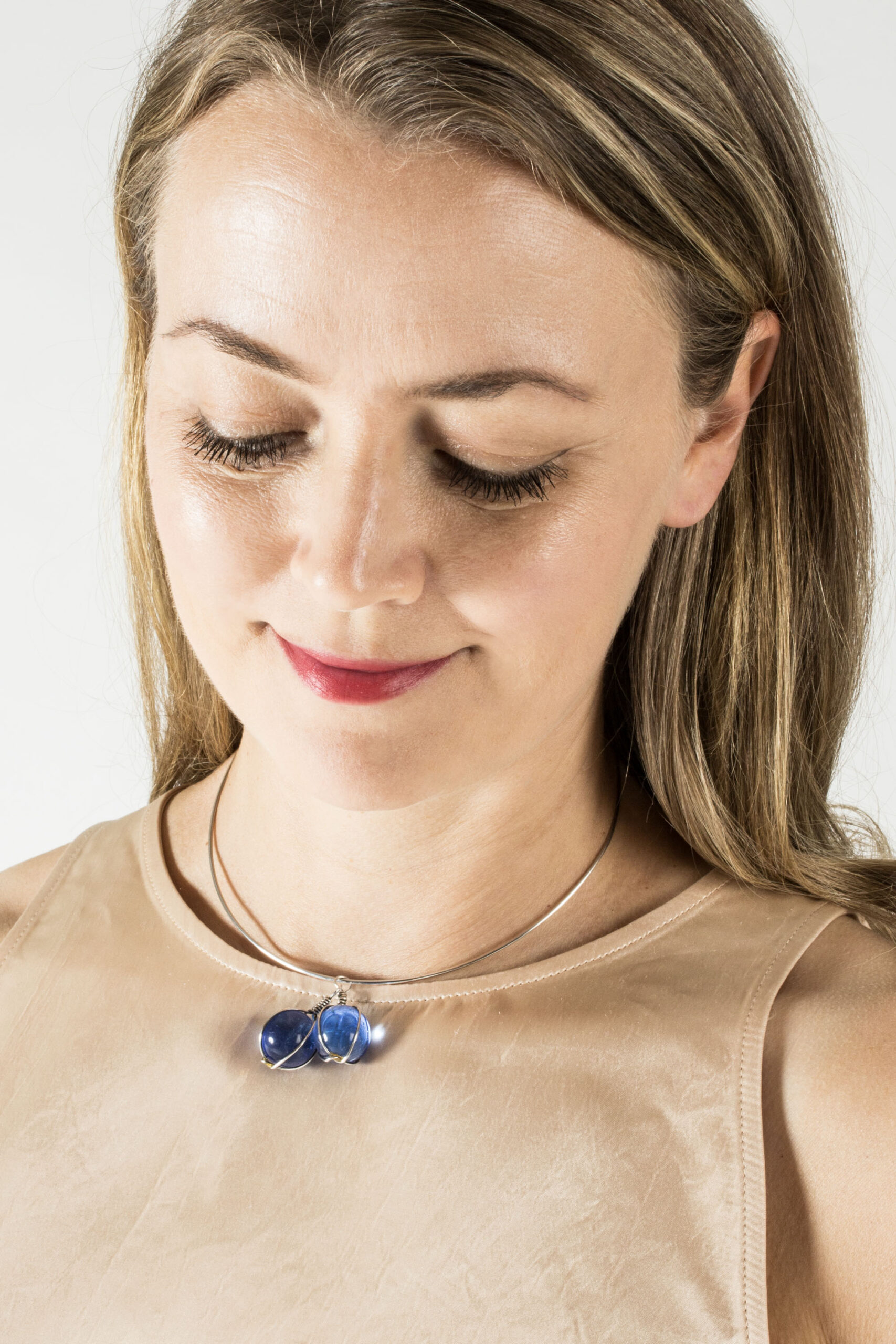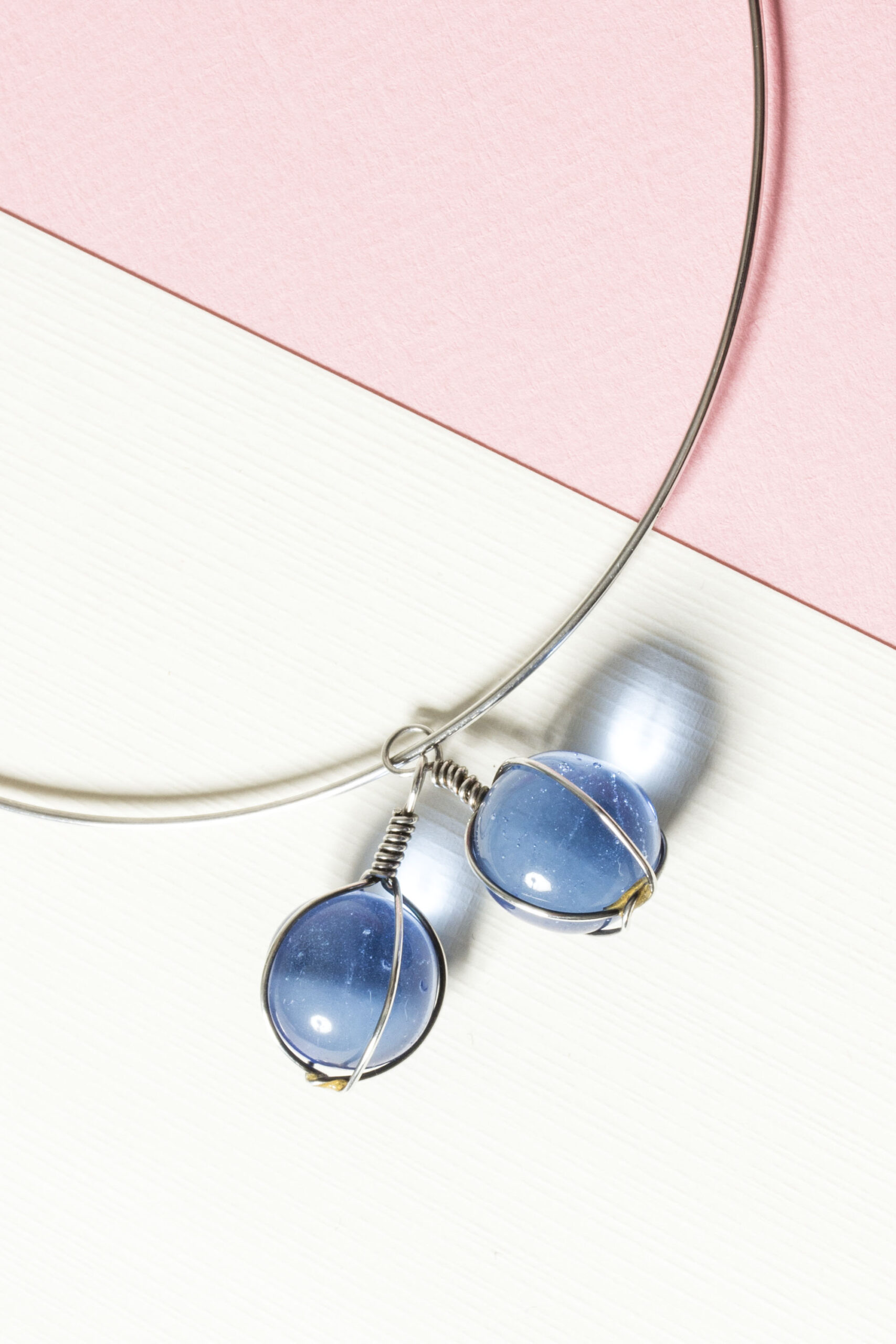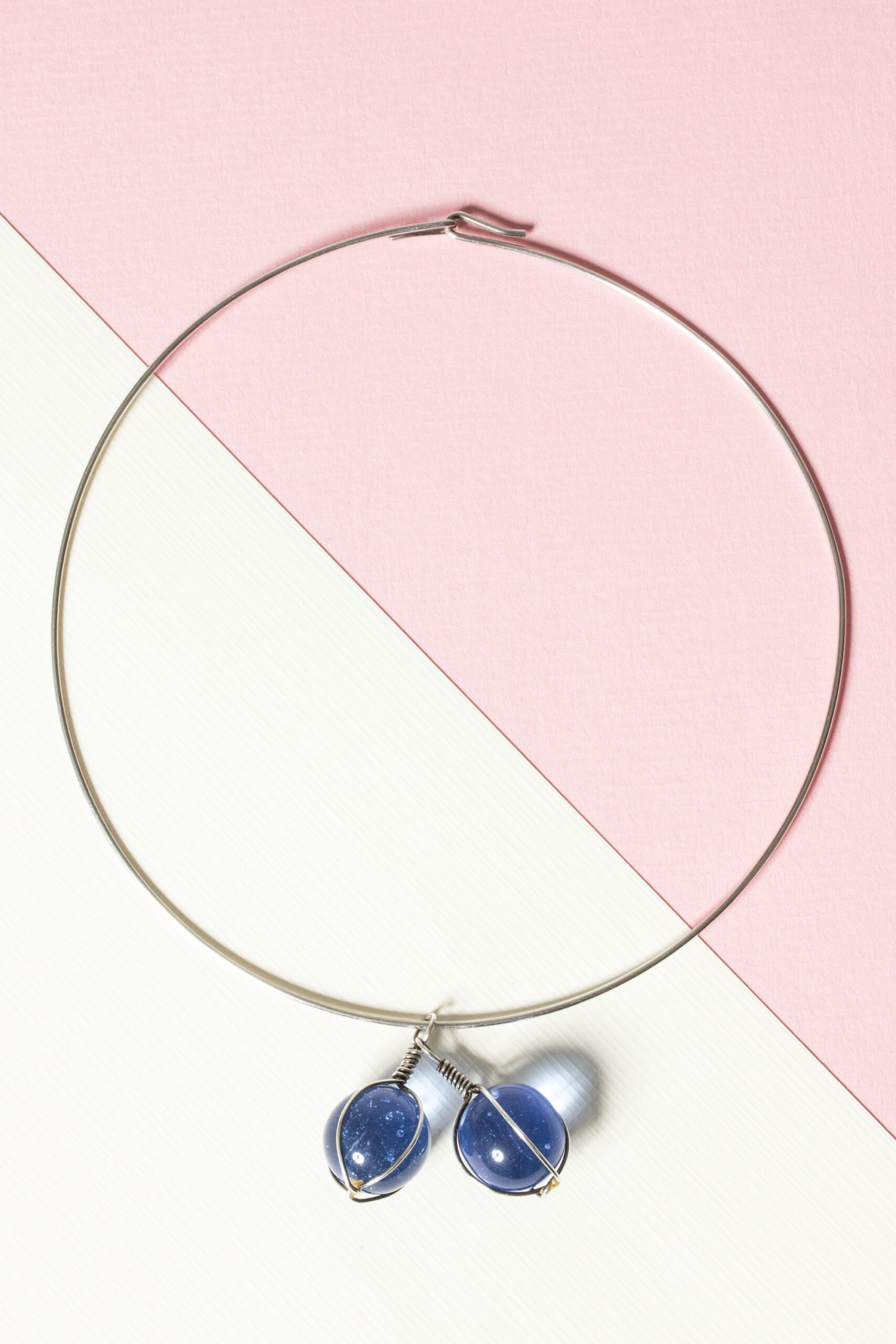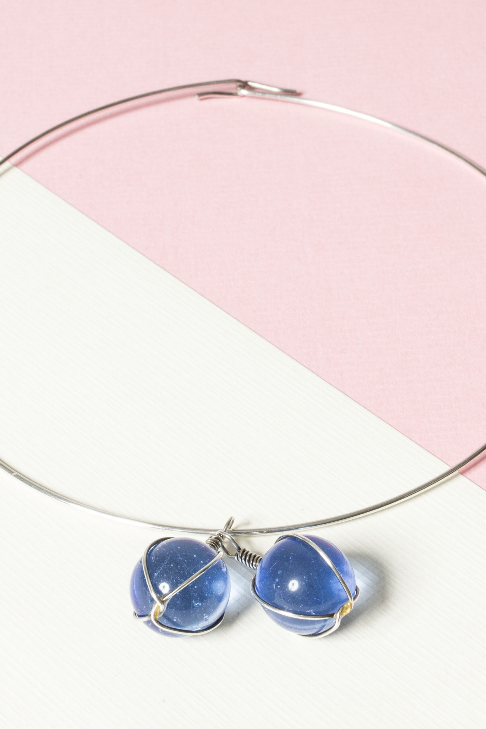 Silver neckring by Bent Knudsen, in an original, playful design. Two blue glass marbles caught in silver wire are suspended from the neckring.