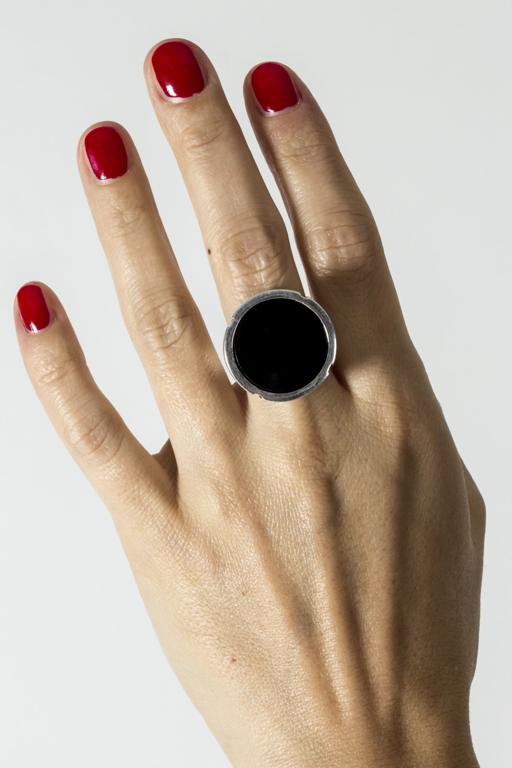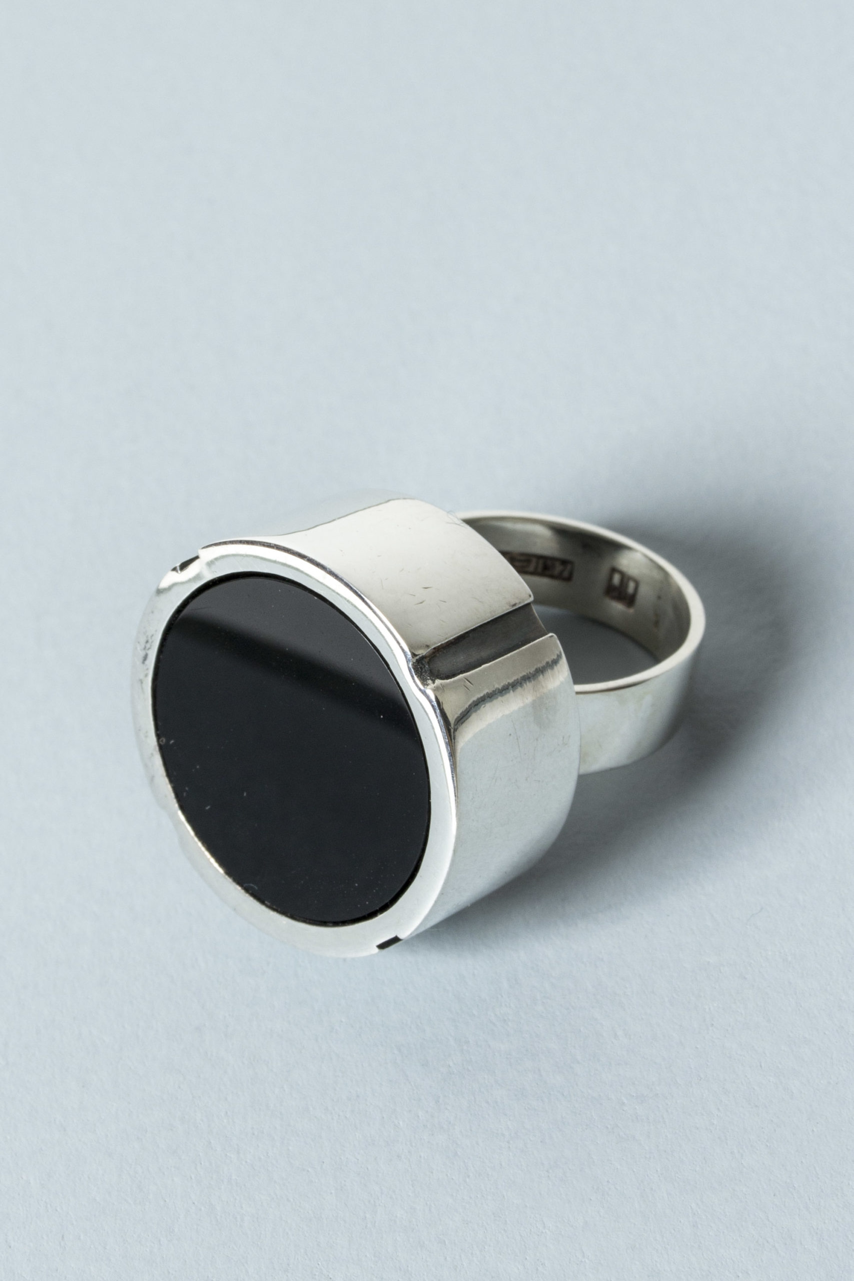 Striking silver ring by Heikki Kaksonen, in an oversized design. Smooth, round onyx stone, smooth and expressive look.