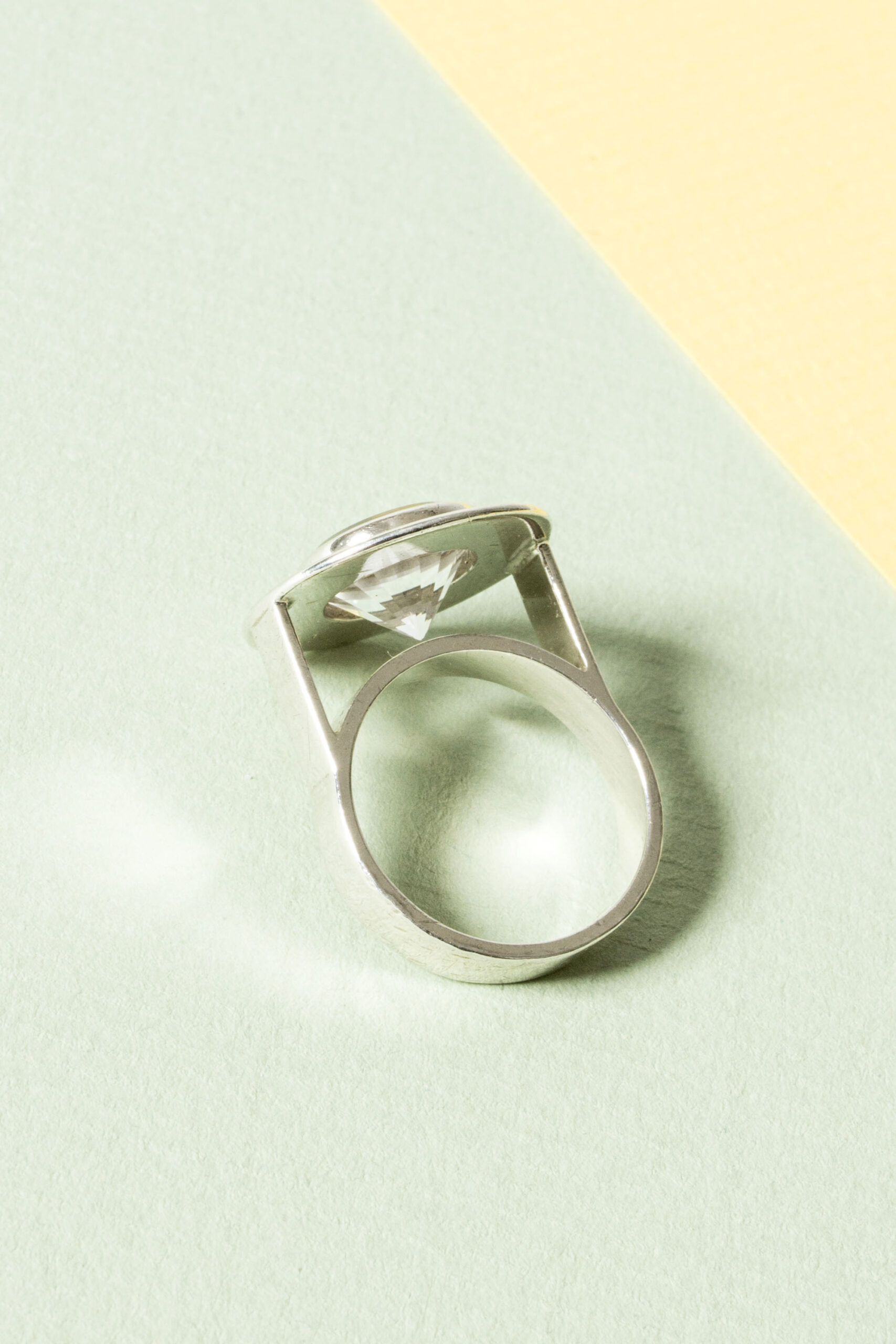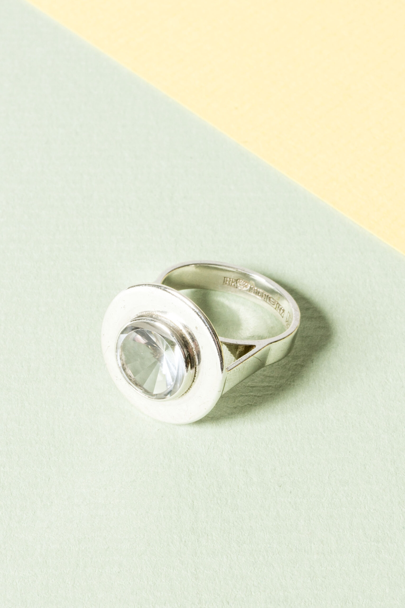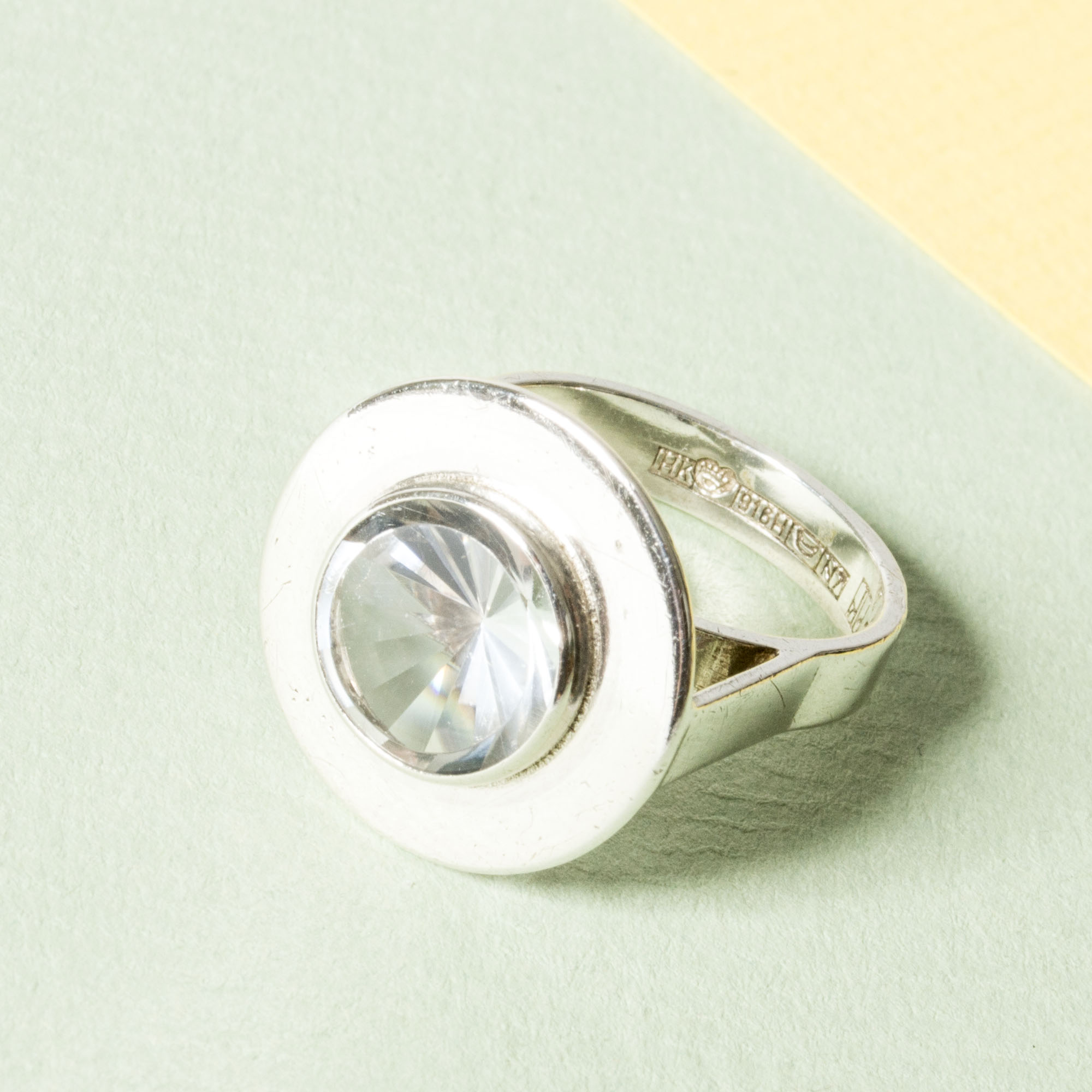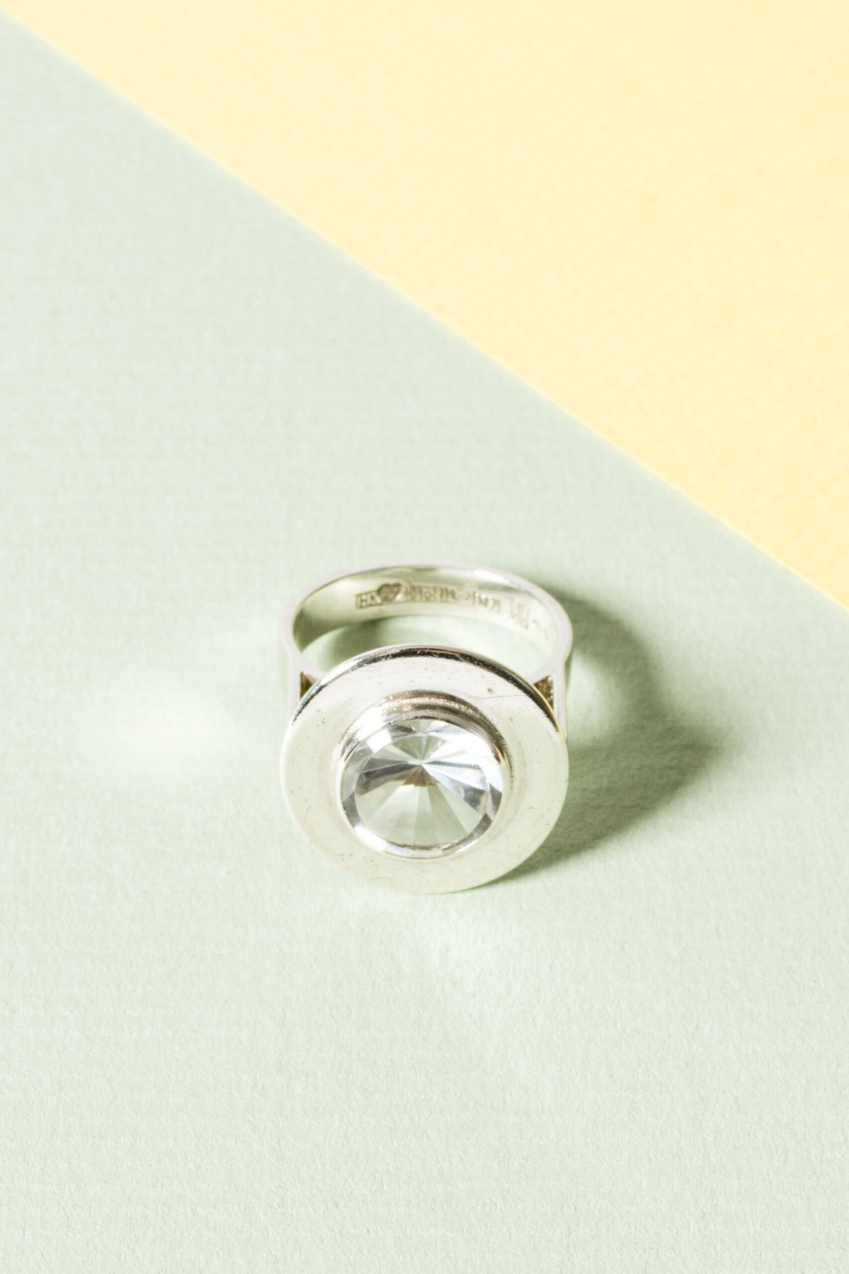 Striking silver ring by Heikki Kaksonen with a round platform elevated from the band, enclosing a rock crystal. Cool cut of the stone.