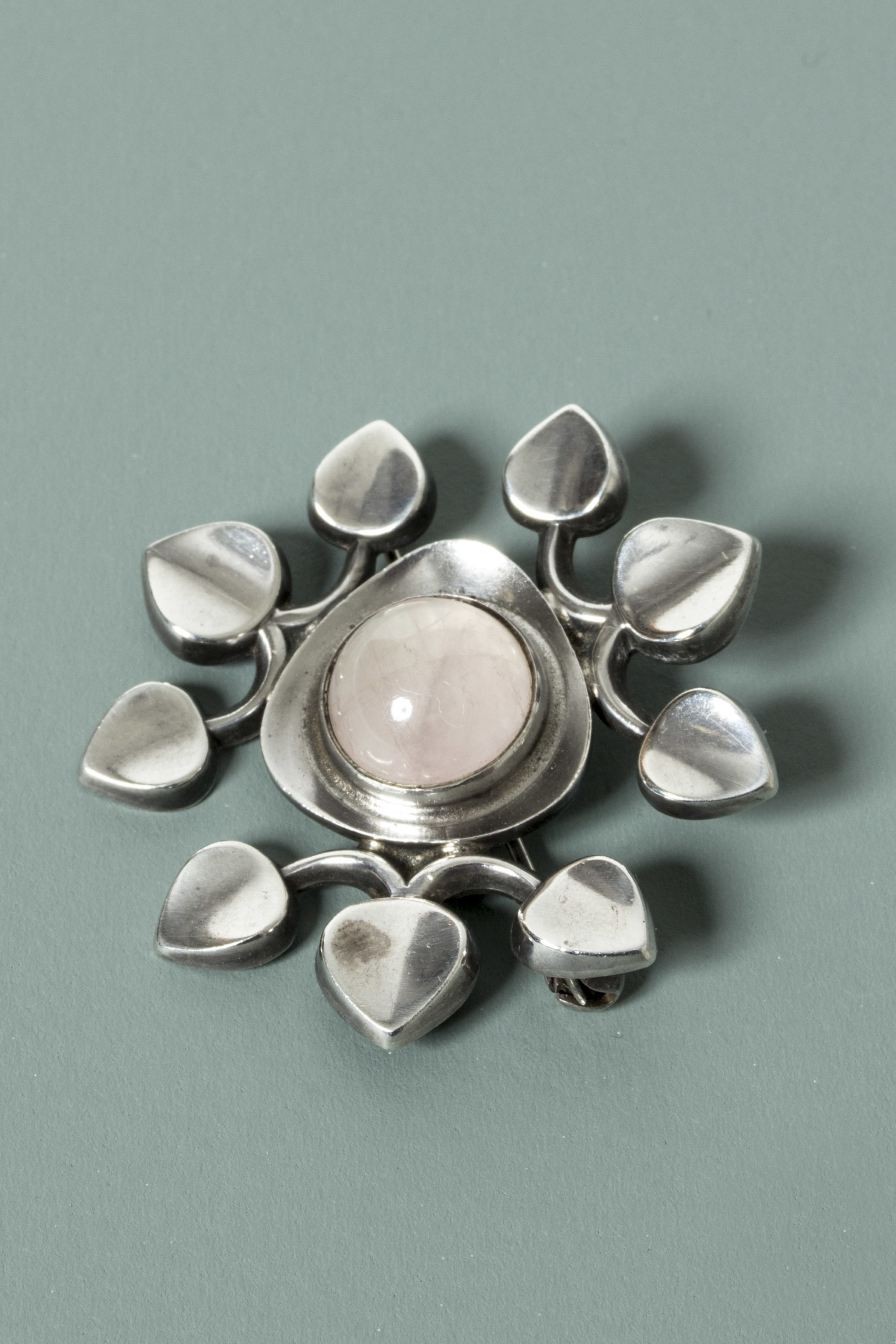 Gorgeous silver brooch from Atelier Borgila, in a crisp stylized flower design. Lovely, round rose quartz stone in the center.