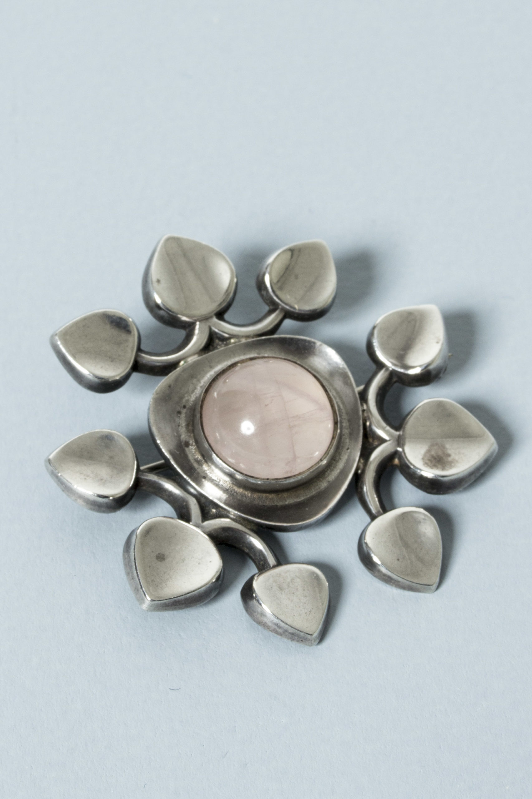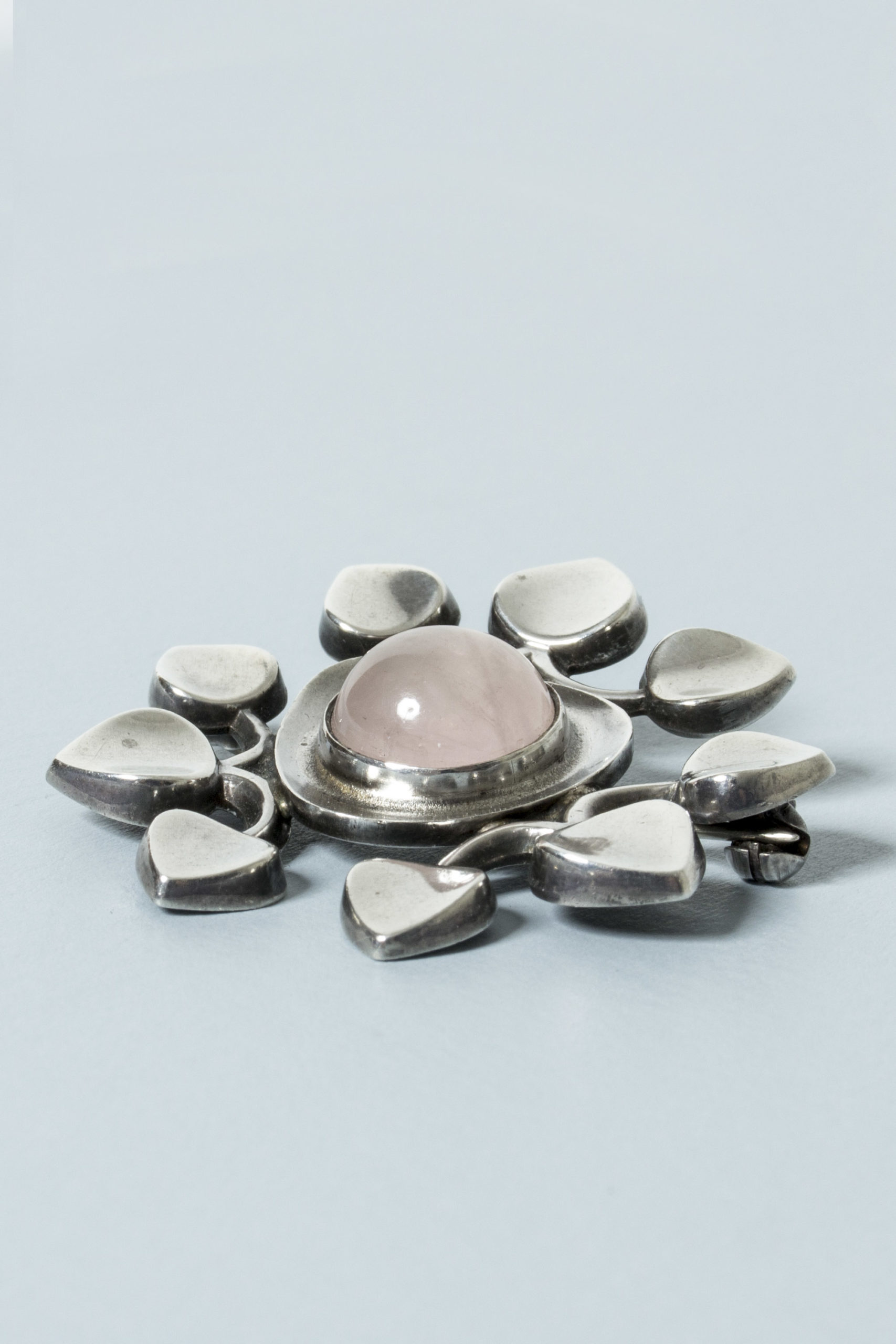 Gorgeous silver brooch from Atelier Borgila, in a crisp stylized flower design. Lovely, round rose quartz stone in the center.