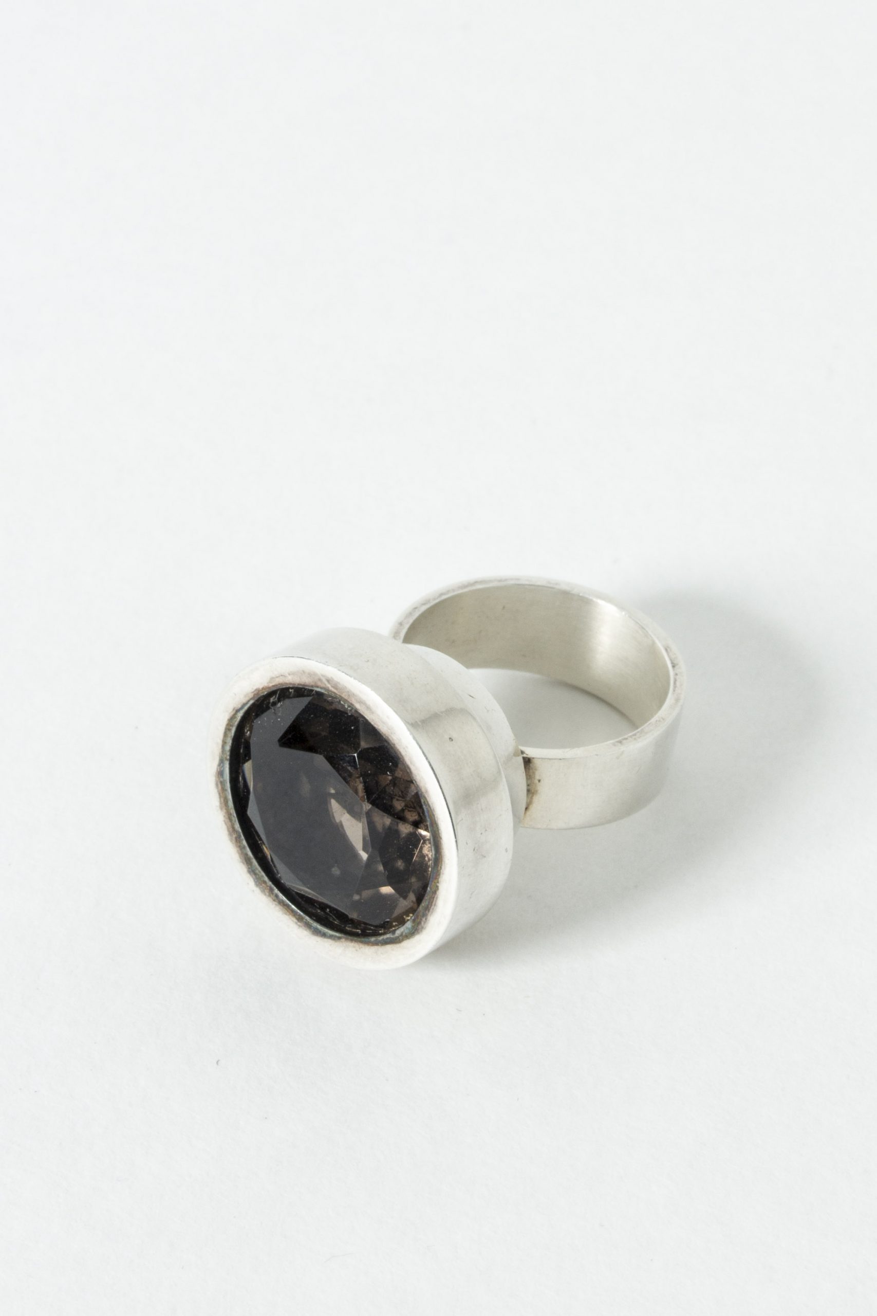 Amazing silver ring by Elis Kauppi, with a large smoke quartz stone set in a smooth round frame. Very nice sheen and movement in the stone from the facets.