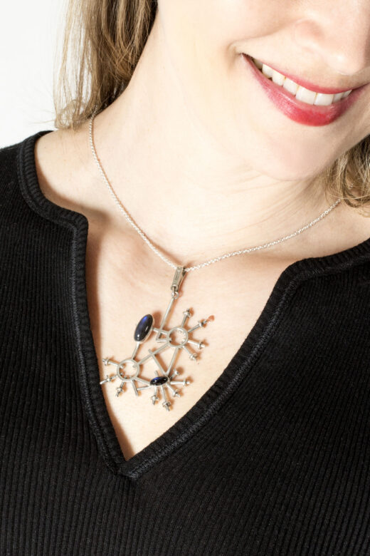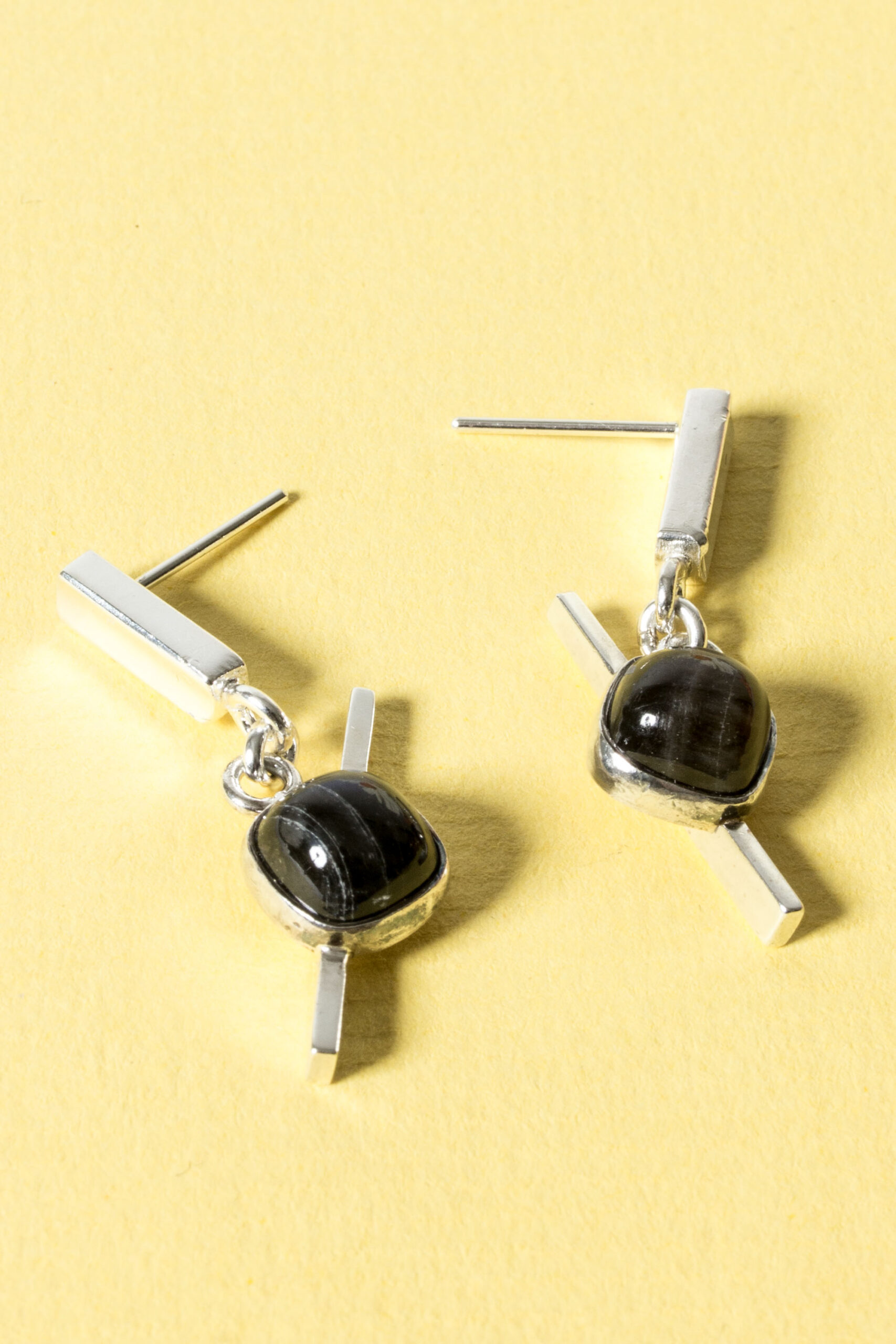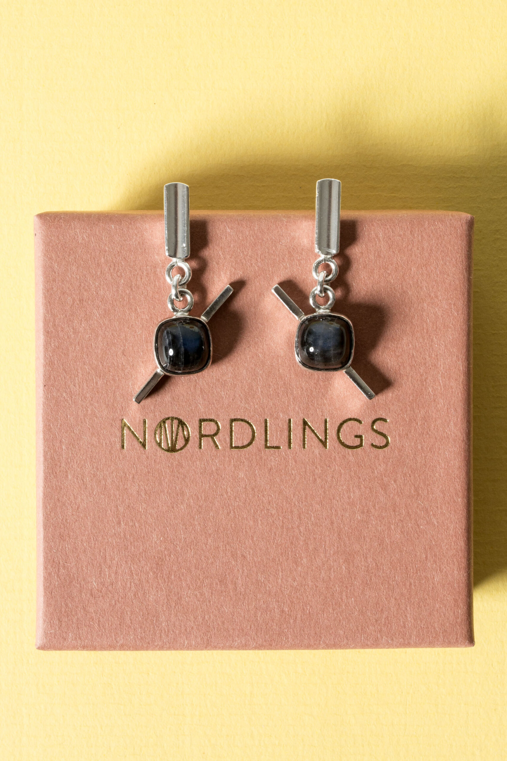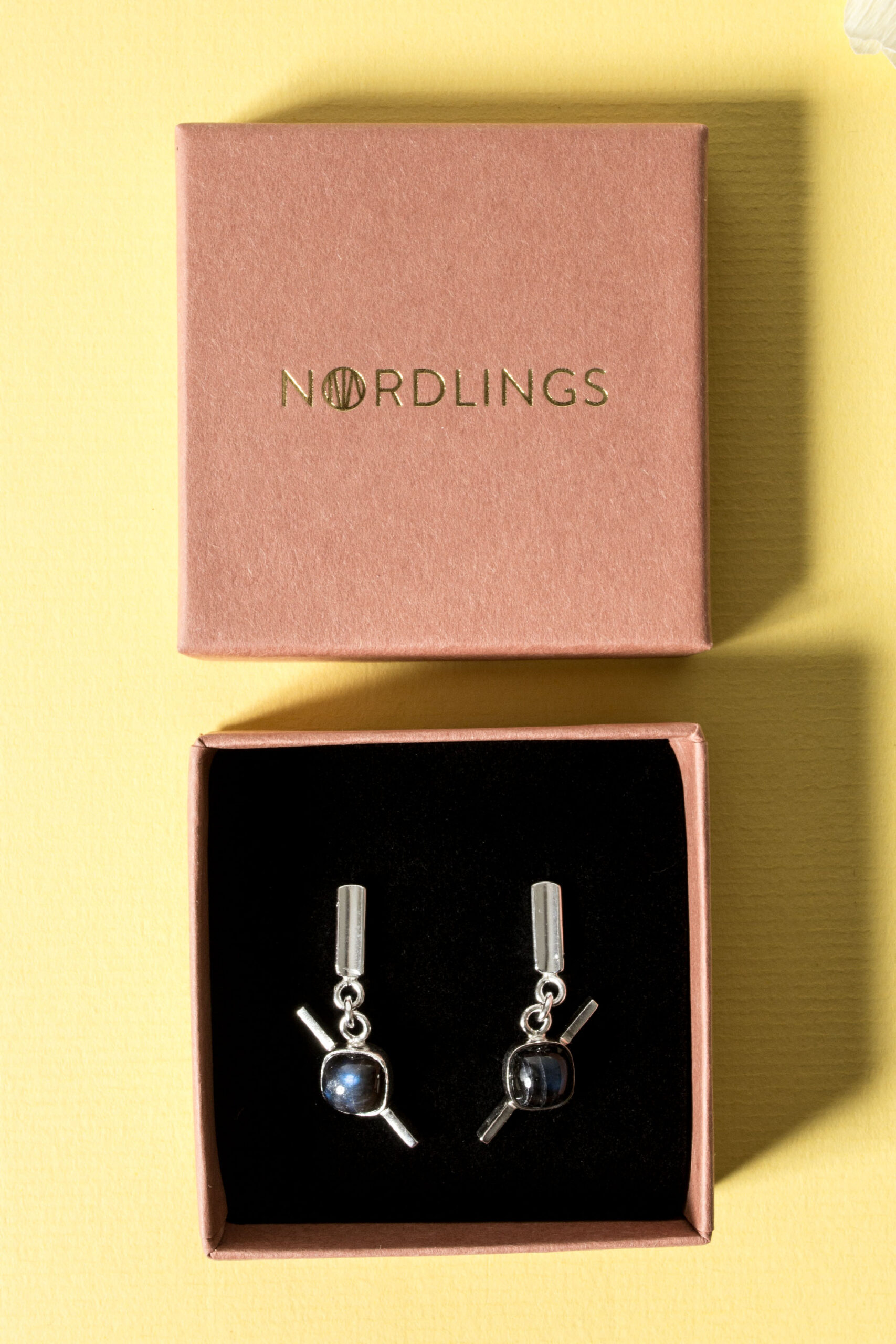 Silver earrings with spectrolite stones by Claës Giertta. Cool brutalist design with a spiky look.