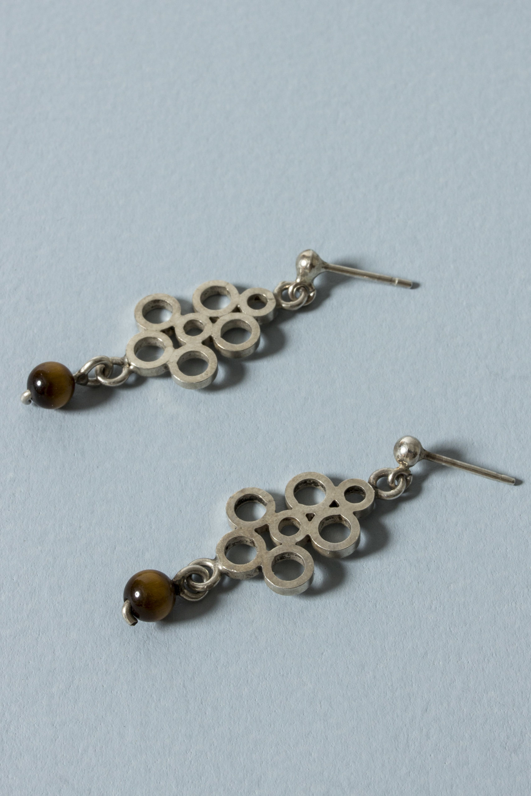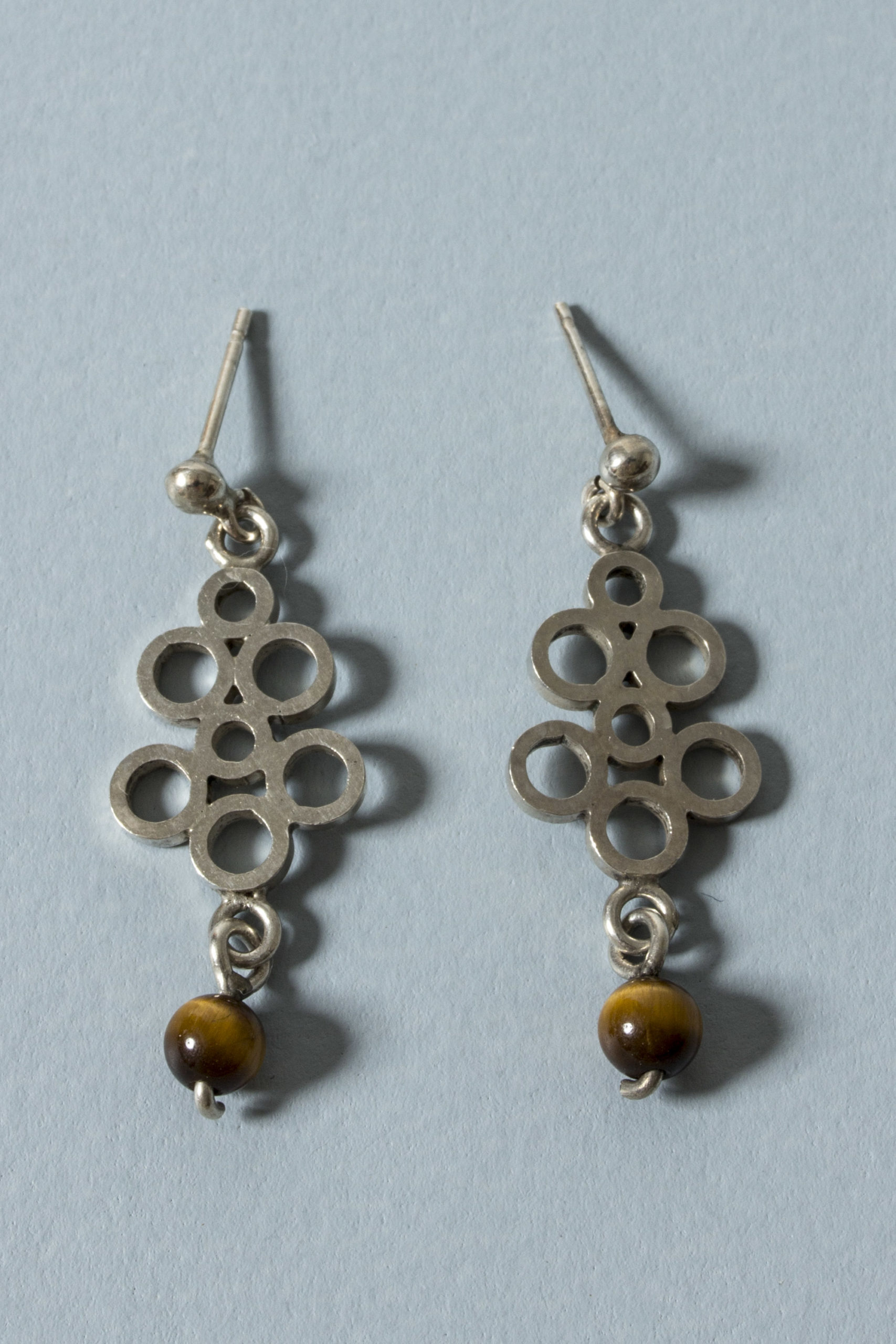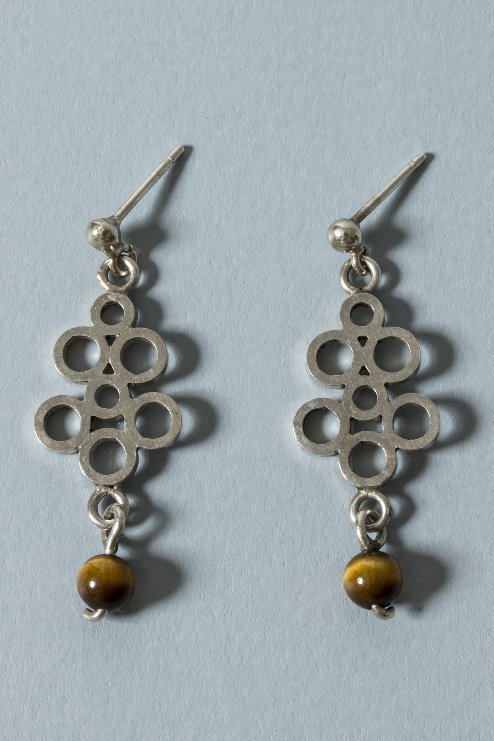 Pair of cool silver earrings by Cecilia Johansson, in a neat size. A cluster of silver circles make up the design, with small round cut tigereye stones hanging from the ends.