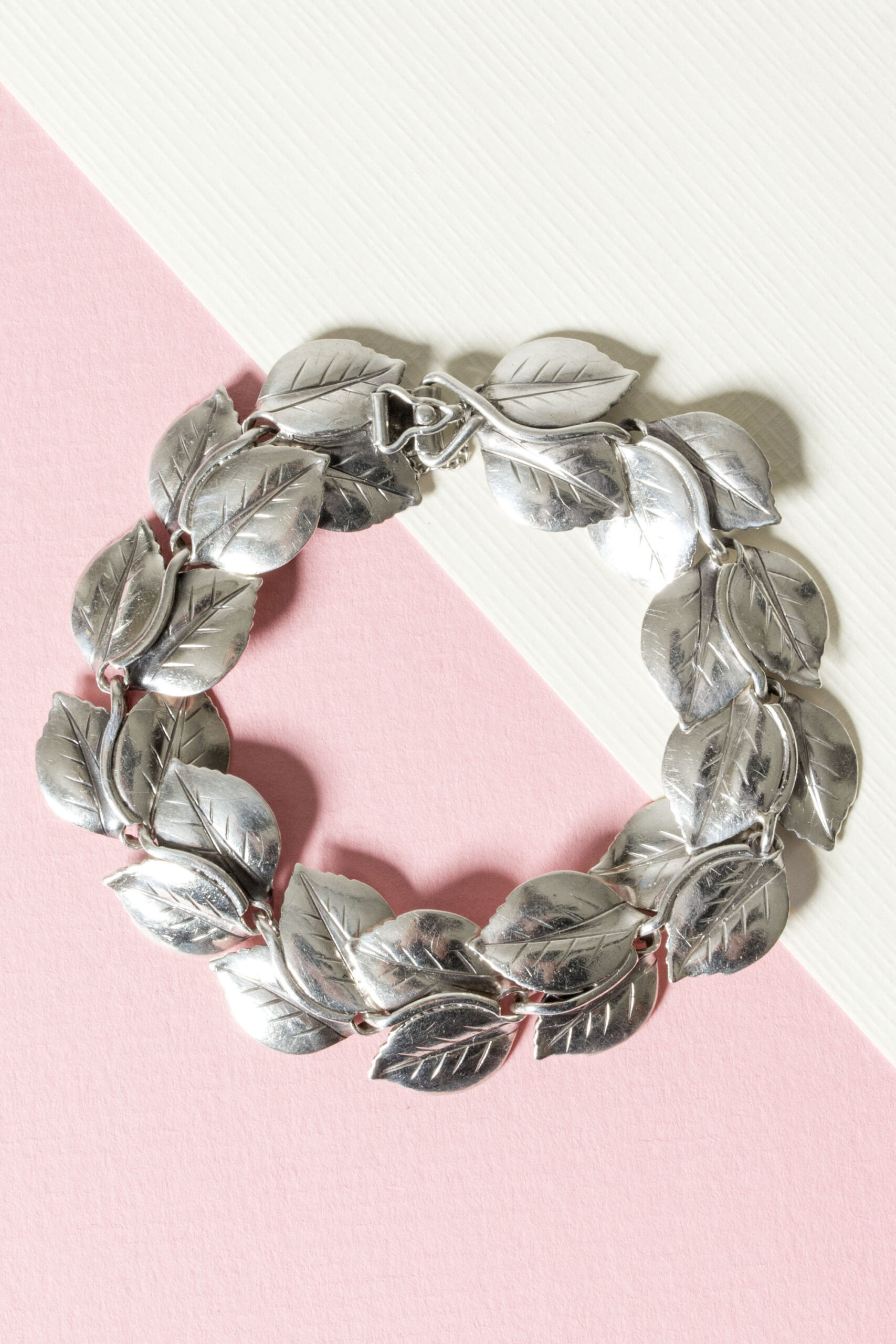 Exquisite silver bracelet by Gertrud Engel, with overlapping leaves links, carried out in a lifelike, dynamic way. Very decorative around the wrist.