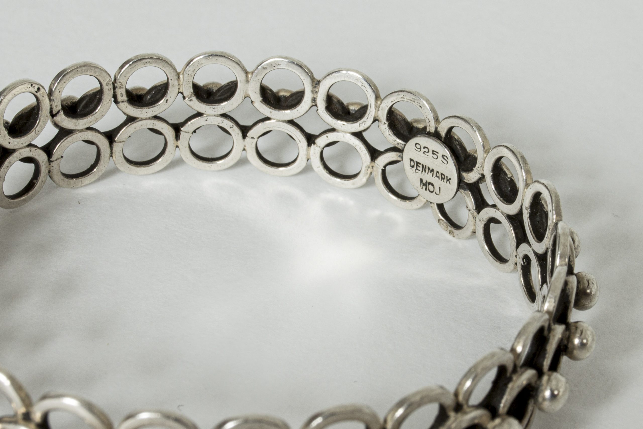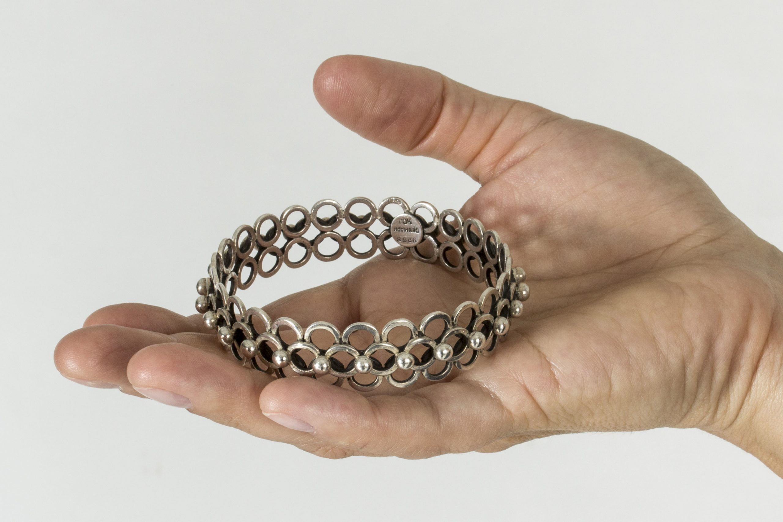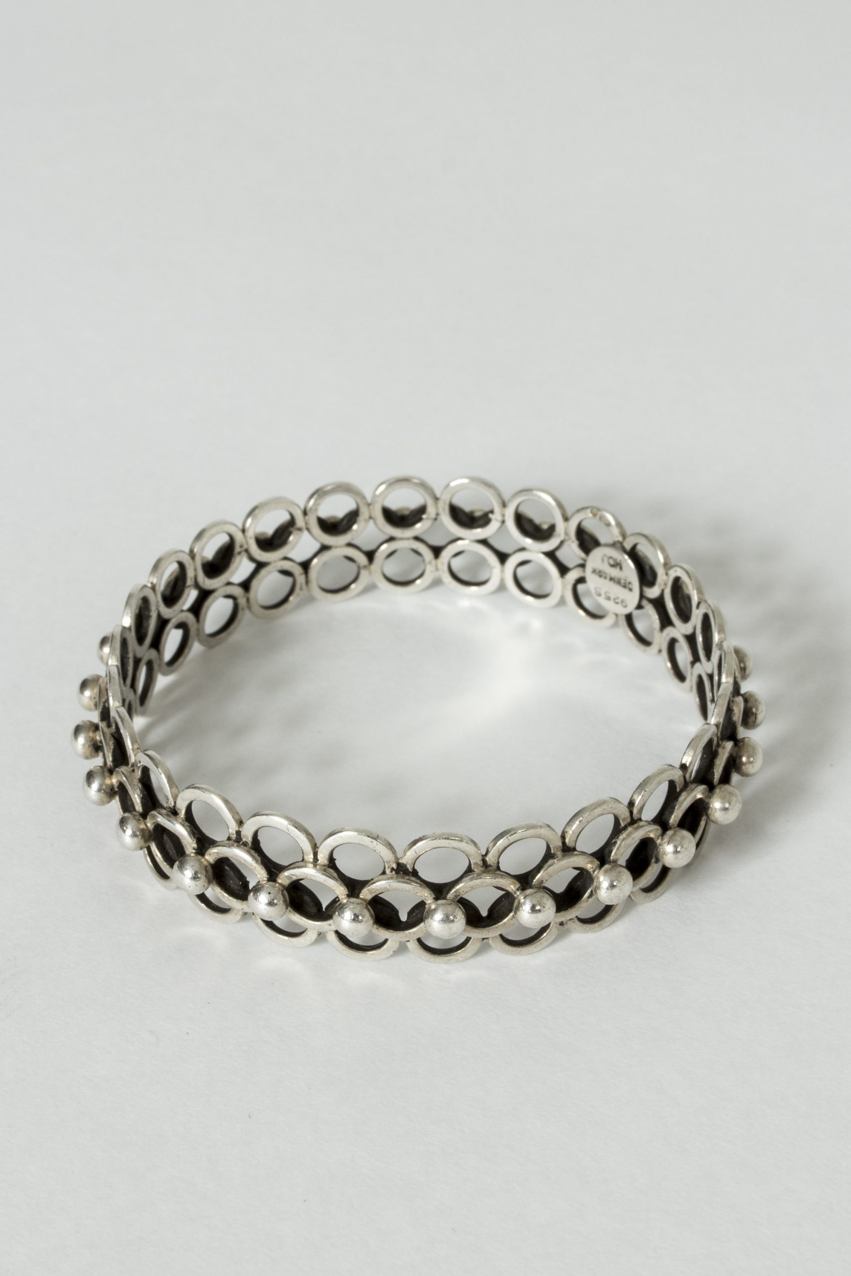 Very elegant silver bracelet by Hermann Ole Jacobsen, in an intricate design of interlocking silver hoops.