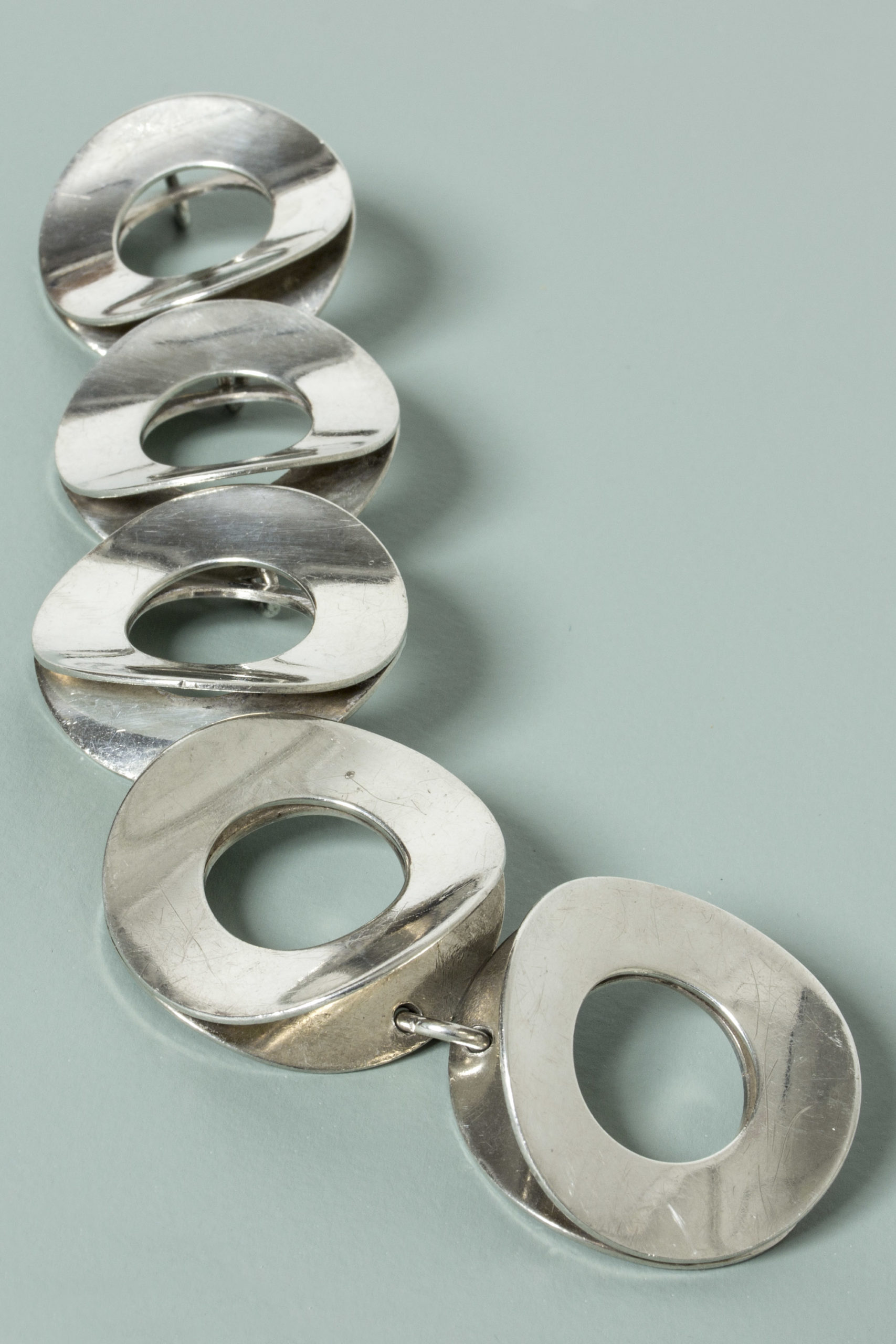 Amazing silver bracelet by Tone Vigeland, in an oversized graphic design of large silver discs. Very expressive, quite heavy yet comfortable around the wrist thanks to the concave form of the discs.