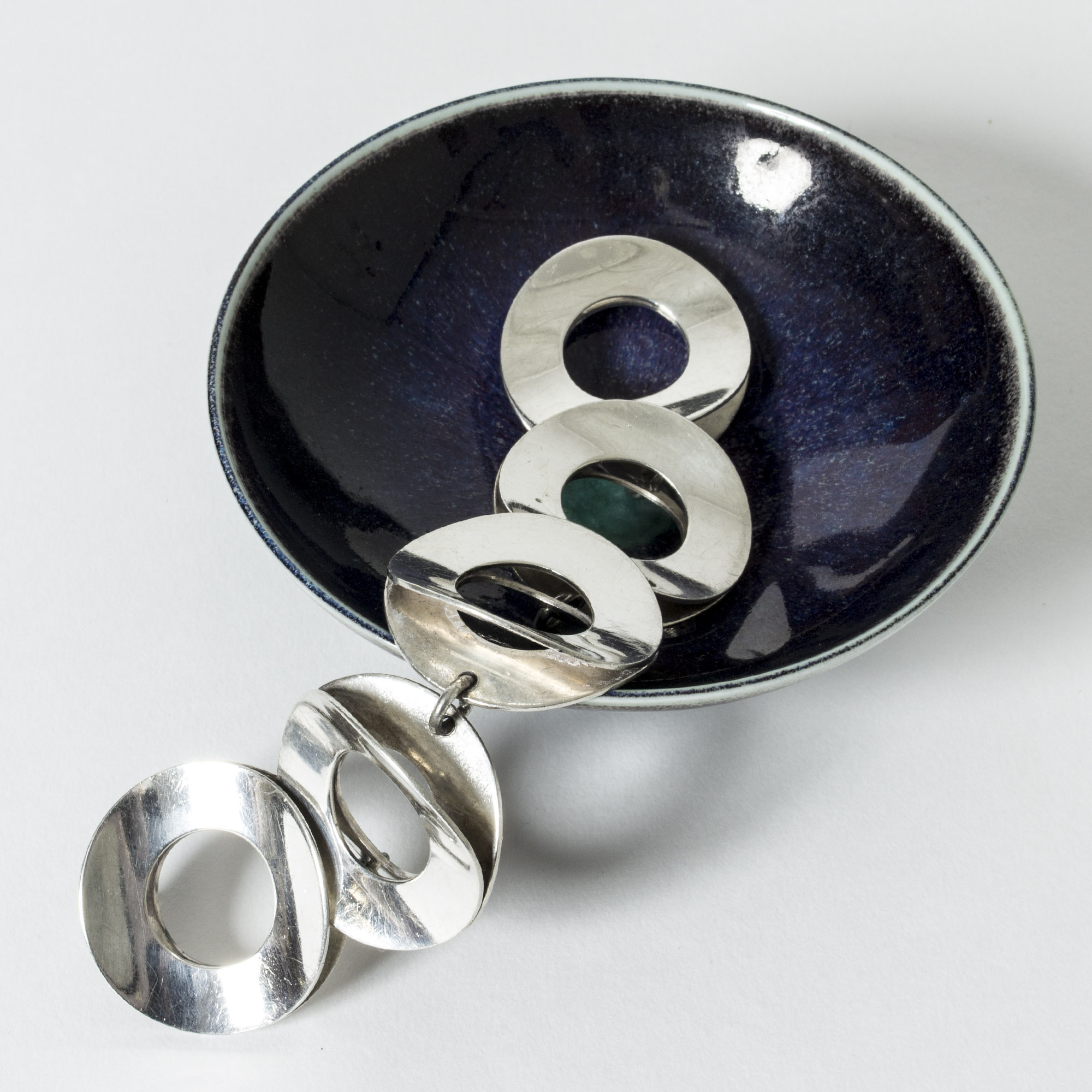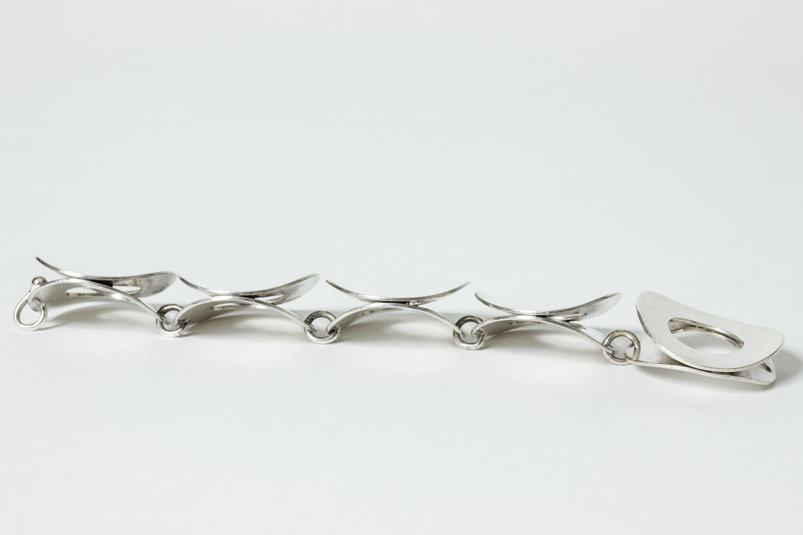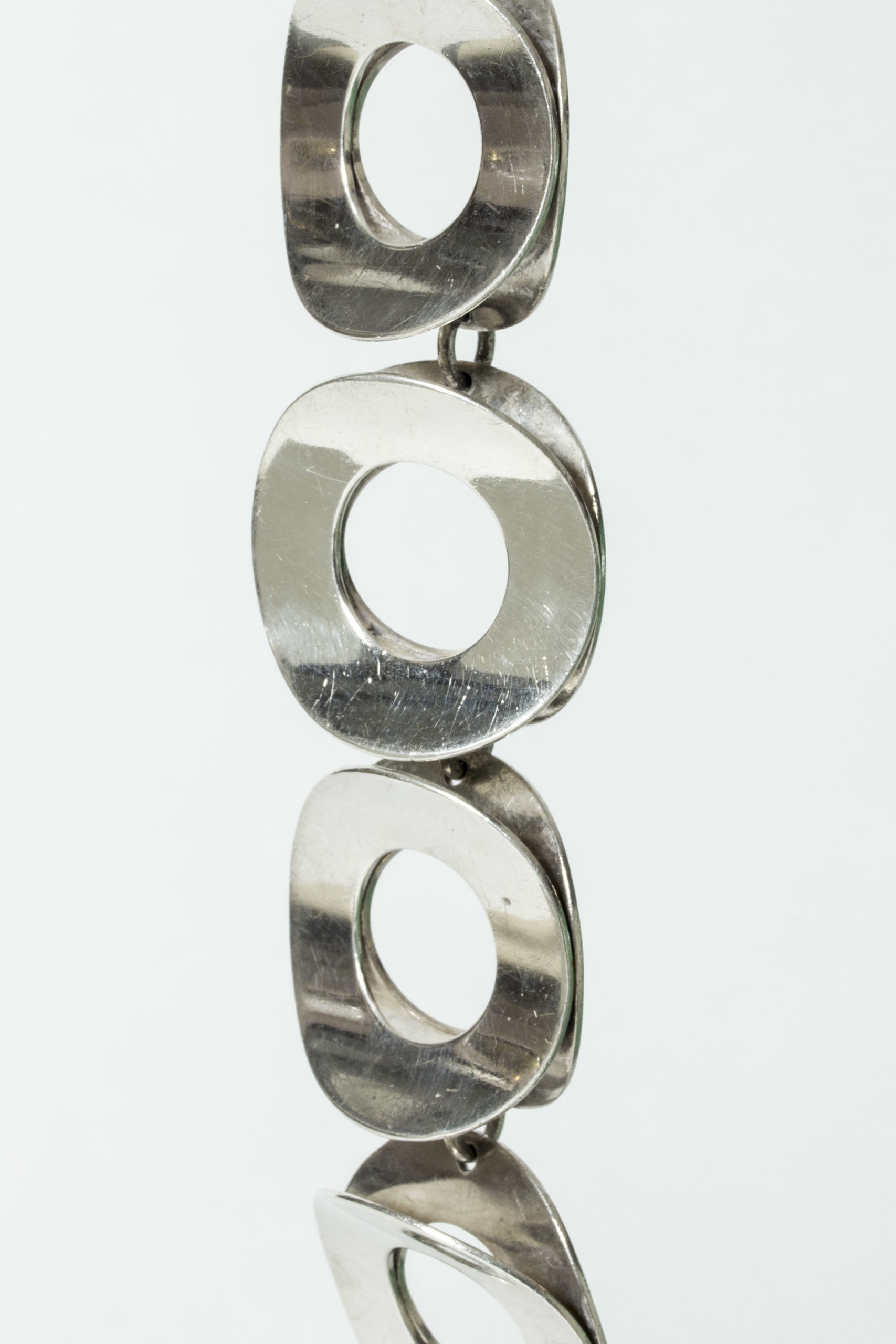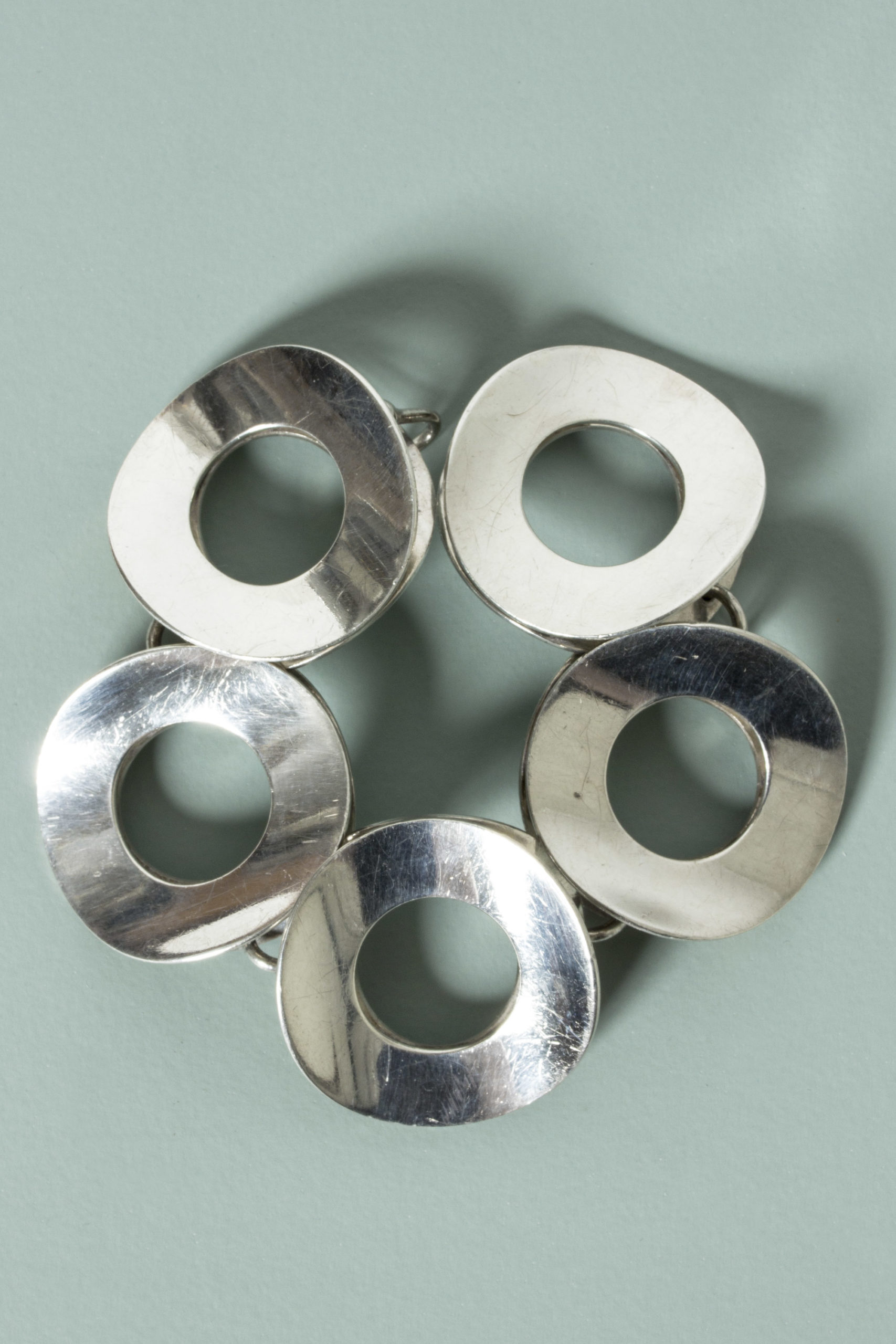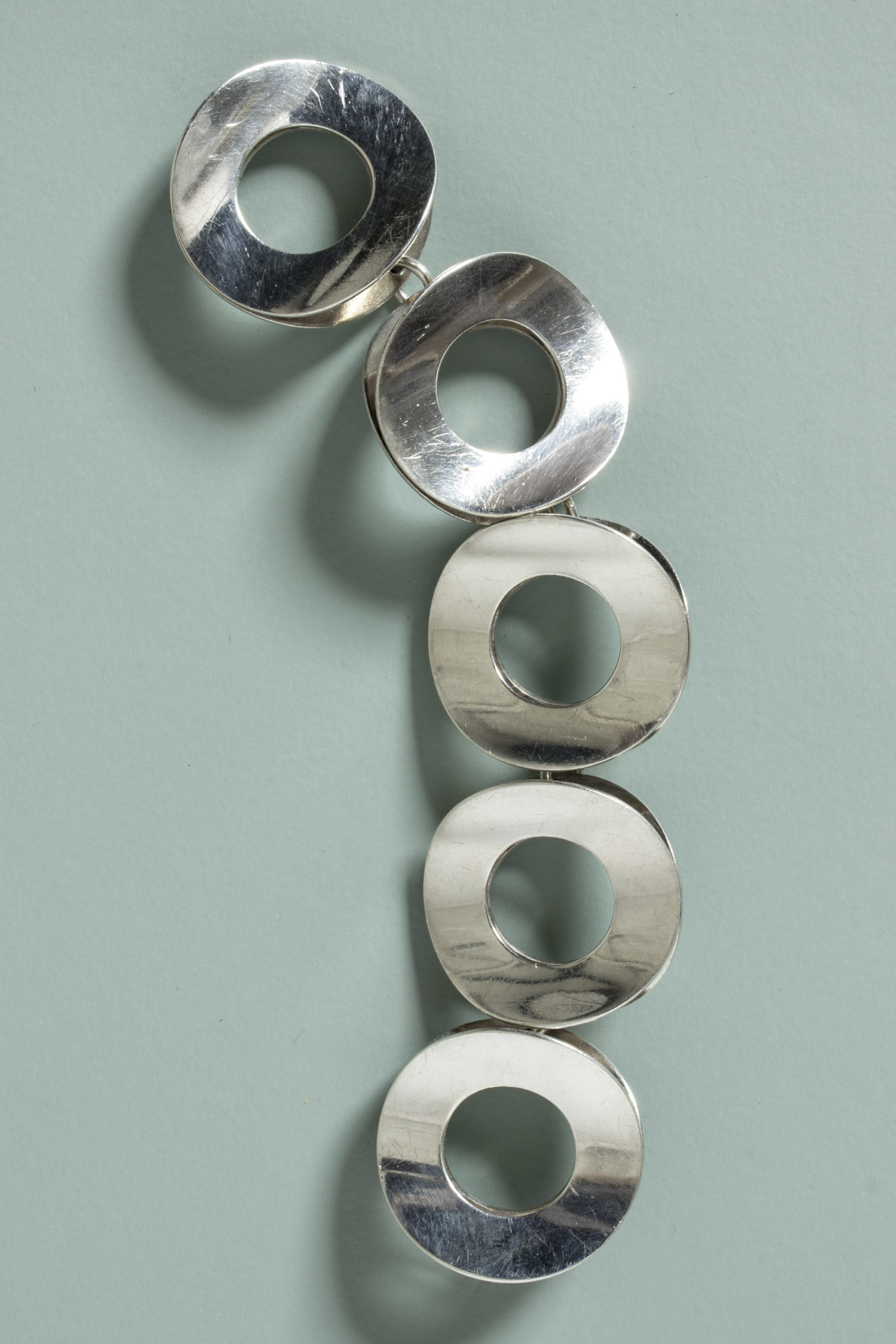 Amazing silver bracelet by Tone Vigeland, in an oversized graphic design of large silver discs. Very expressive, quite heavy yet comfortable around the wrist thanks to the concave form of the discs.
