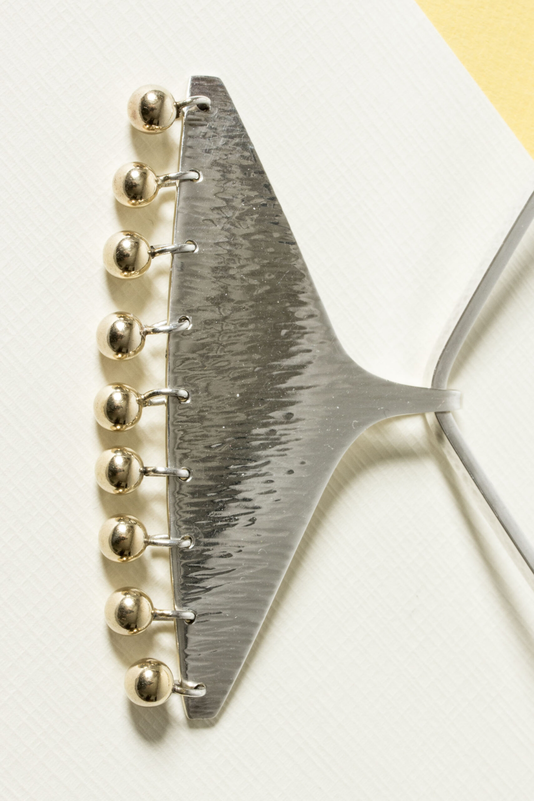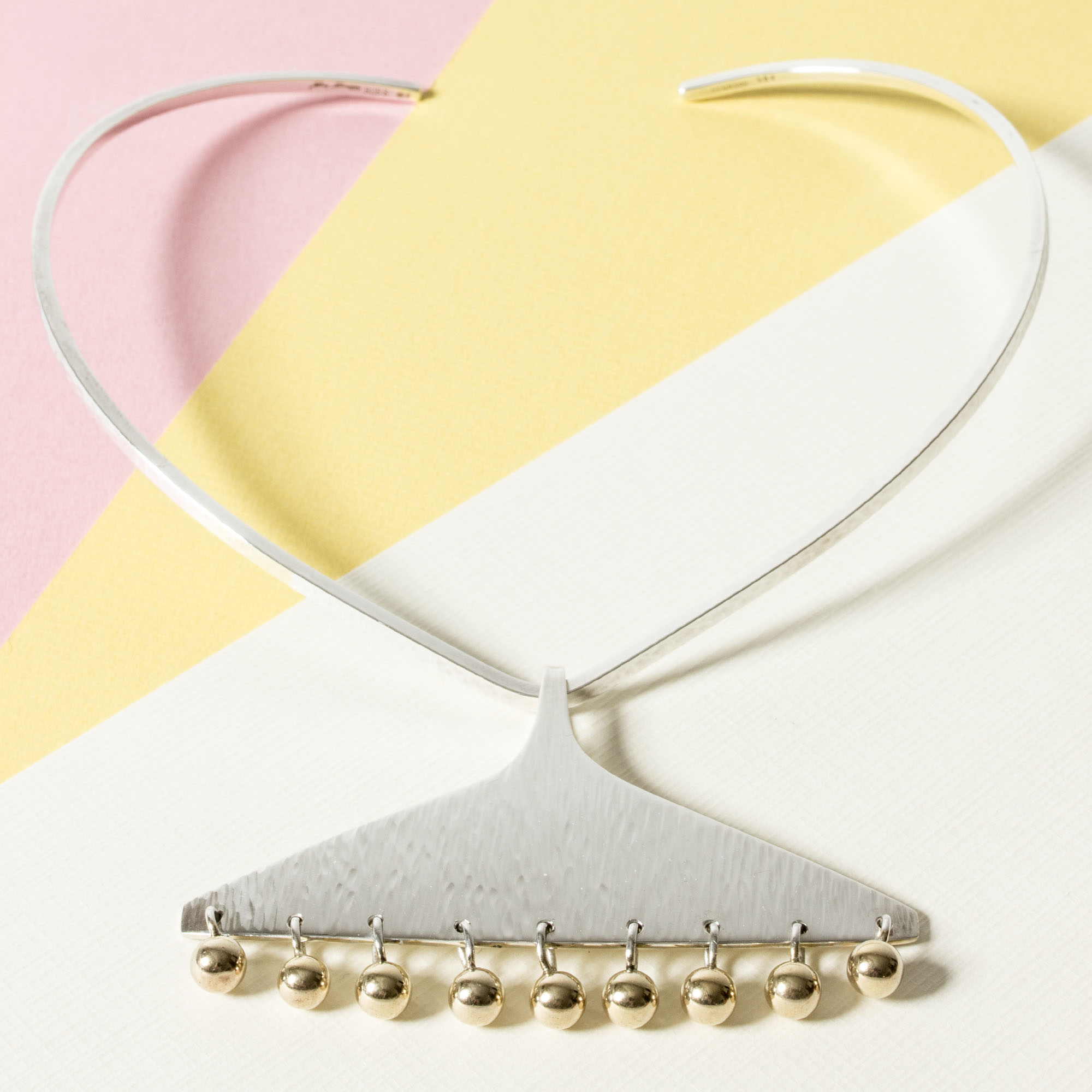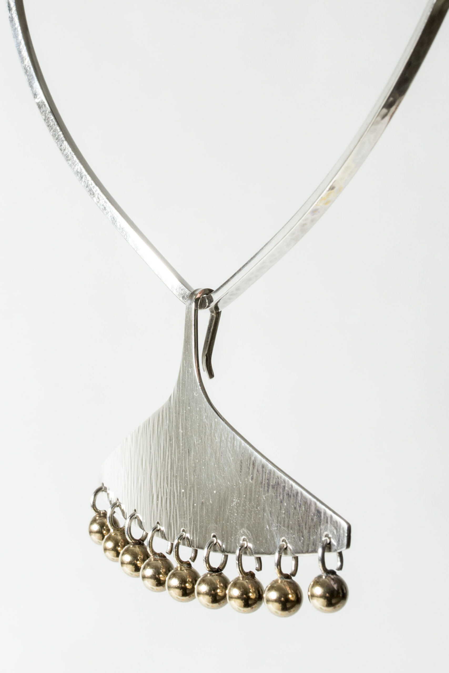 Silver necking by Bent Gabrielsen Pedersen, in a bold design with a pendant with a structured surface that has a watery effect. Adorned with a fringe of kinetic gilded balls.