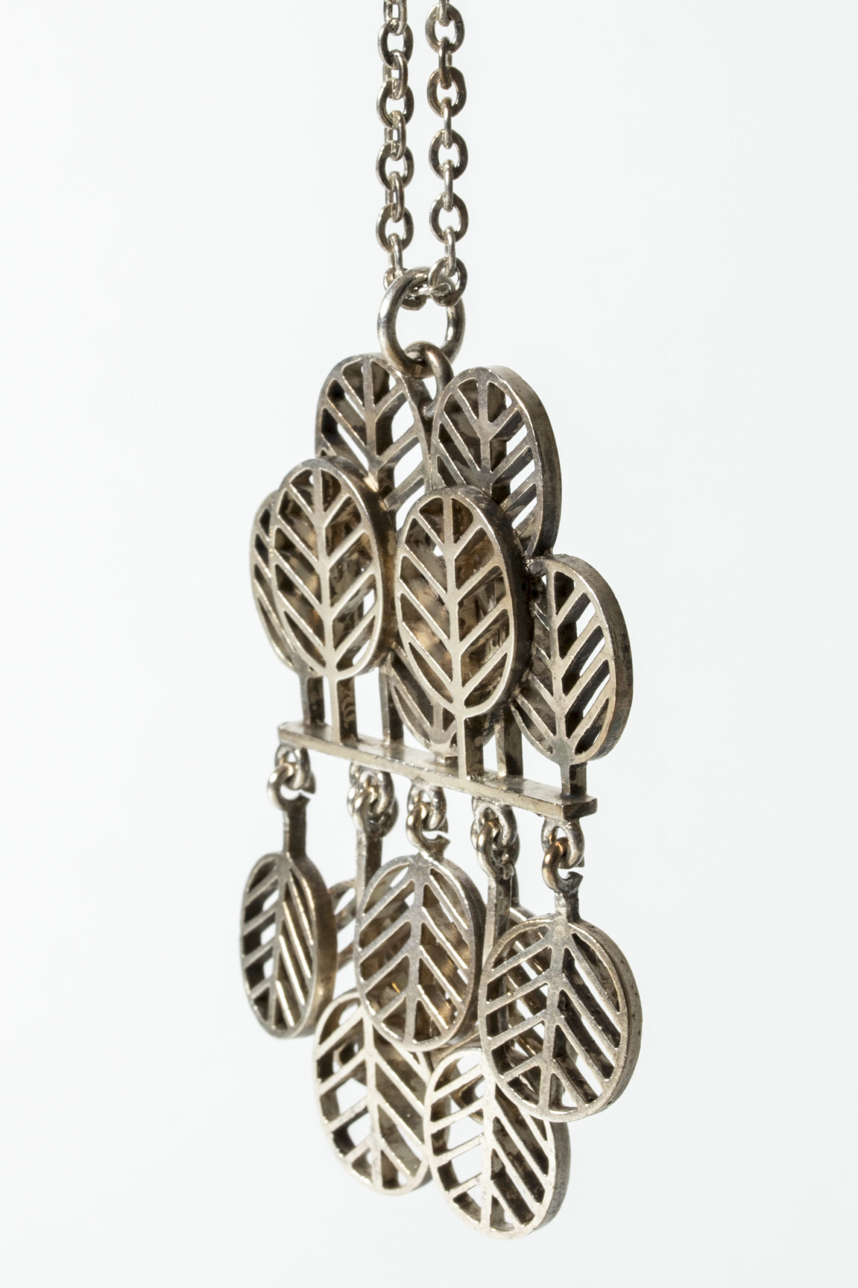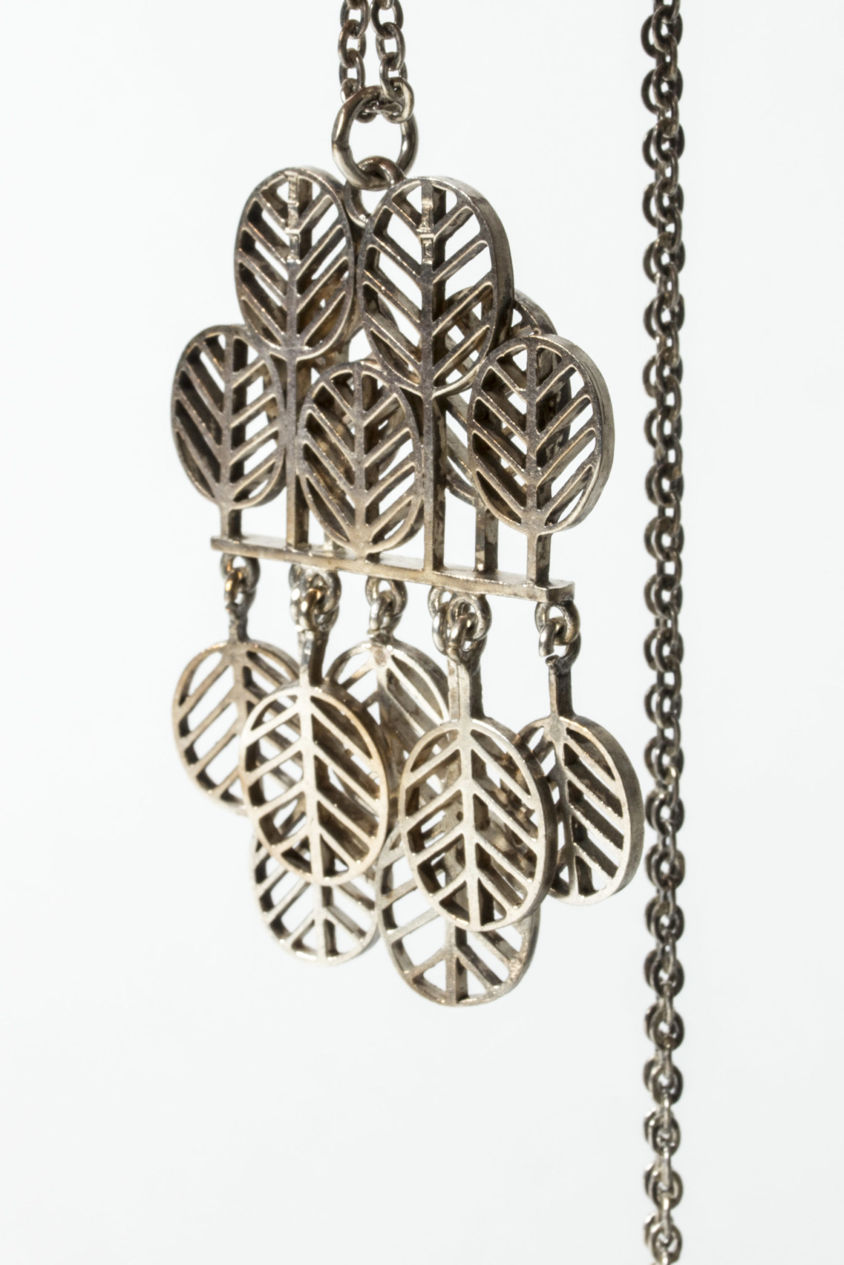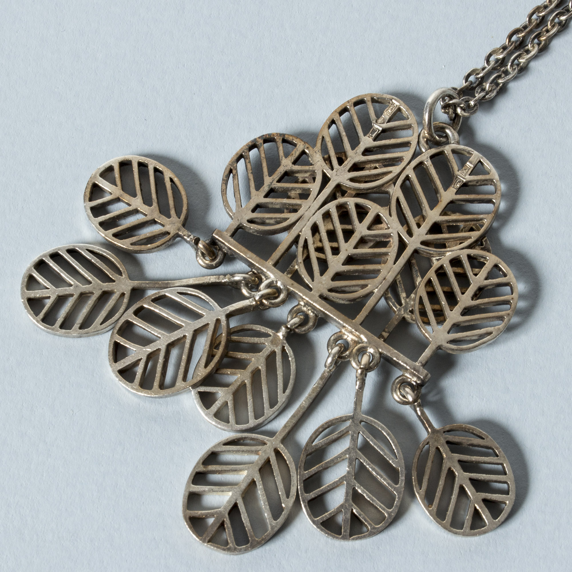 Striking, kinetic silver pendant by Jorma Laine, in a design of stylized leaves. Nice movement in the loosely hanging, downward turned leaves.