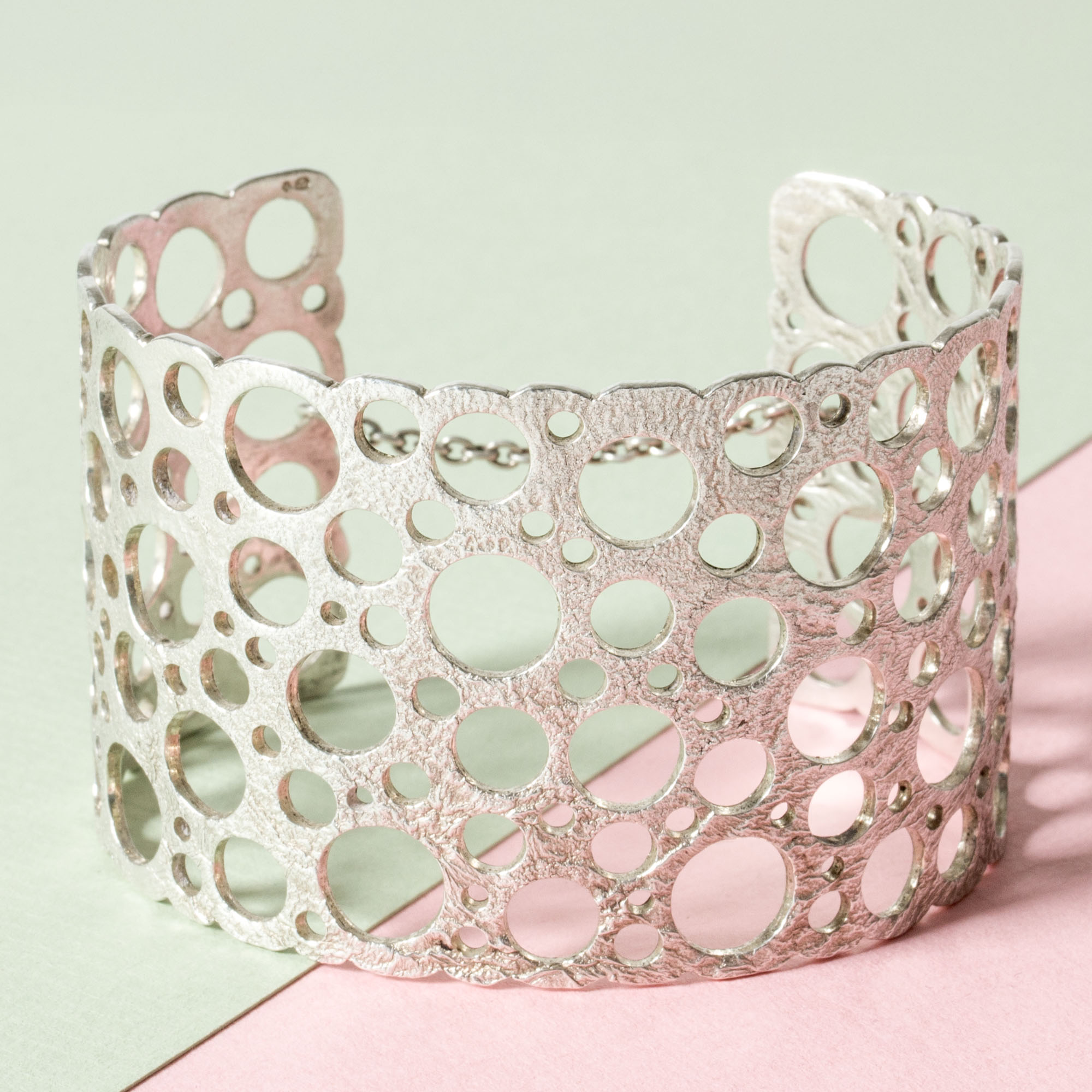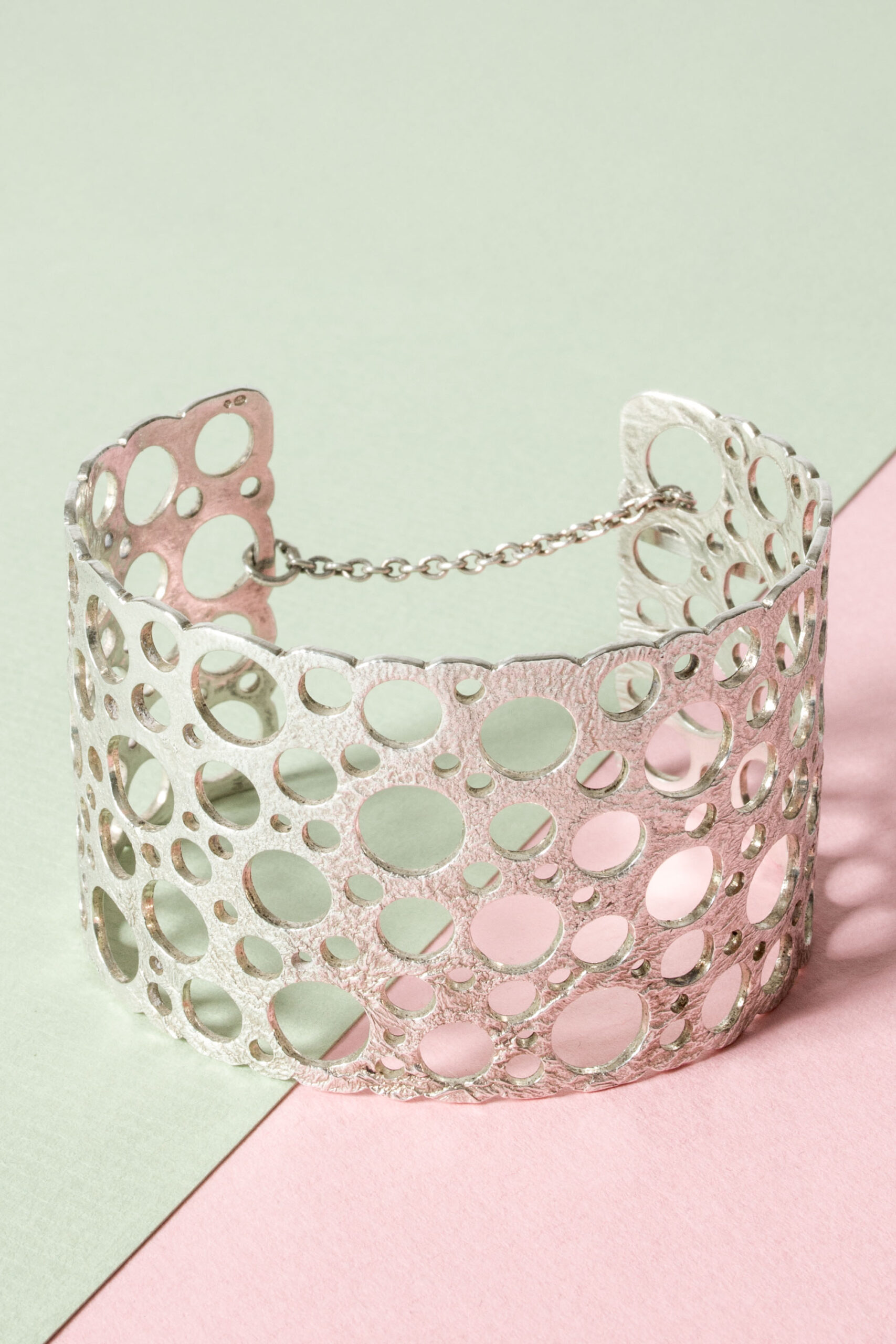 Amazing silver “Pitsi” bracelet by Liisa Vitali, “Pitsi” means lace. Slightly structured surface. Airy, playful design that looks great on the arm. Neat security chain on the back.