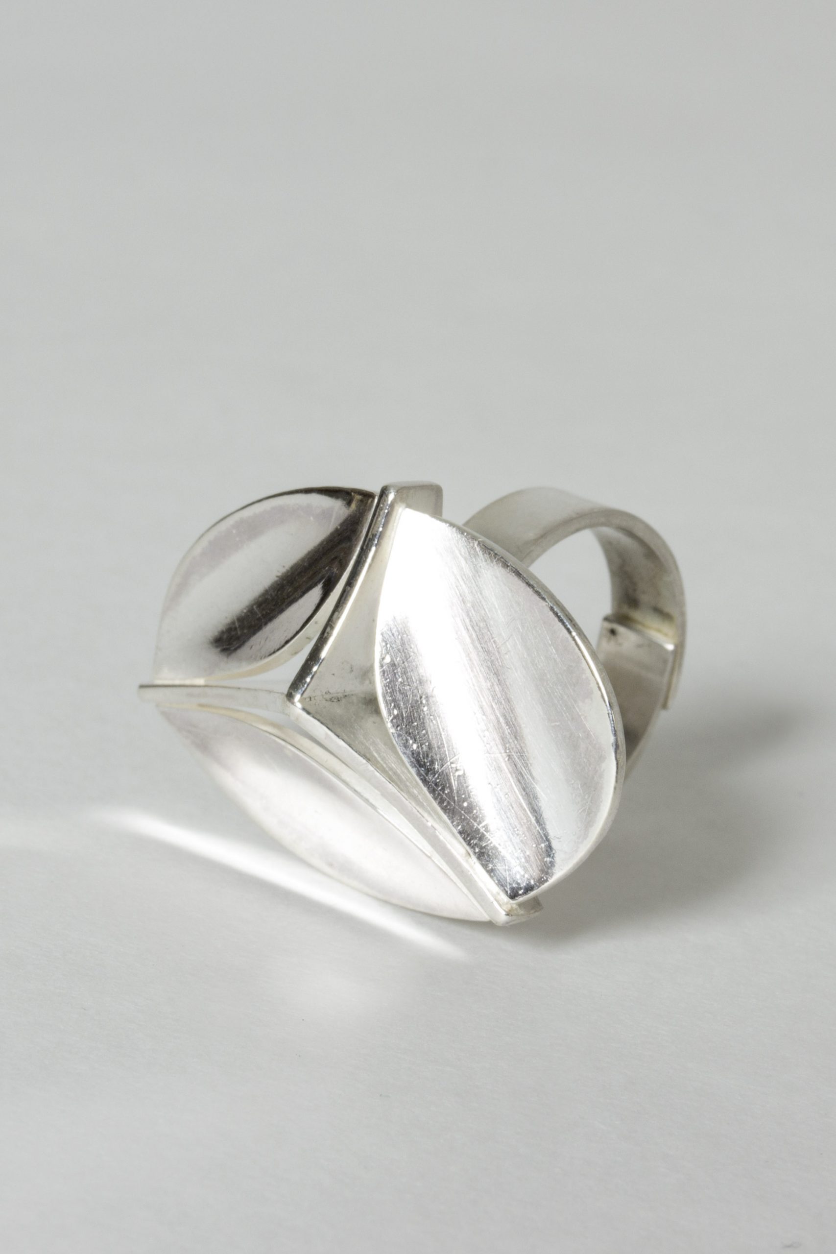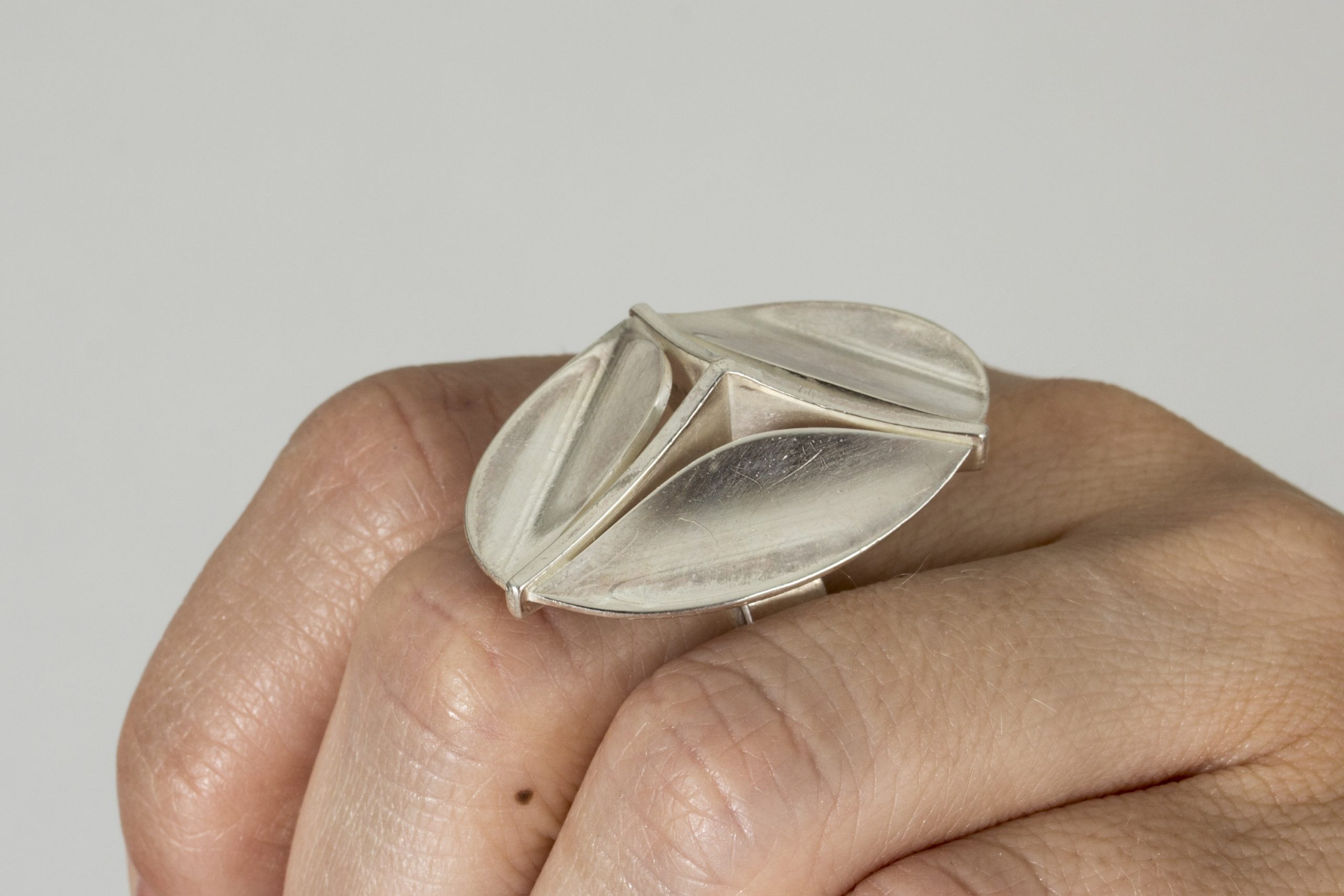 Cool silver ring by Elis Kauppi, with three leaf-like forms coming together in a large oval. Sleek and very modernist.