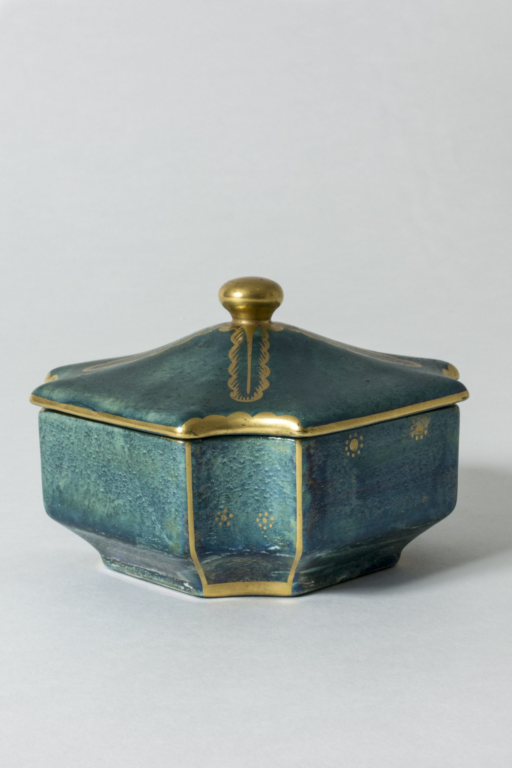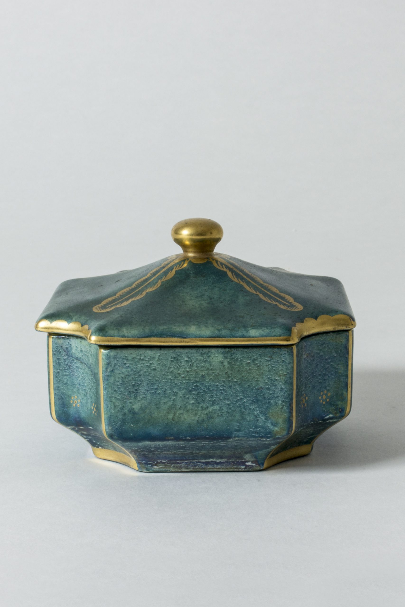 Beautiful art nouveau stoneware box by Josef Ekberg, glazed in an oxidized copper green color that has a bit of metallic sheen. Gold decor in the form of leaves and flowers. Very decorative.