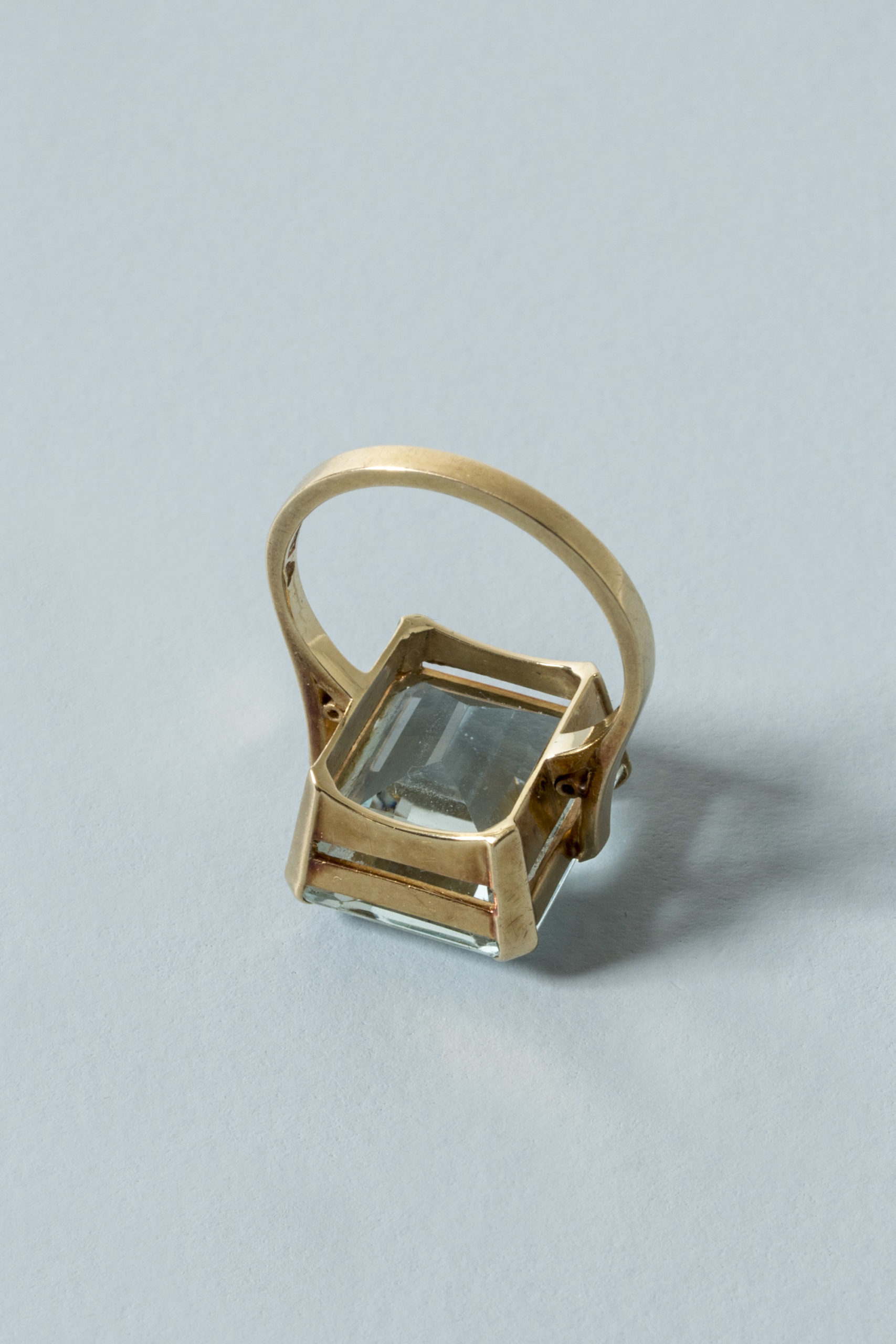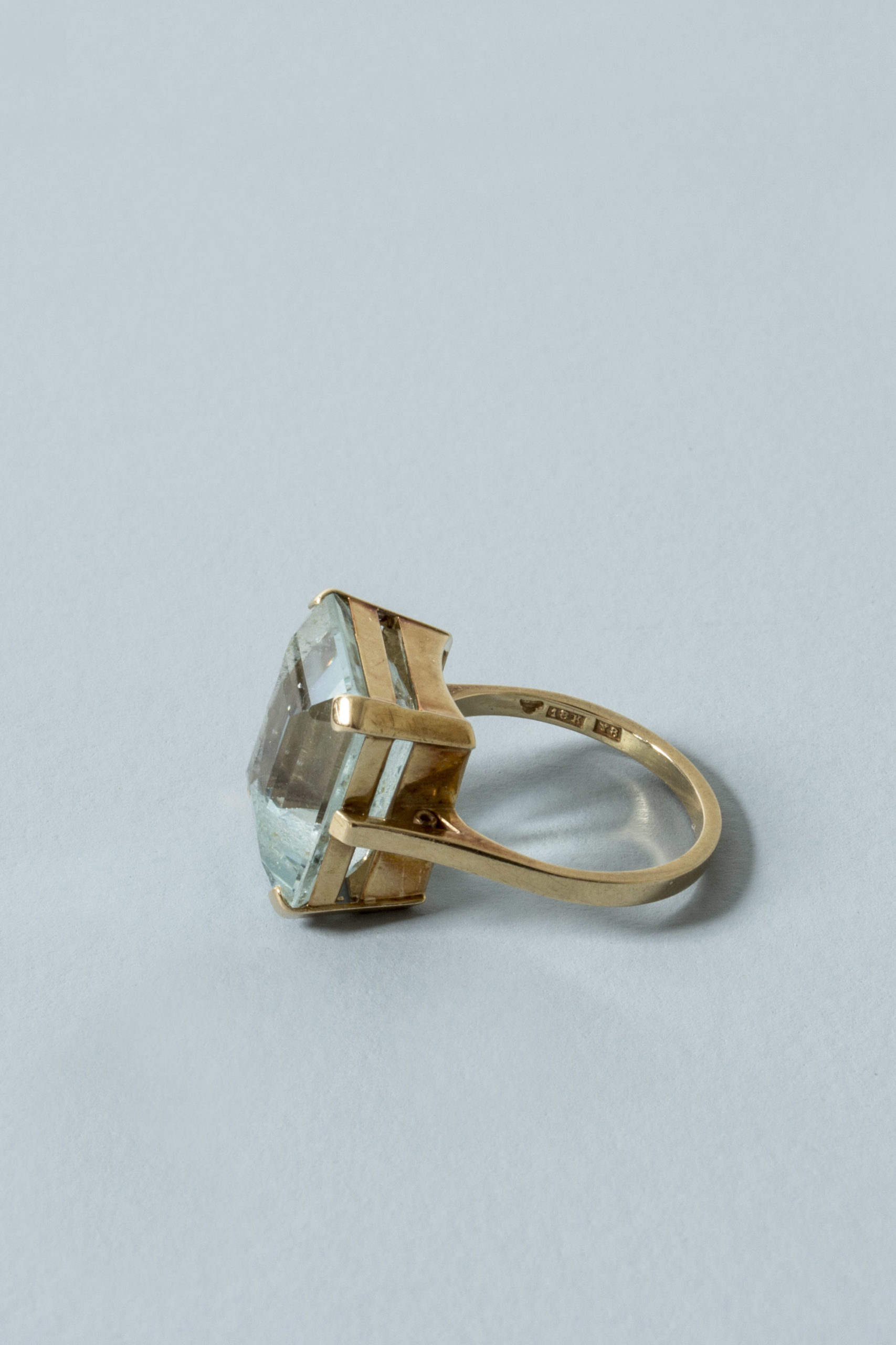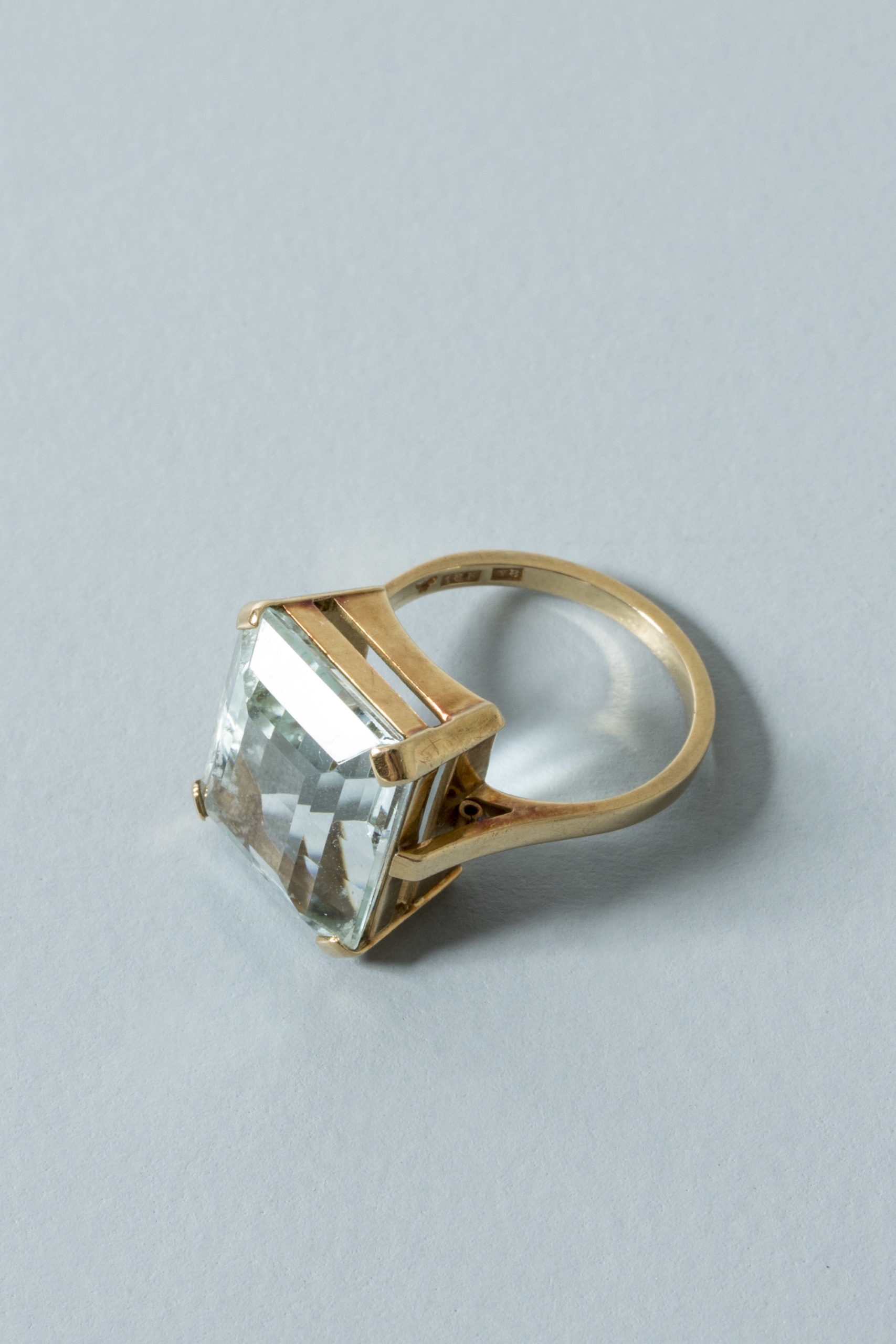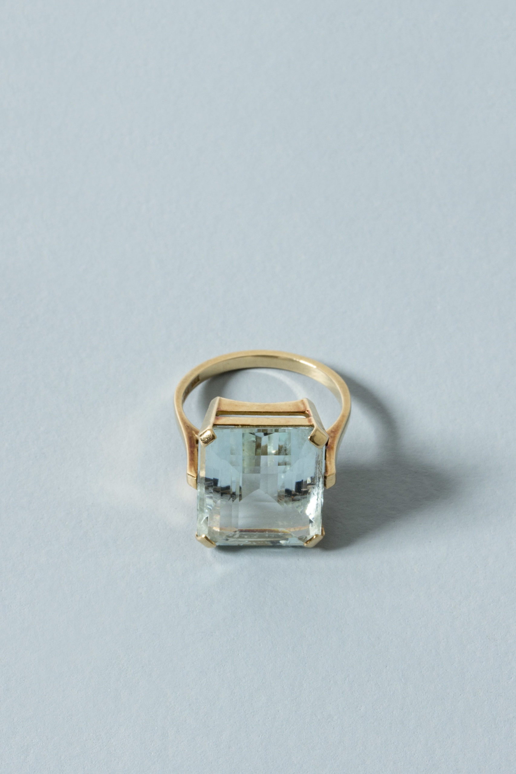 Elegant Swedish midcentury gold ring, with a beautiful, clear cut aquamarine stone. Crisp, timeless design. Made from 18 k gold.